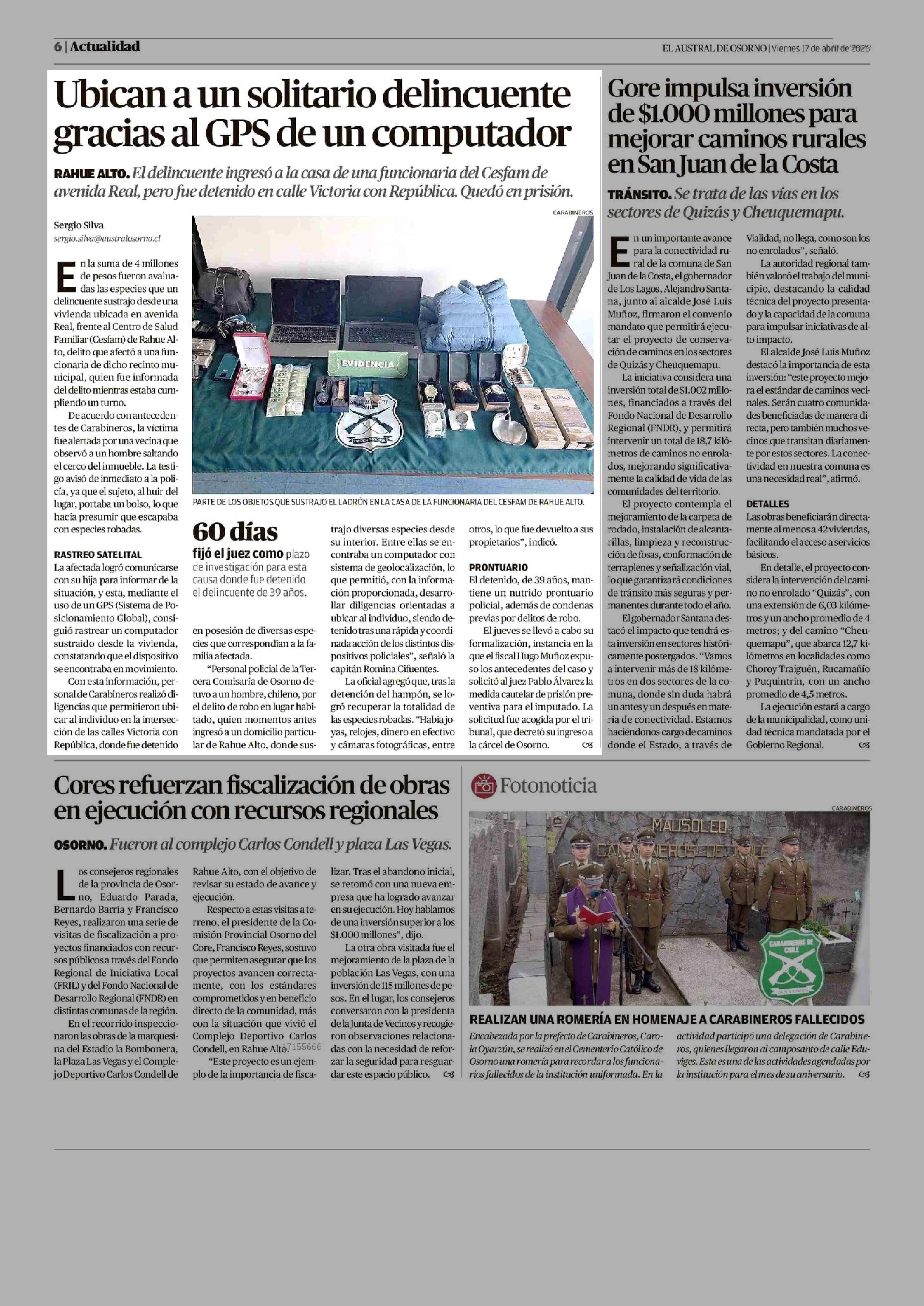 Ubican a un solitario delincuente gracias al GPS de un computador 17-04-2026 El Austral de Osorno |