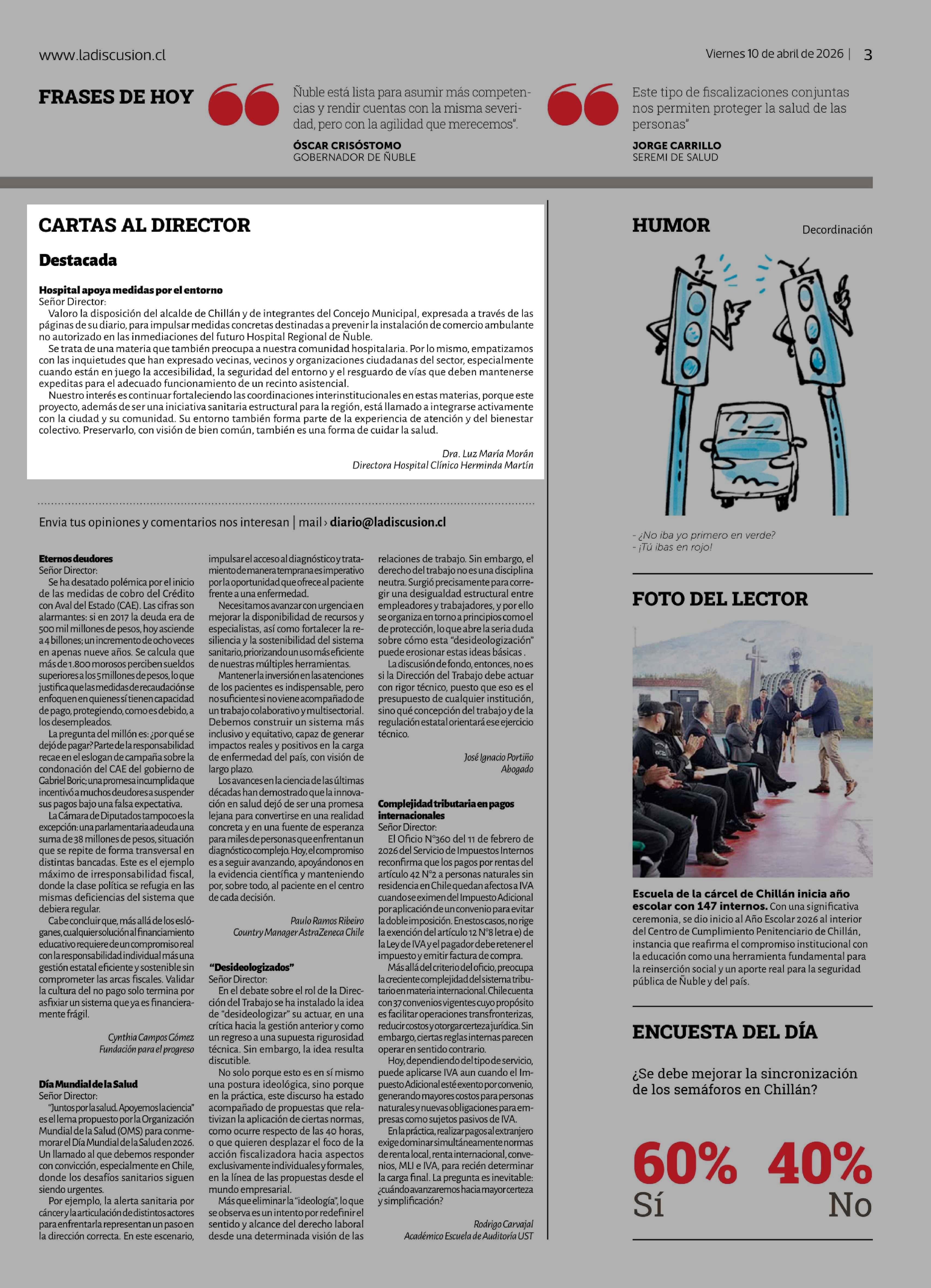 Cartas: Hospital apoya medidas por el entorno 10-04-2026 La Discusión |