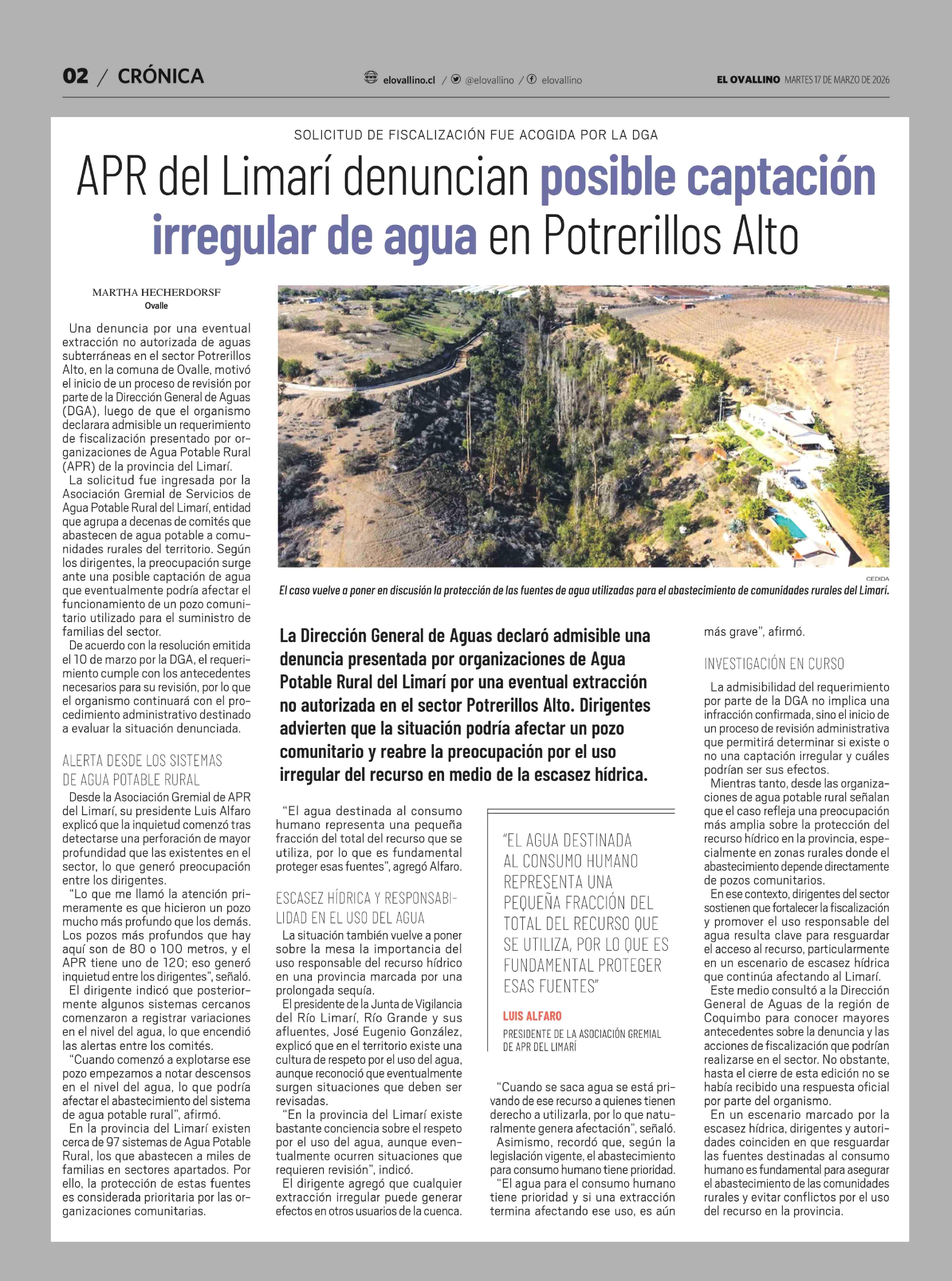 APR del Limarí denuncian posible captación irregular de agua en Potrerillos Alto 17-03-2026 El Ovallino |