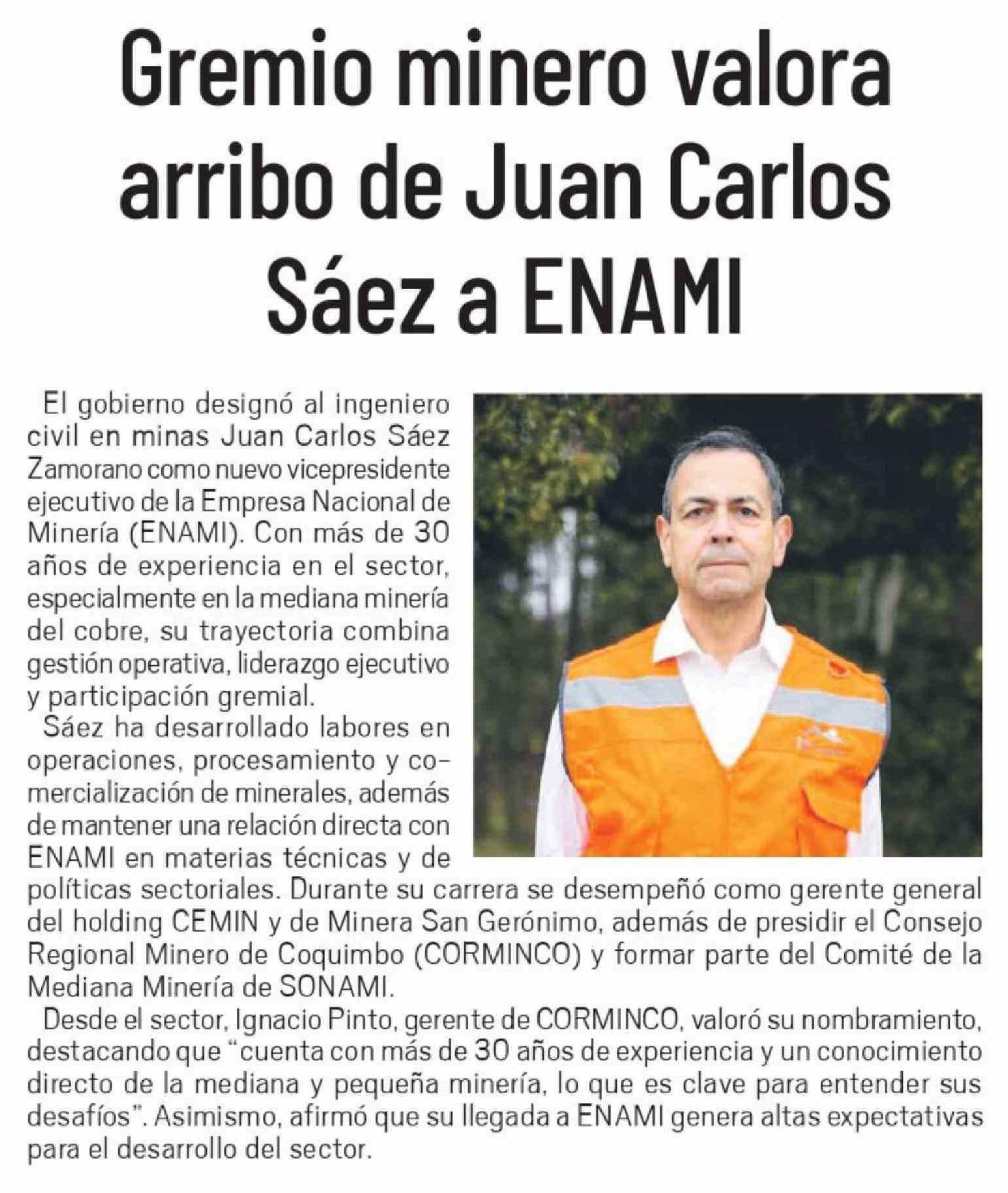 Título: Gremio minero valora arribo de Juan Carlos Sáez a ENAMI