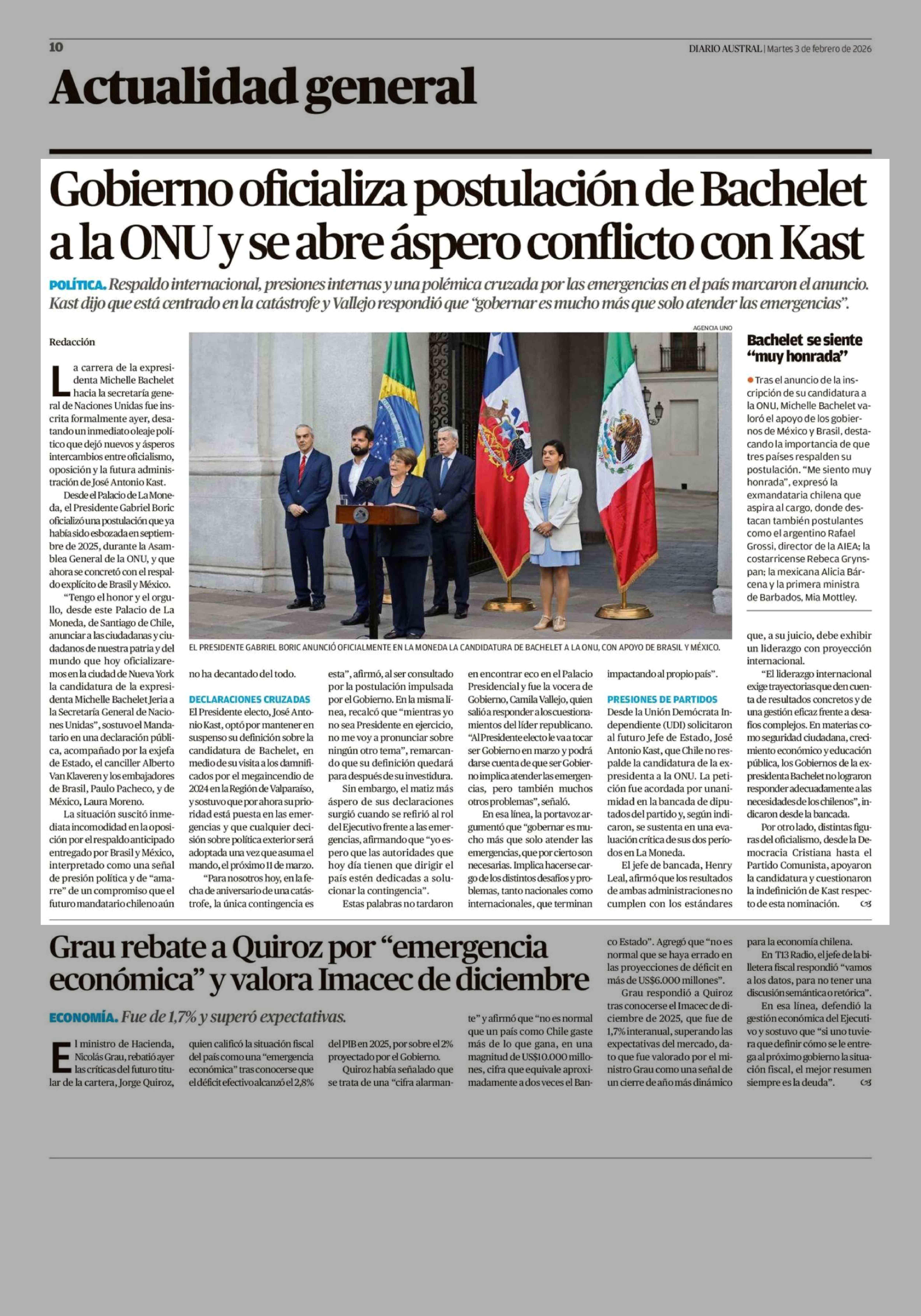 Título: Gobierno oficializa postulación de Bachelet a la ONU y se abre áspero conflicto con Kast