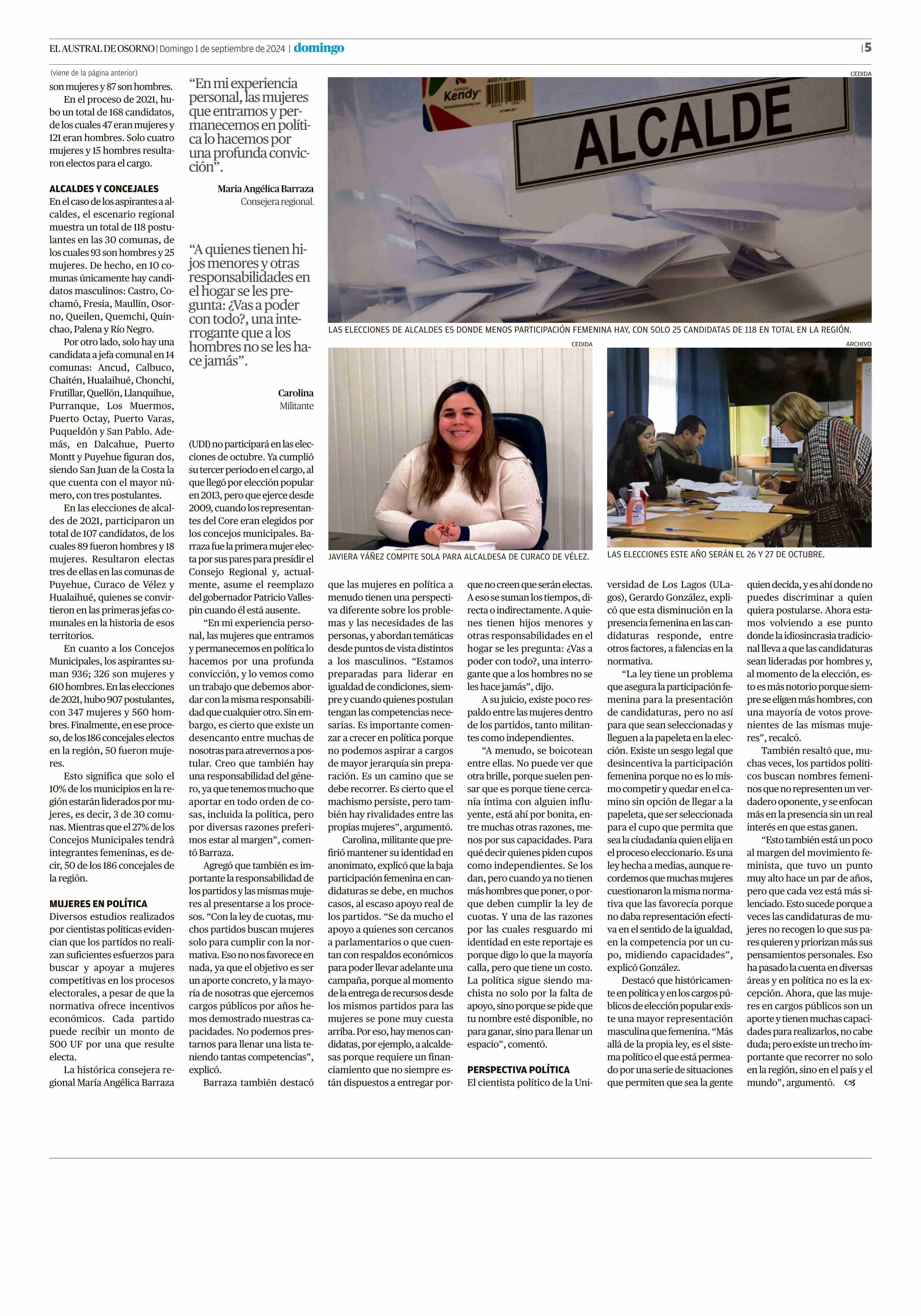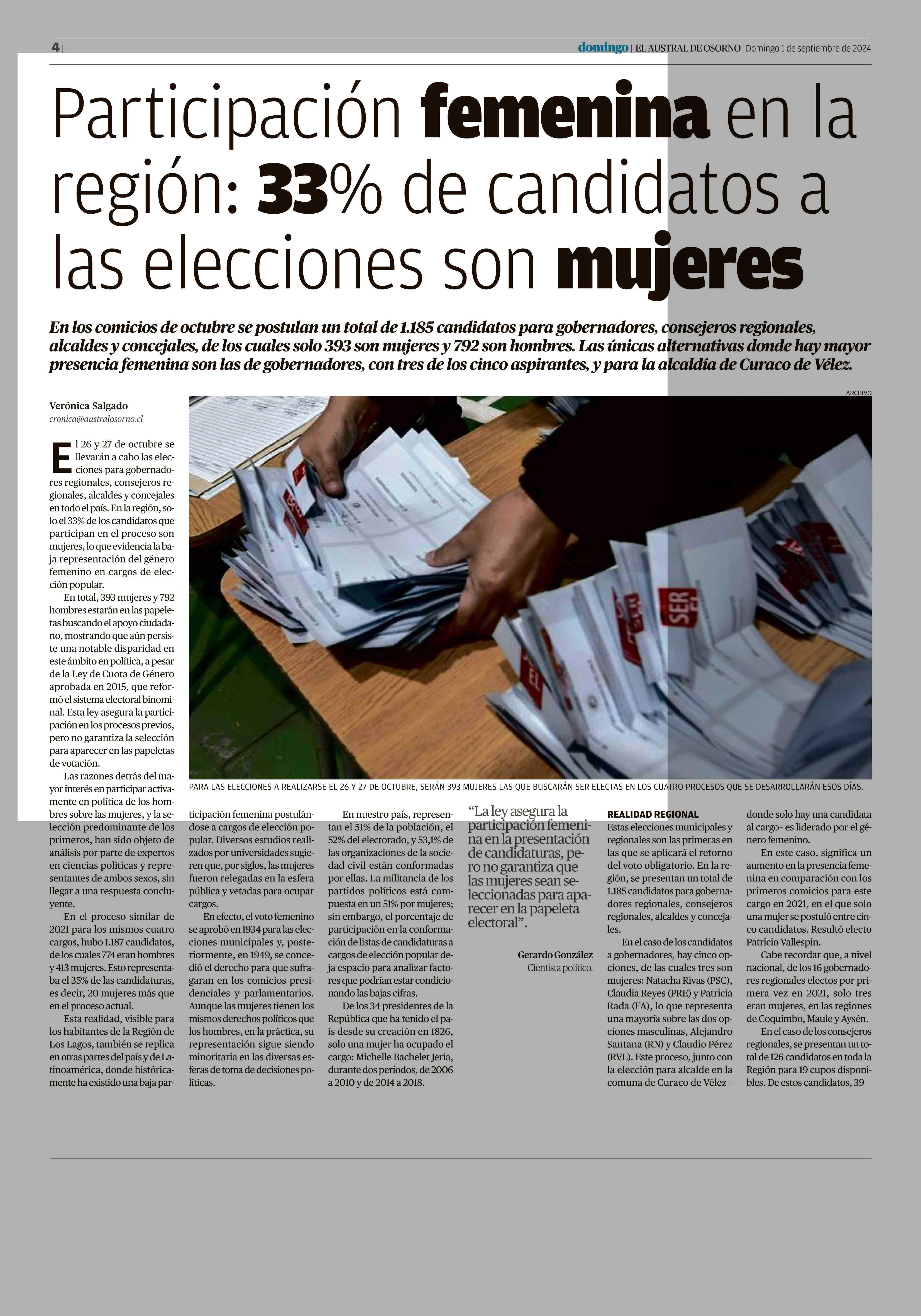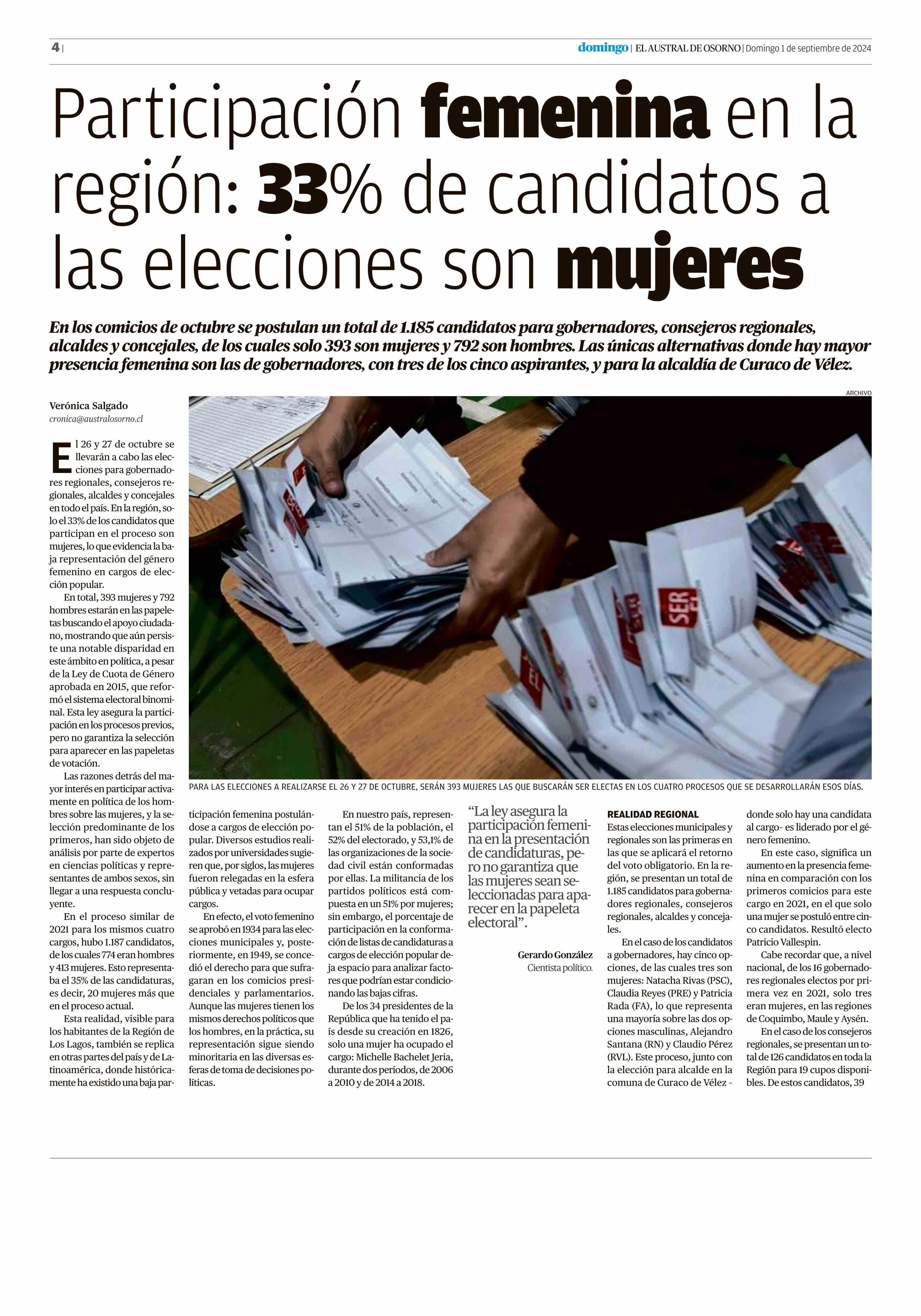 Participación femenina en la región: 33% de candidatos a las elecciones son mujeres 01-09-2024 El Austral de Osorno |