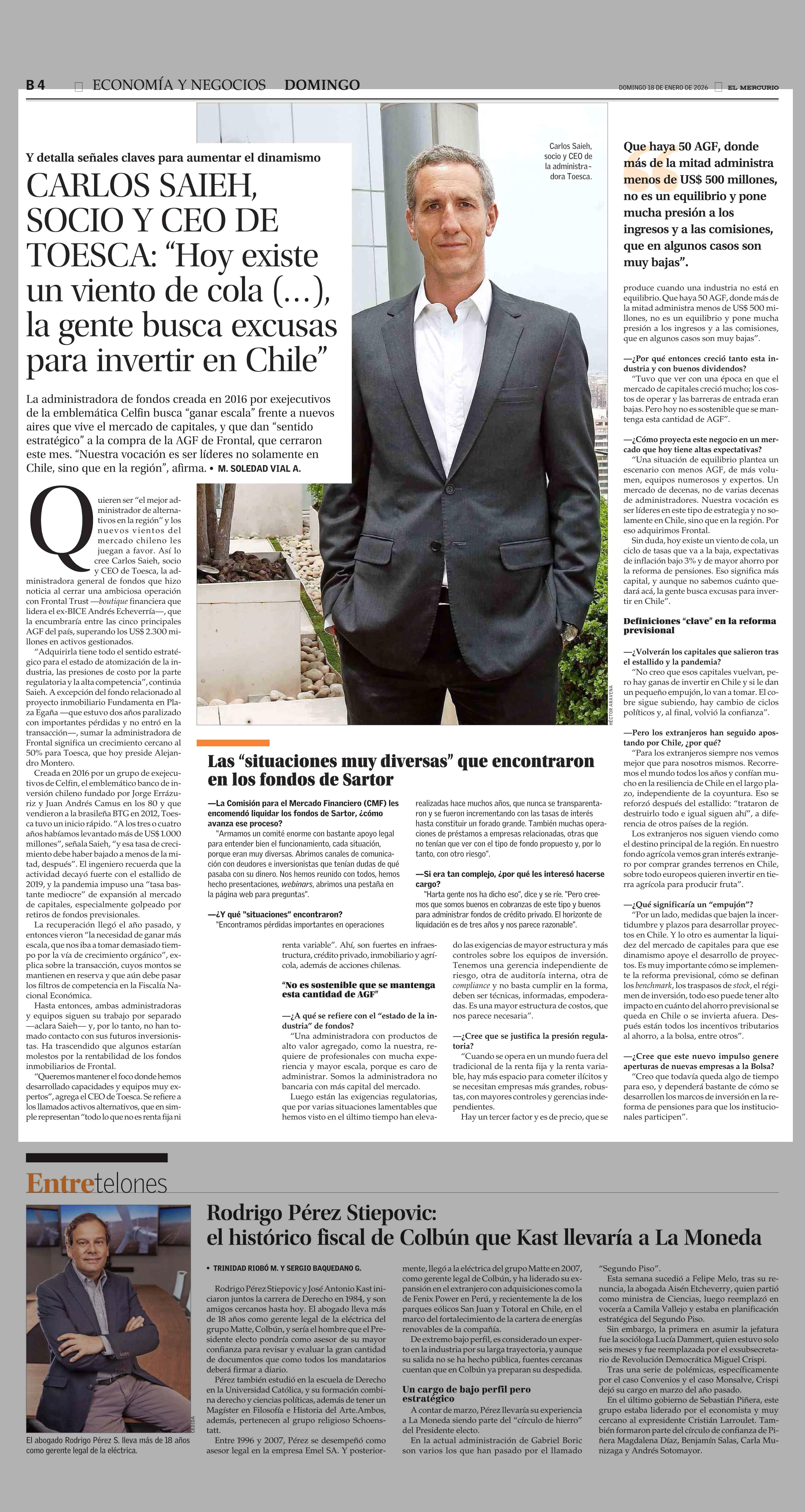 Título: CARLOS SAIEH, SOCIO Y CEO DE TOESCA: “Hoy existe un viento de cola (…), la gente busca excusas para invertir en Chile”