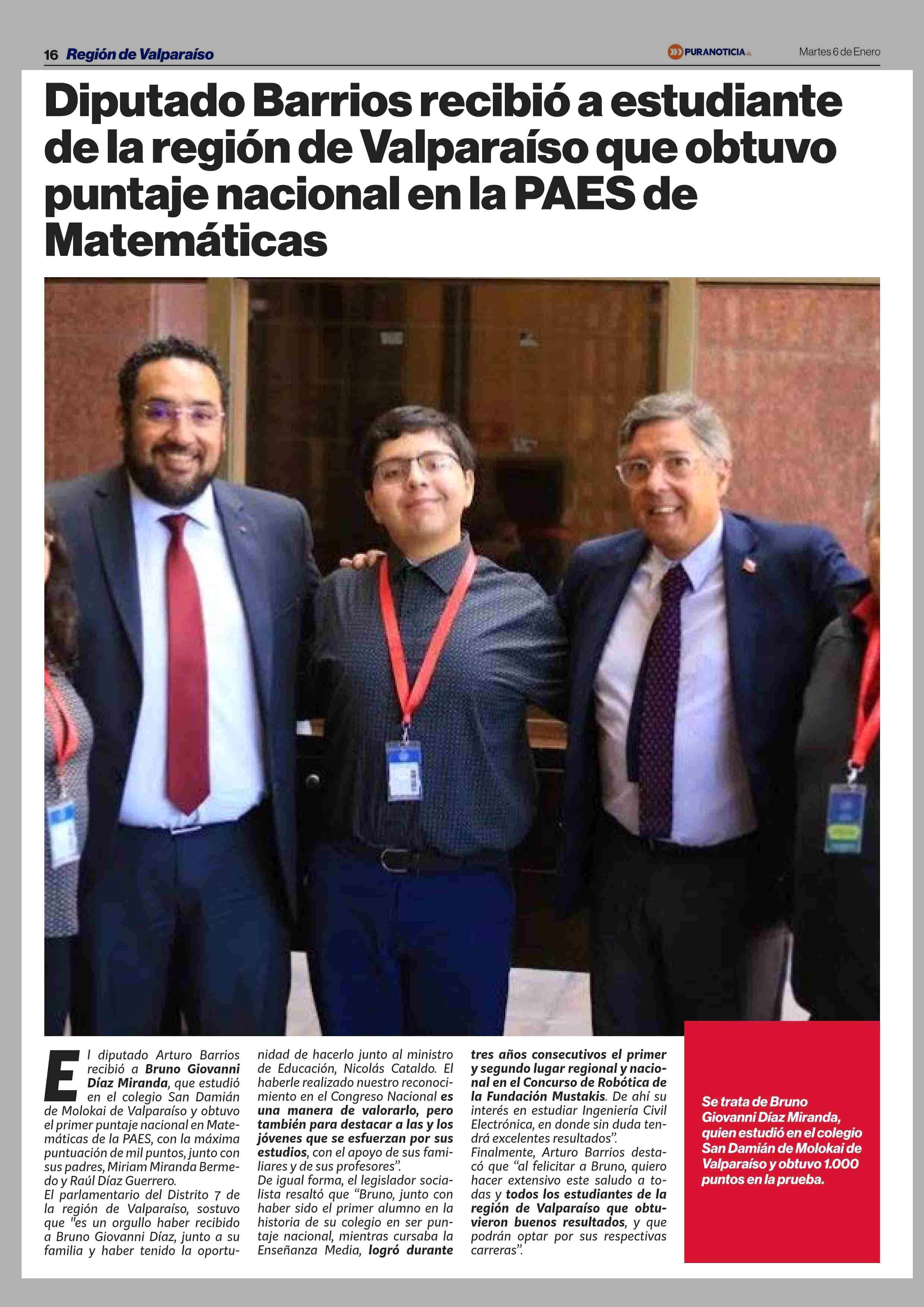 Diputado Barrios recibió a estudiante de la región de Valparaíso que obtuvo puntaje nacional en la PAES de Matemáticas 06-01-2026 Puranoticia.cl |