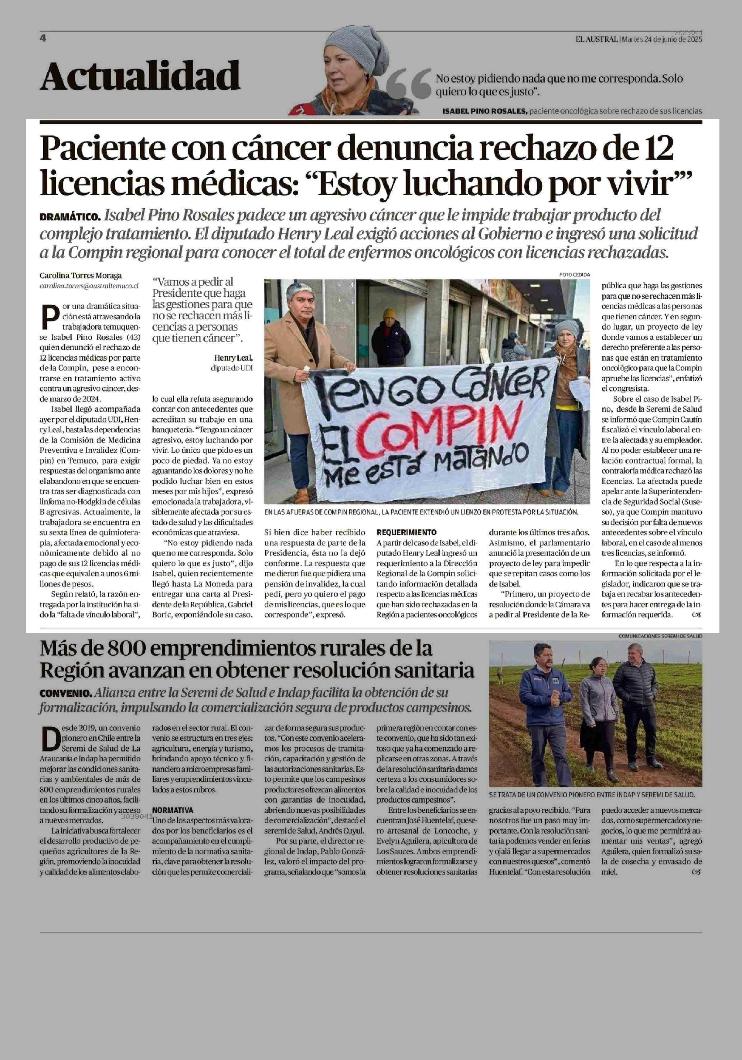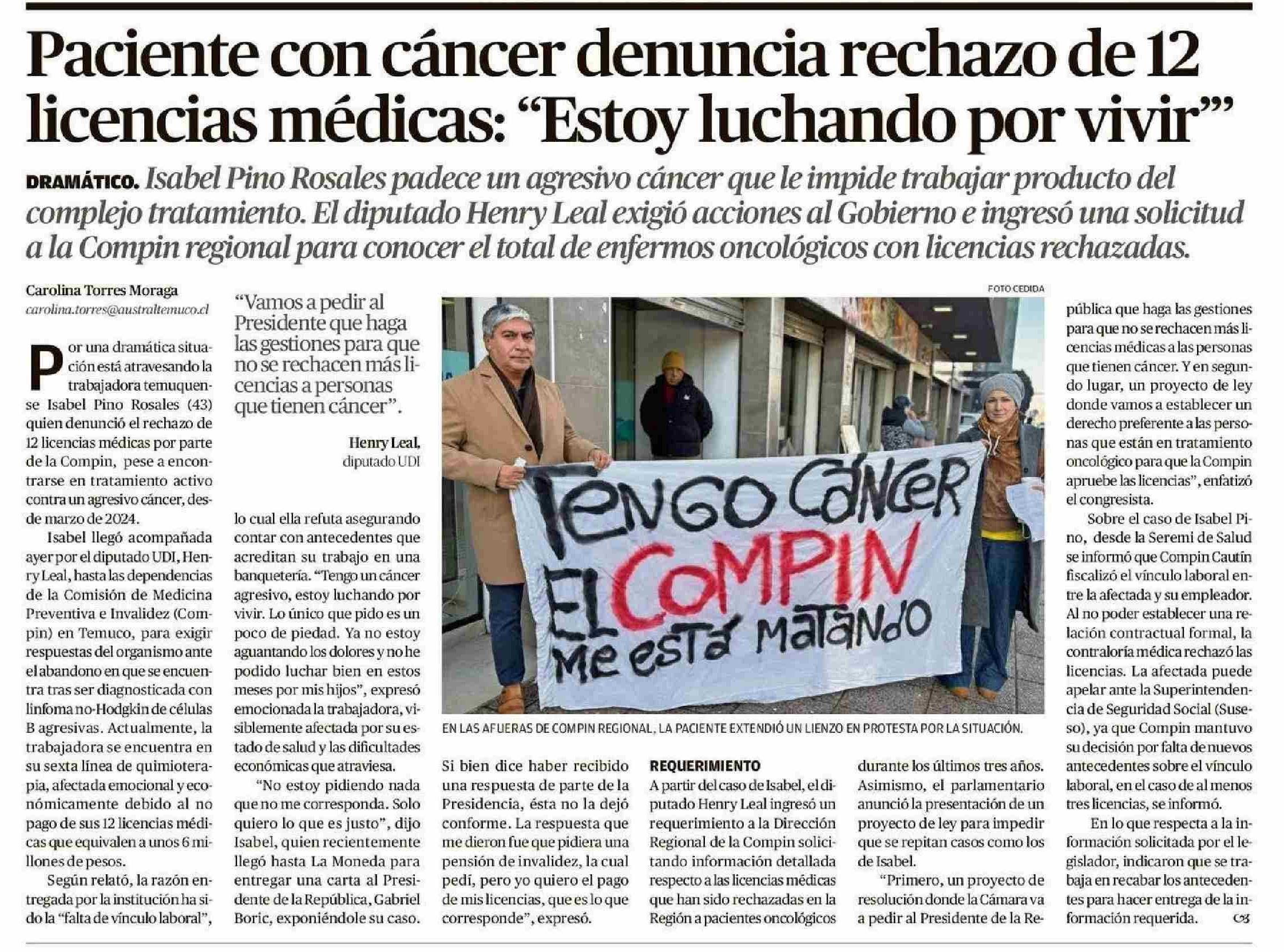 Paciente con cáncer denuncia rechazo de 12 licencias médicas: "Estoy luchando por vivir" 24-06-2025 El Austral de la Araucanía |