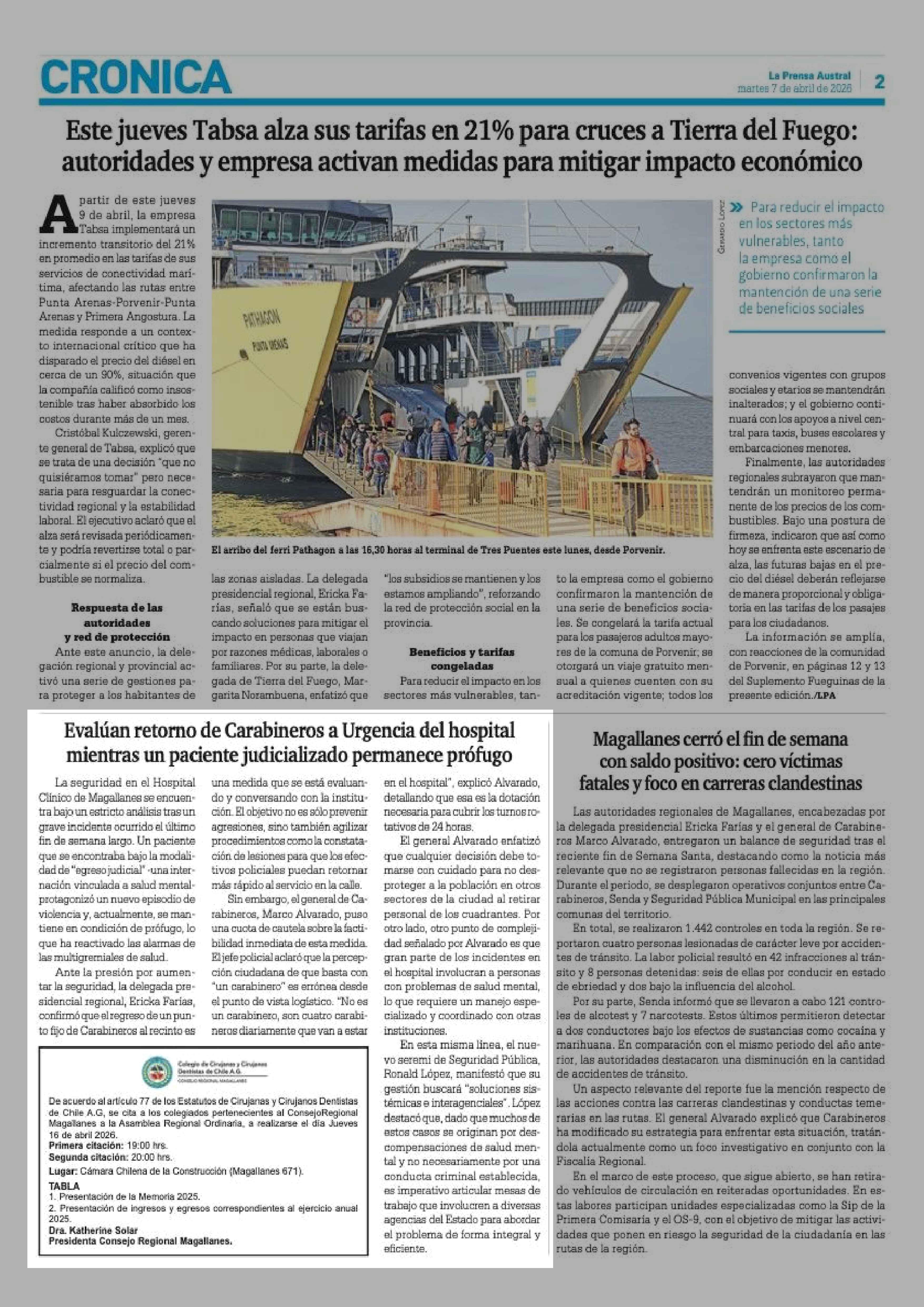 | Fecha: | 07-04-2026 | Sector: | Noticia general | Región: | Región de Magallanes y de la Antártica Chilena |