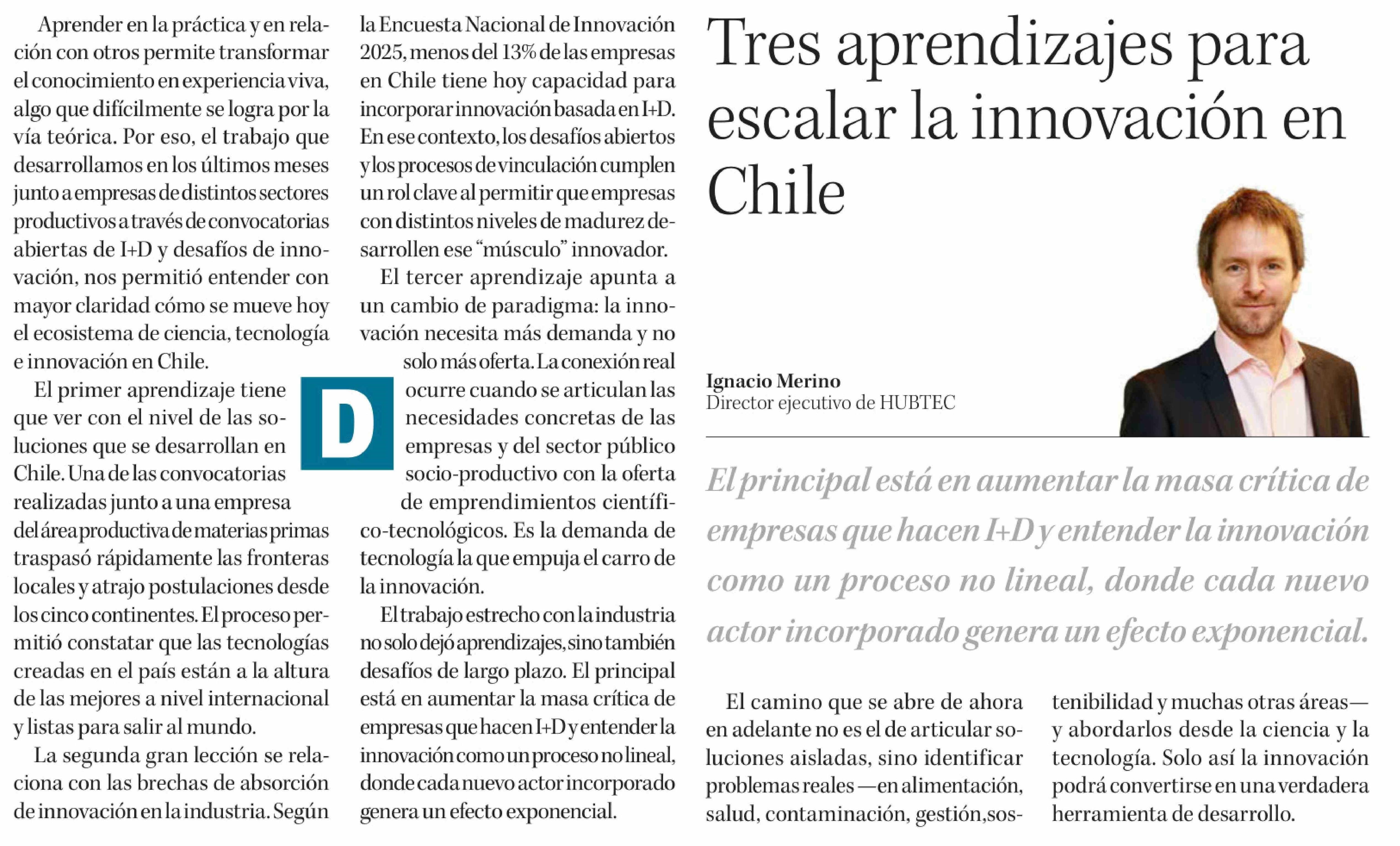| Título: | Columnas de Opinión: Tres aprendizajes para escalar la innovación en Chile |
