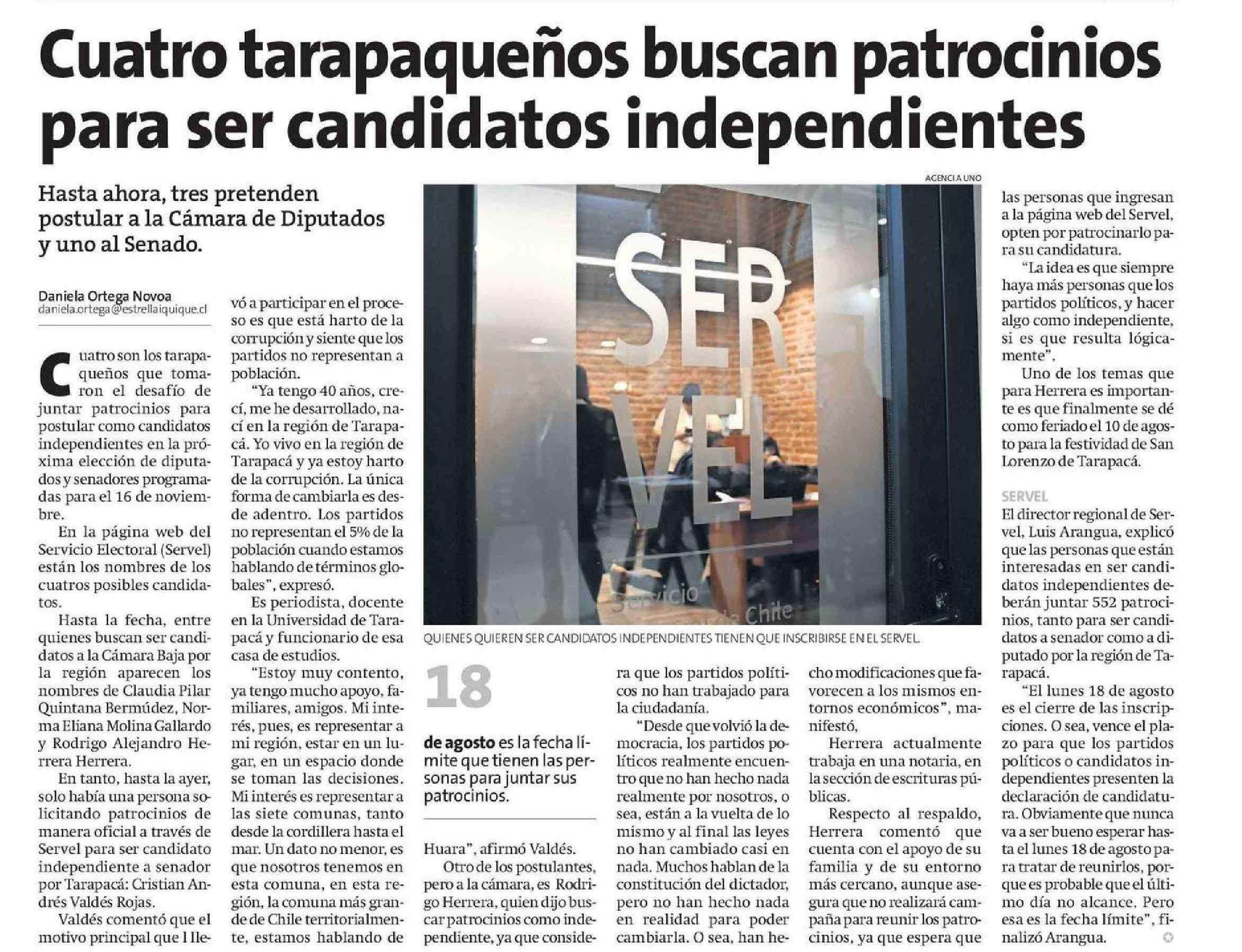 Cuatro tarapaqueños buscan patrocinios para ser candidatos independientes 07-04-2025 La Estrella de Iquique |