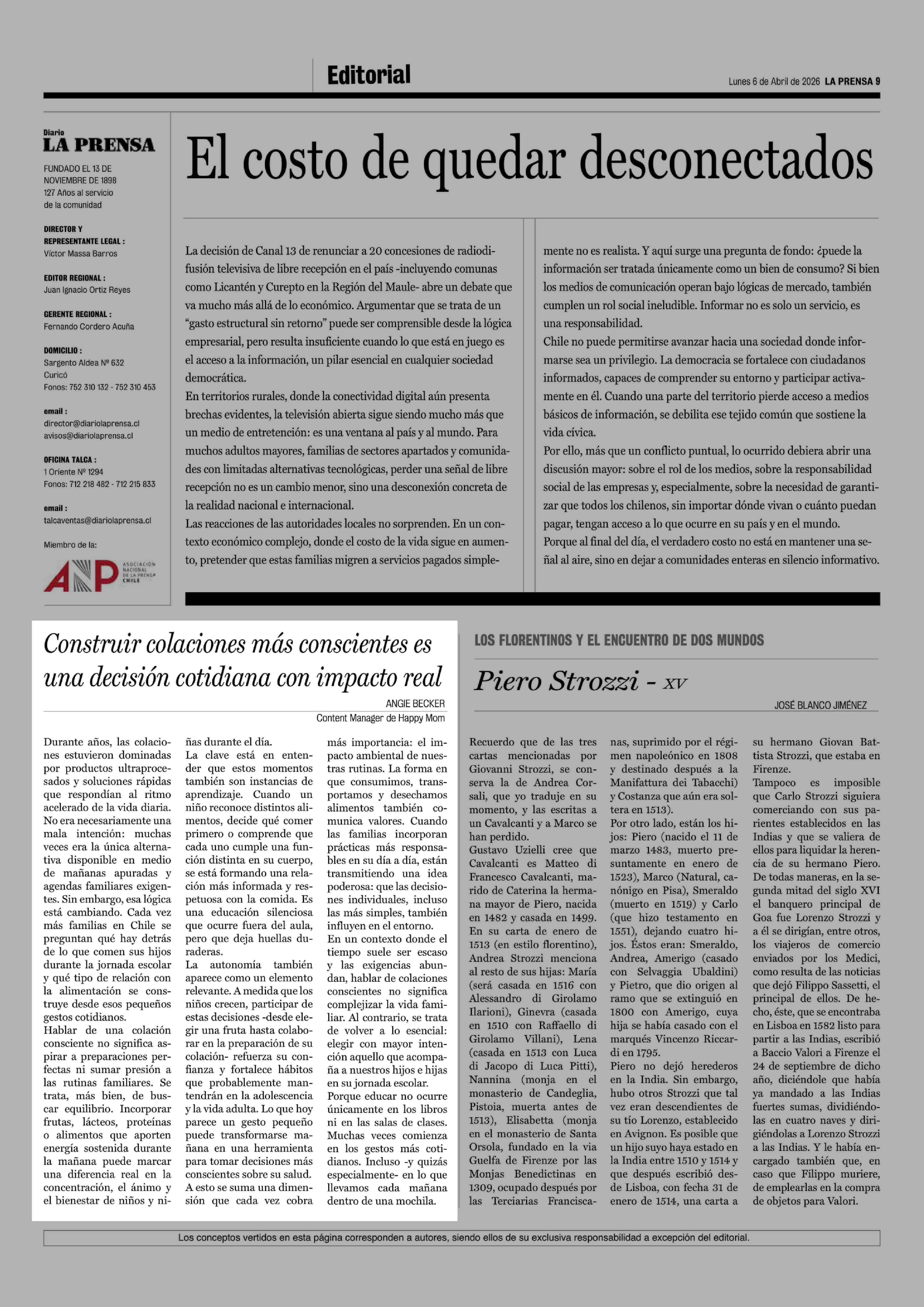 Cartas: Construir colaciones más conscientes es una decisión cotidiana con impacto real 06-04-2026 La Prensa de Curicó |