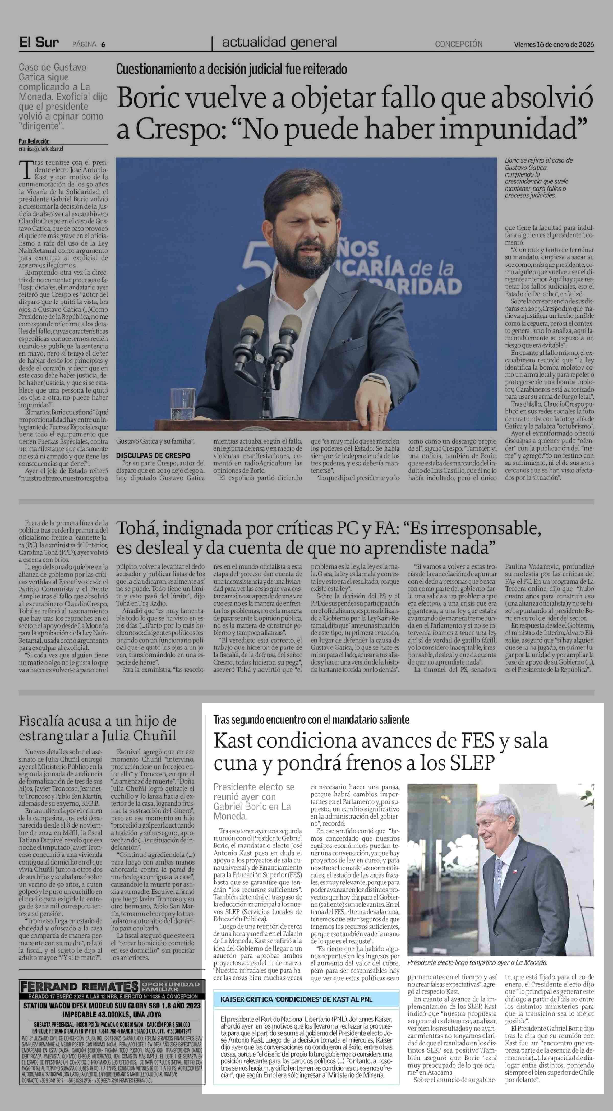 Kast condiciona avances de FES y sala cuna y pondrá frenos a los SLEP 16-01-2026 El Sur |