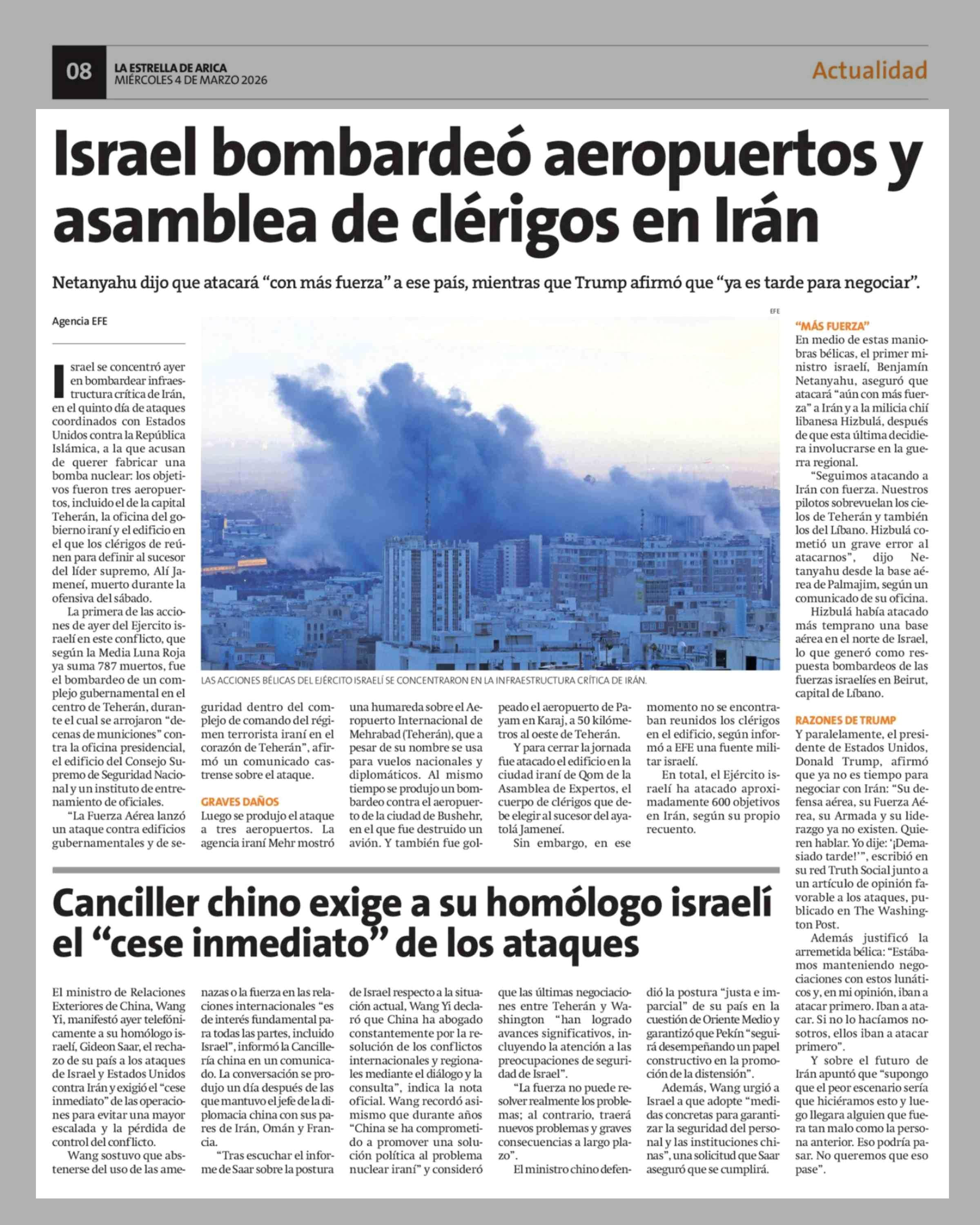 Israel bombardeo aeropuertos y asamblea de clérigos en Irán 04-03-2026 La Estrella de Arica |