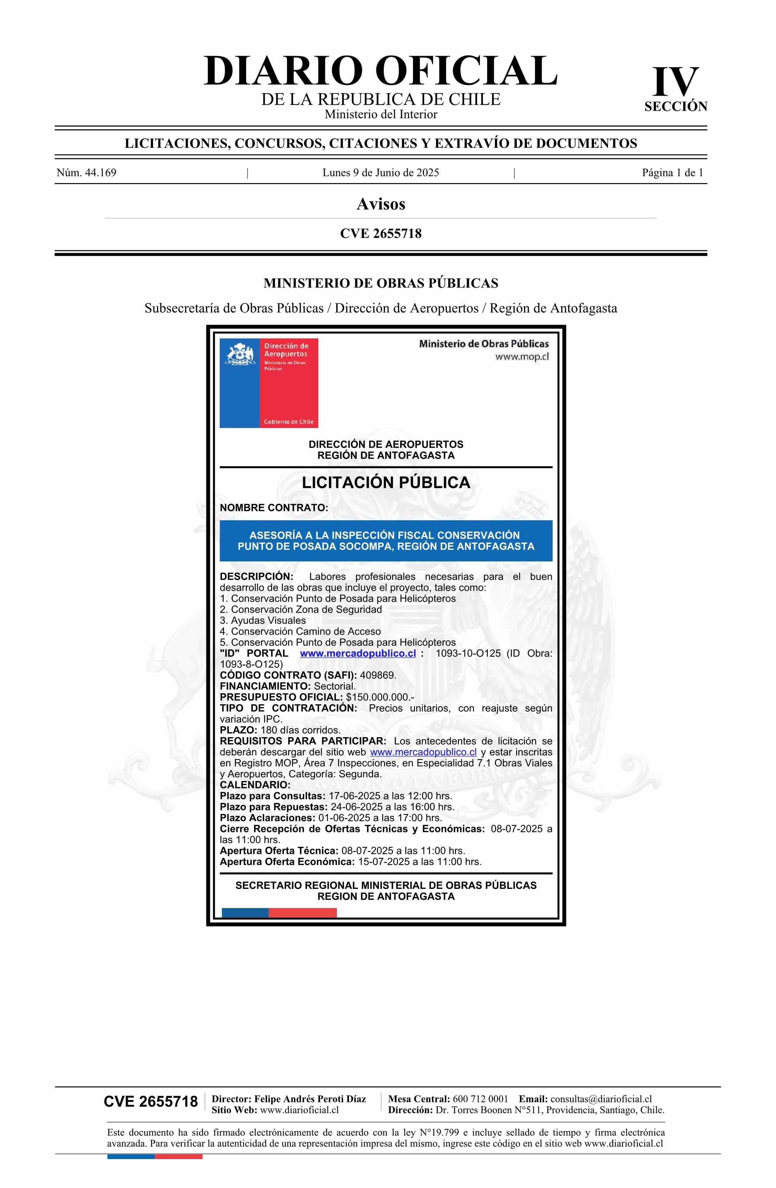 AVISO LICITACIONES: Asesoría a la Inspección Fiscal Conservación Punto de Posada Socompa, Región de Antofagasta 09-06-2025 Diario Oficial Edición Electrónica |