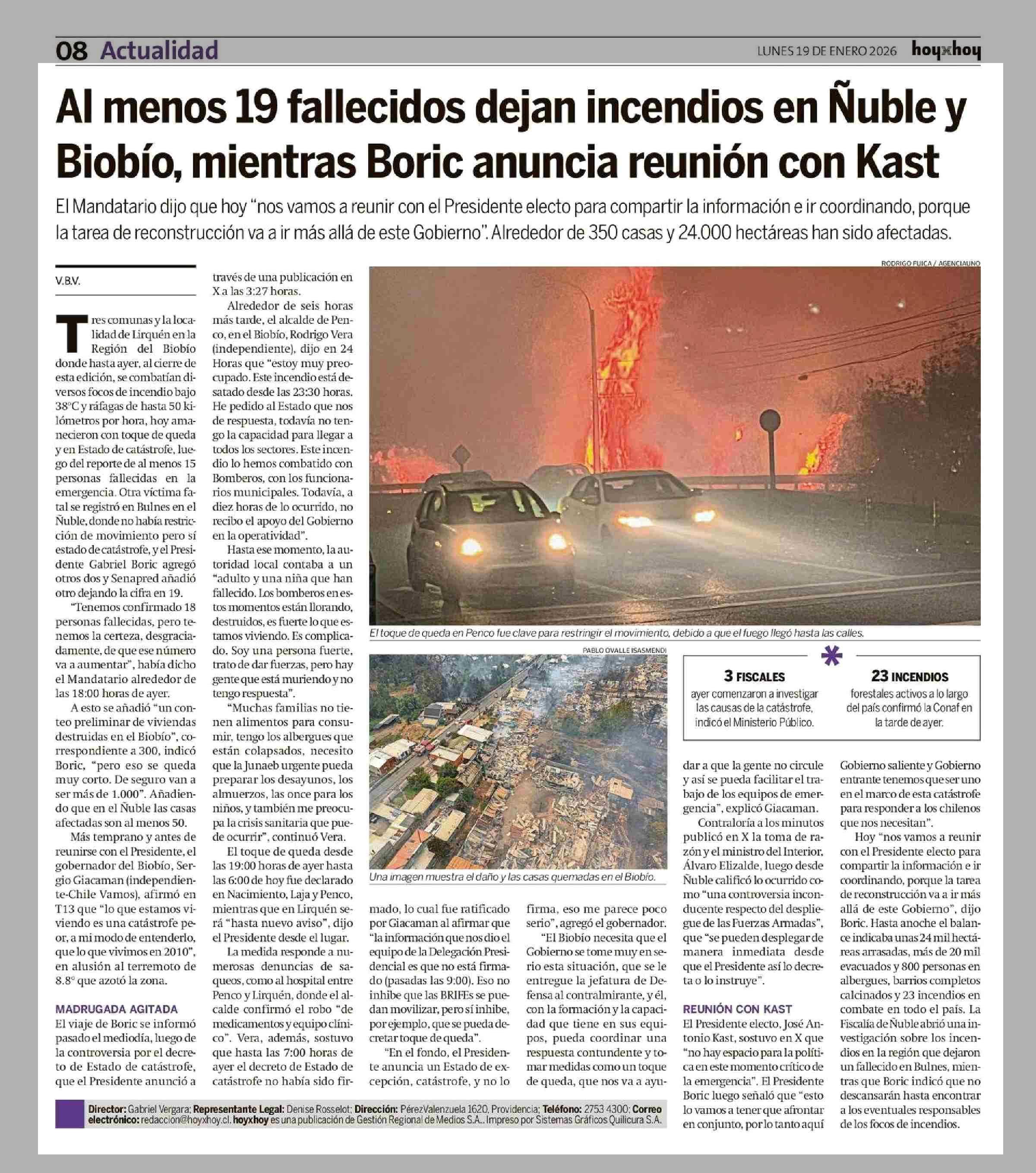 Título: Al menos 19 fallecidos dejan incendios en Ñuble y Biobio, mientras Boric anuncia reunión con Kast