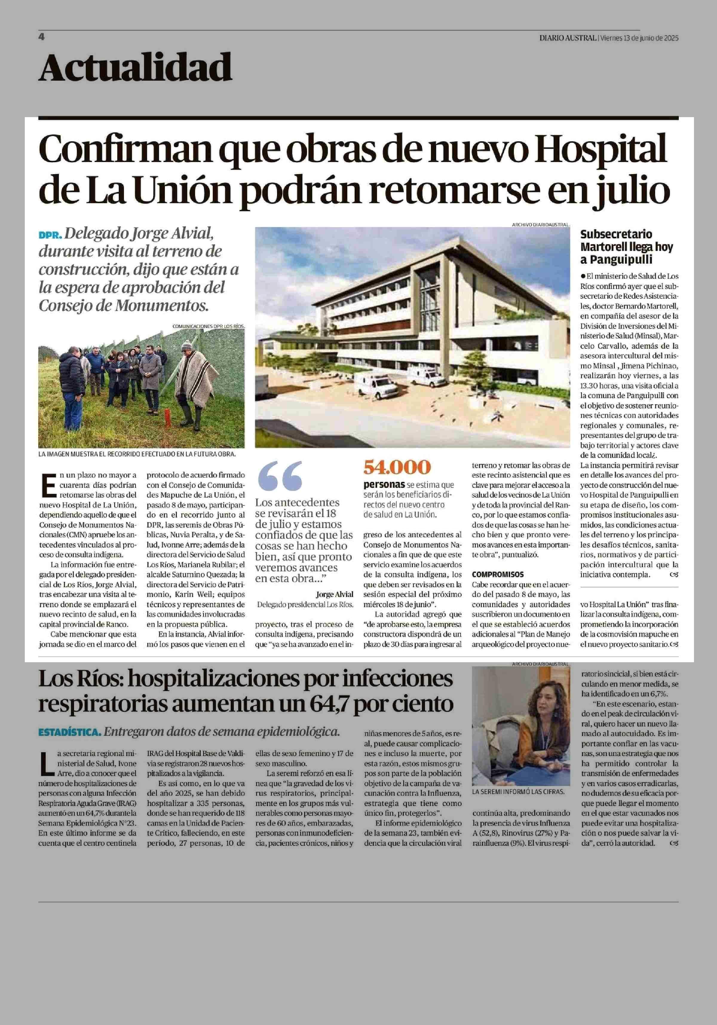 Confirman que obras de nuevo Hospital de La Unión podrán retomarse en julio 13-06-2025 Diario Austral Región de Los Ríos |