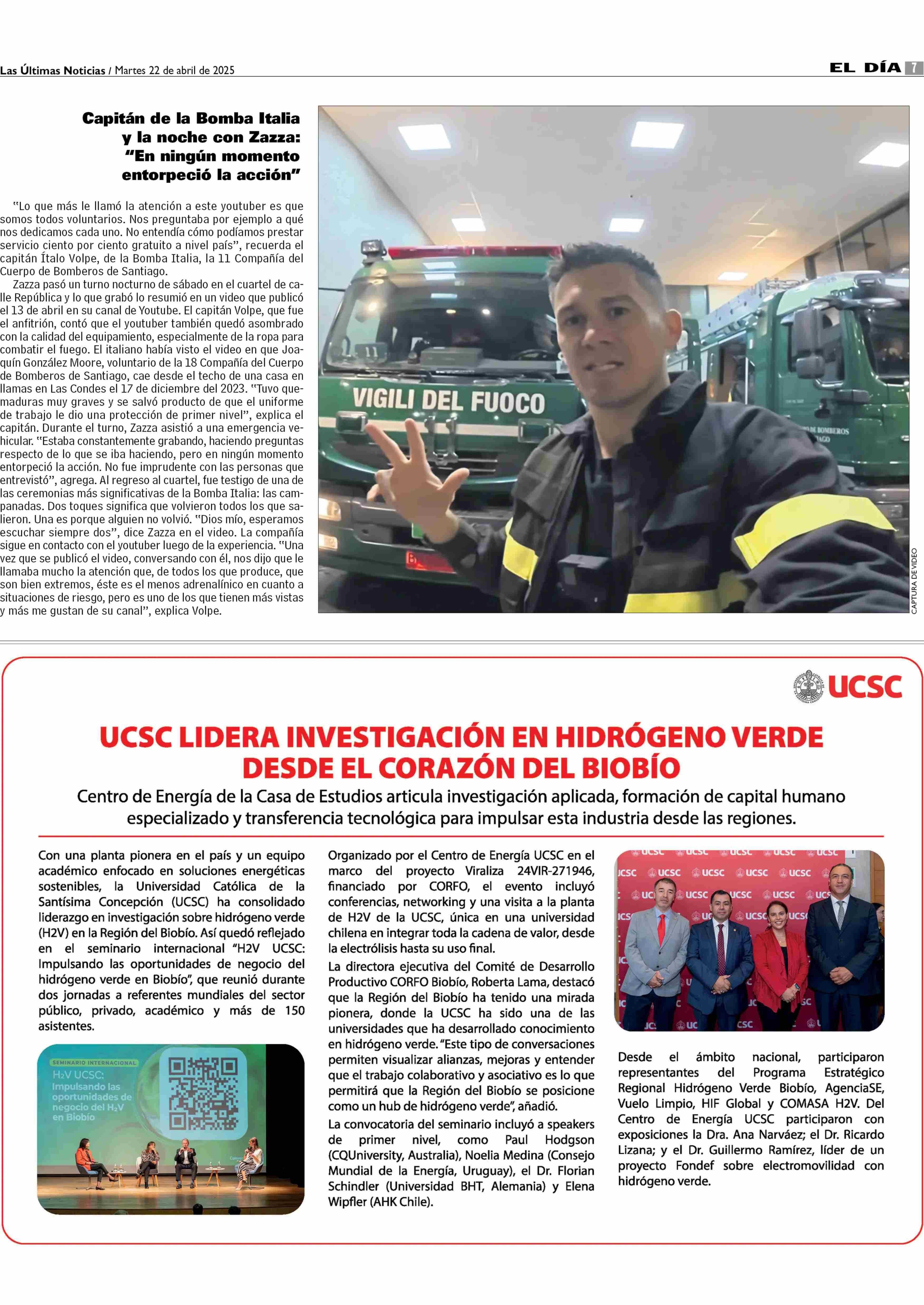 UCSC LIDERA INVESTIGACIÓN EN HIDRÓGENO VERDE DESDE EL CORAZÓN DEL BIOBÍO 22-04-2025 Las Últimas Noticias |