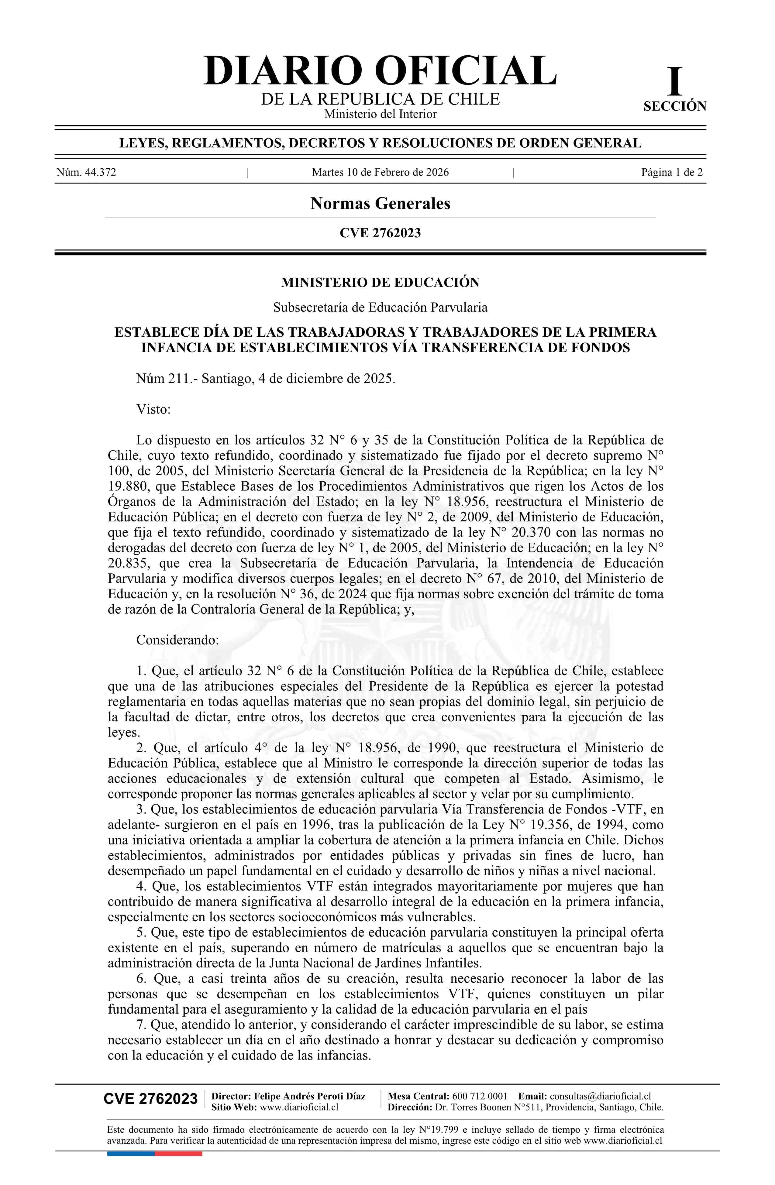 Título: Decreto número 211, de 2025.- Establece día de las trabajoras y trabajadores de la primera infancia de establecimientos vía transferencia de fondos