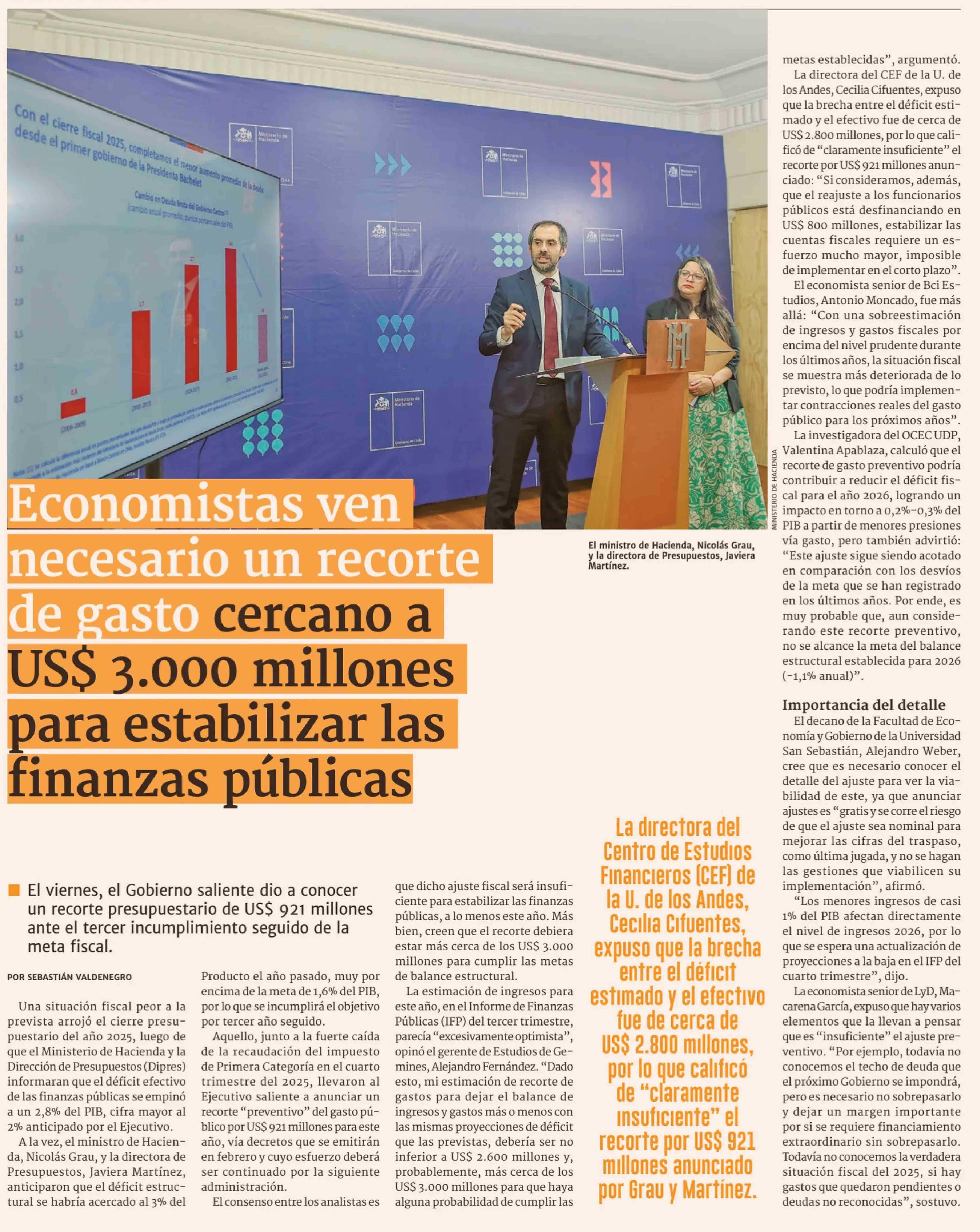 Economistas ven necesario un recorte de gasto cercano a US$ 3.000 millones para estabilizar las finanzas públicas 03-02-2026 Diario Financiero |