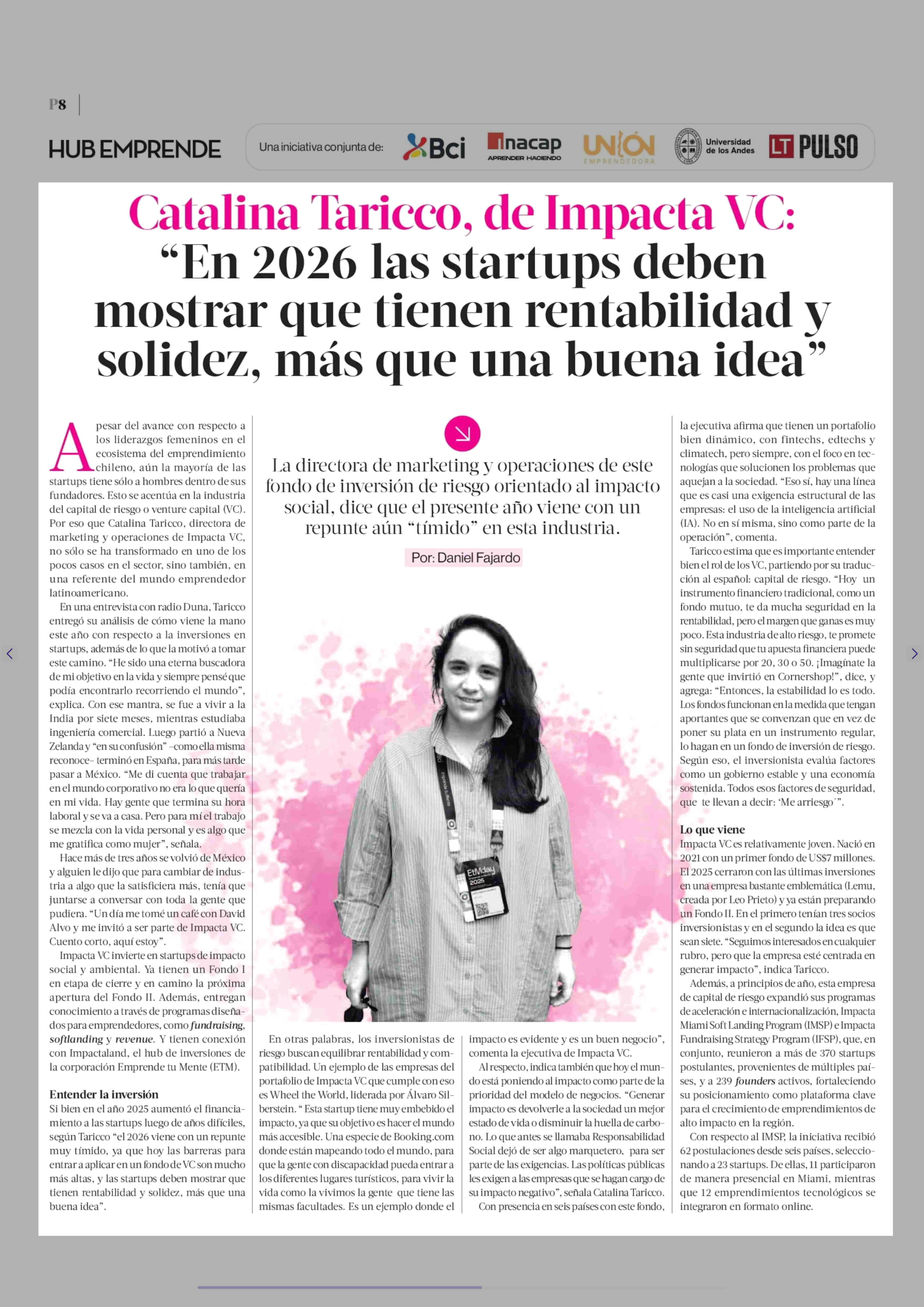 Catalina Taricco, de Impacta VC: "En 2026 las startups deben mostrar que tienen rentabilidad y solidez, más que una buena idea" 08-02-2026 La Tercera |