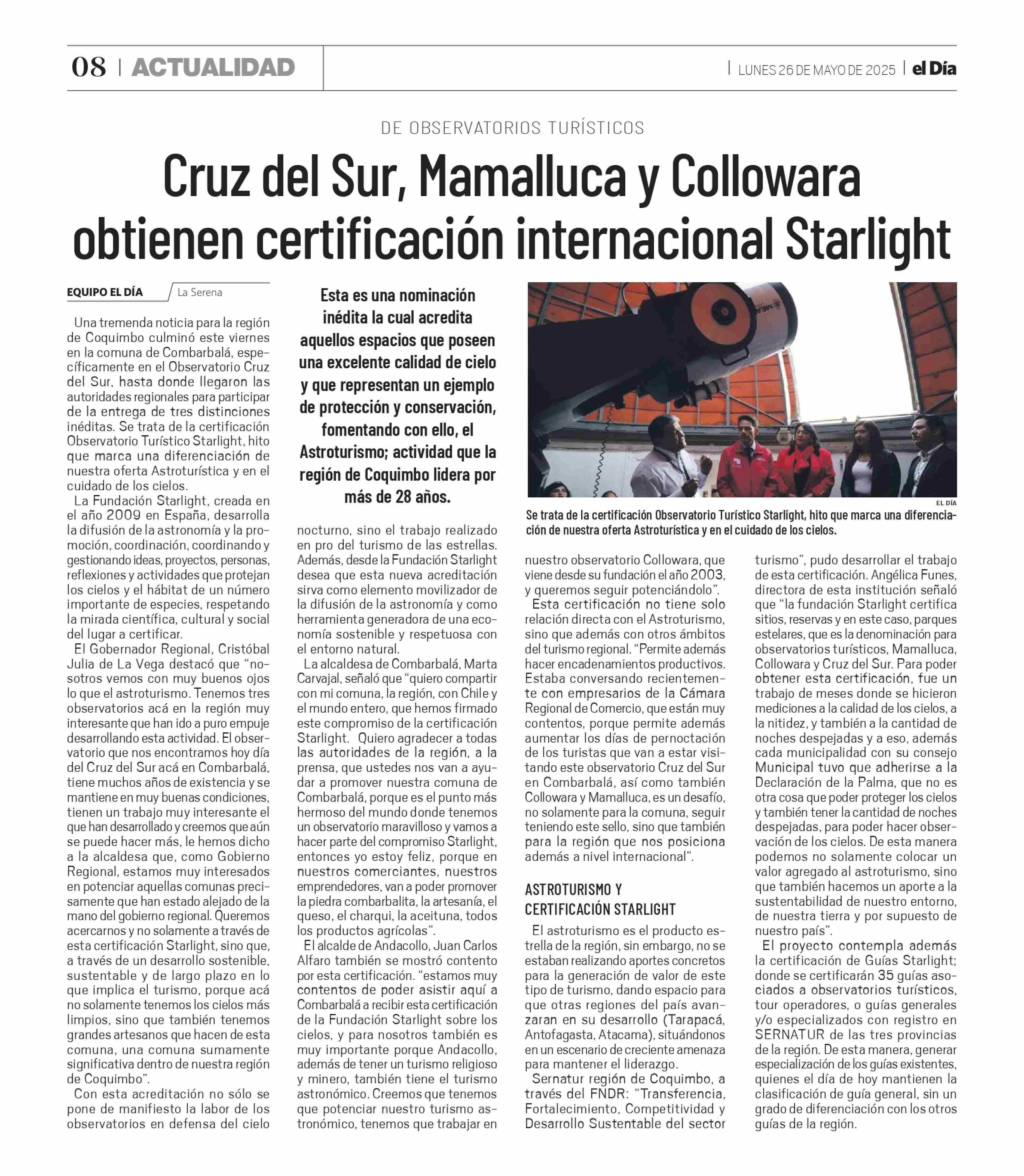Cruz del Sur, Mamalluca y Collowara obtienen certificación internacional Starlight 26-05-2025 El Día |