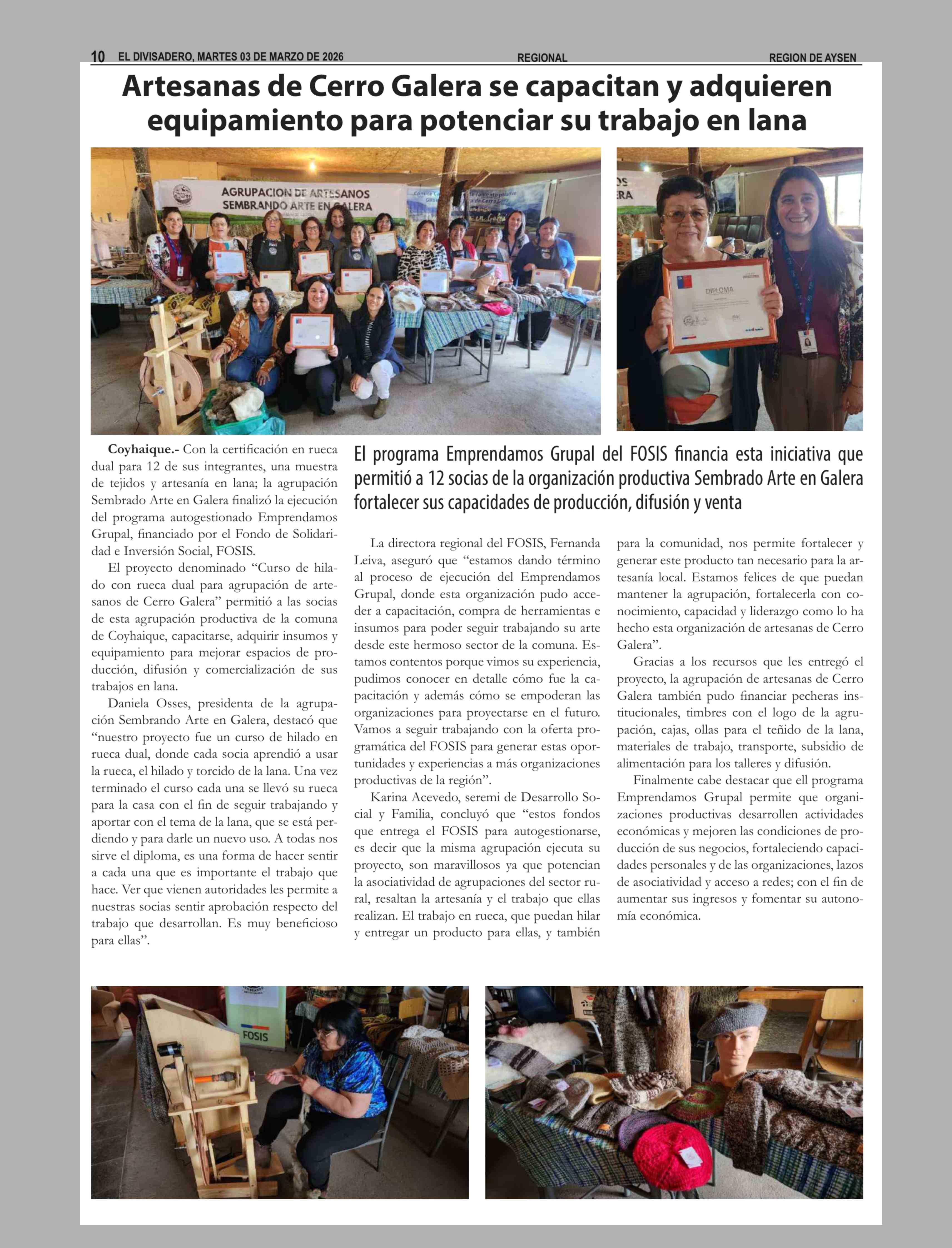 Artesanas de Cerro Galera se capacitan y adquieren equipamiento para potenciar su trabajo en lana 03-03-2026 El Divisadero |