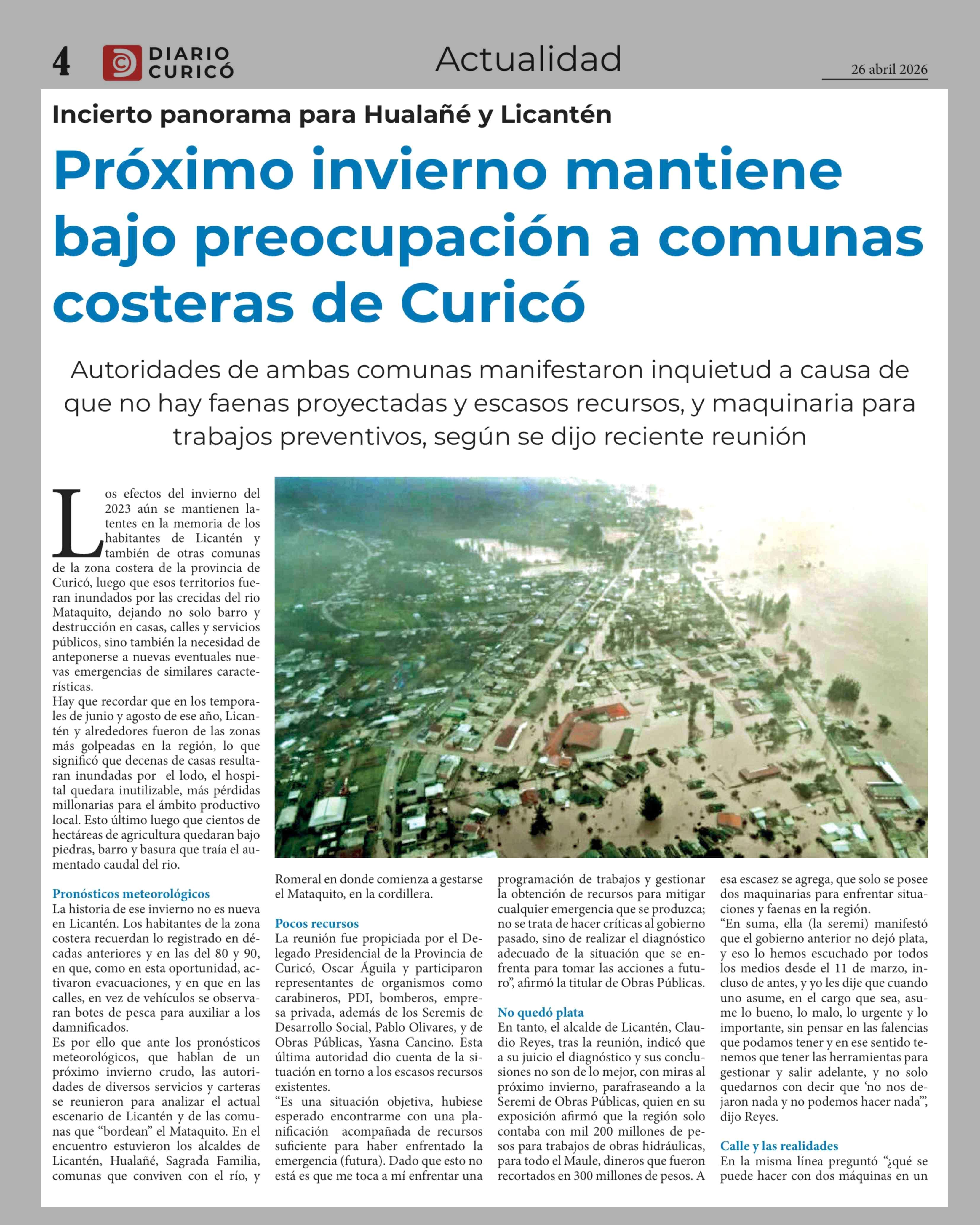 Próximo invierno mantiene bajo preocupación a comunas costeras de Curicó 26-04-2026 Diario Talca |