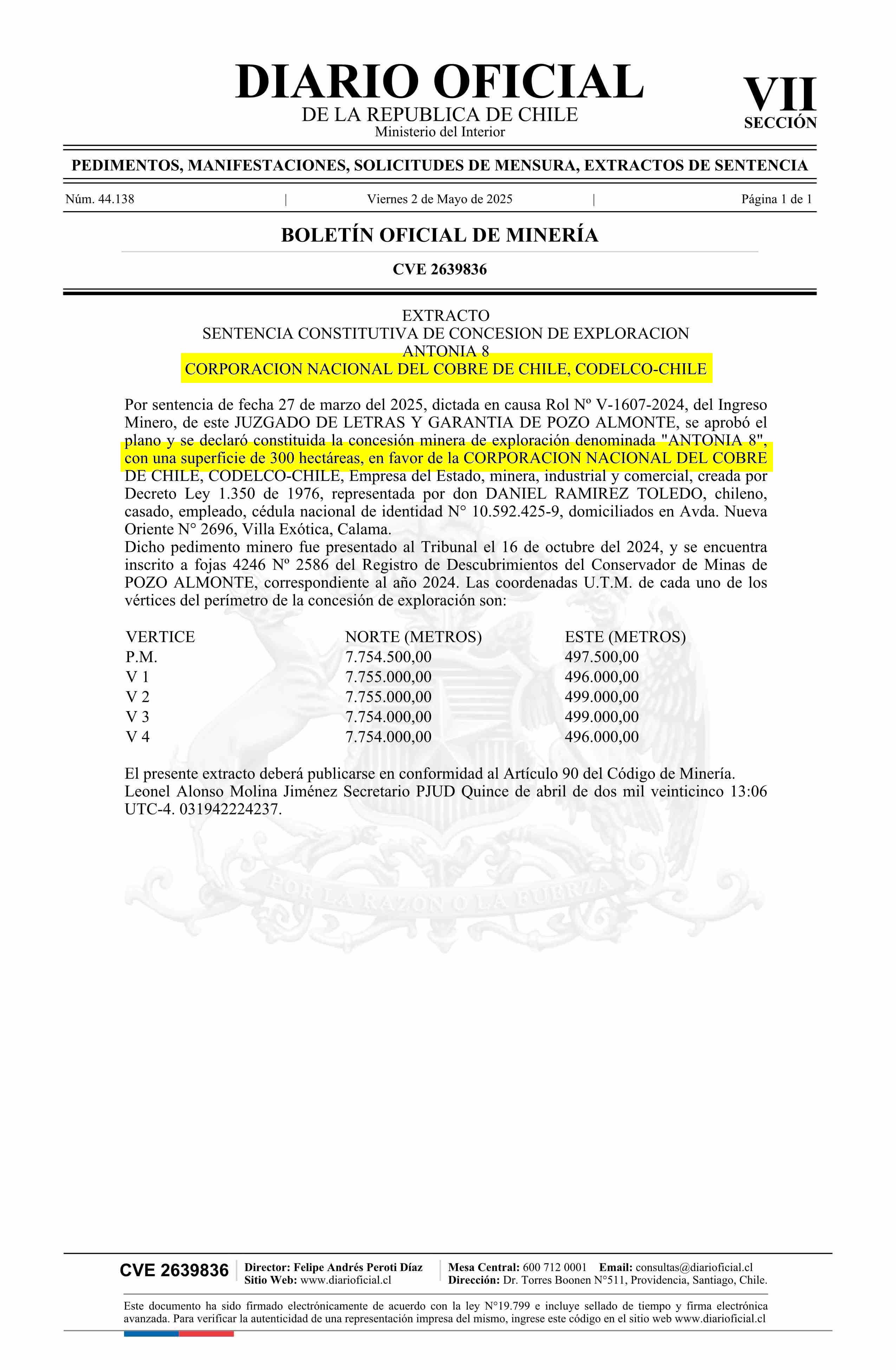ANTONIA 8 / Corporación Nacional del Cobre de Chile 02-05-2025 DIARIO OFICIAL CHILE - BOLETÍN OFICIAL DE MINERÍA |