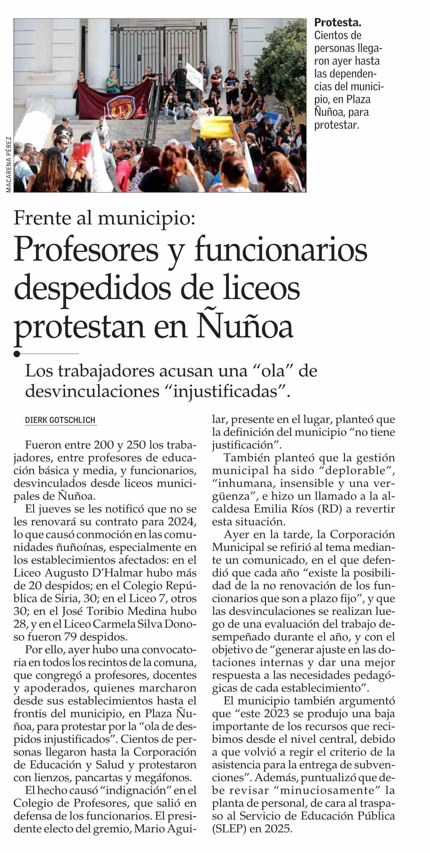 Profesores y funcionarios despedidos de liceos protestan en Ñuñoa 30-12-2023 El Mercurio |
