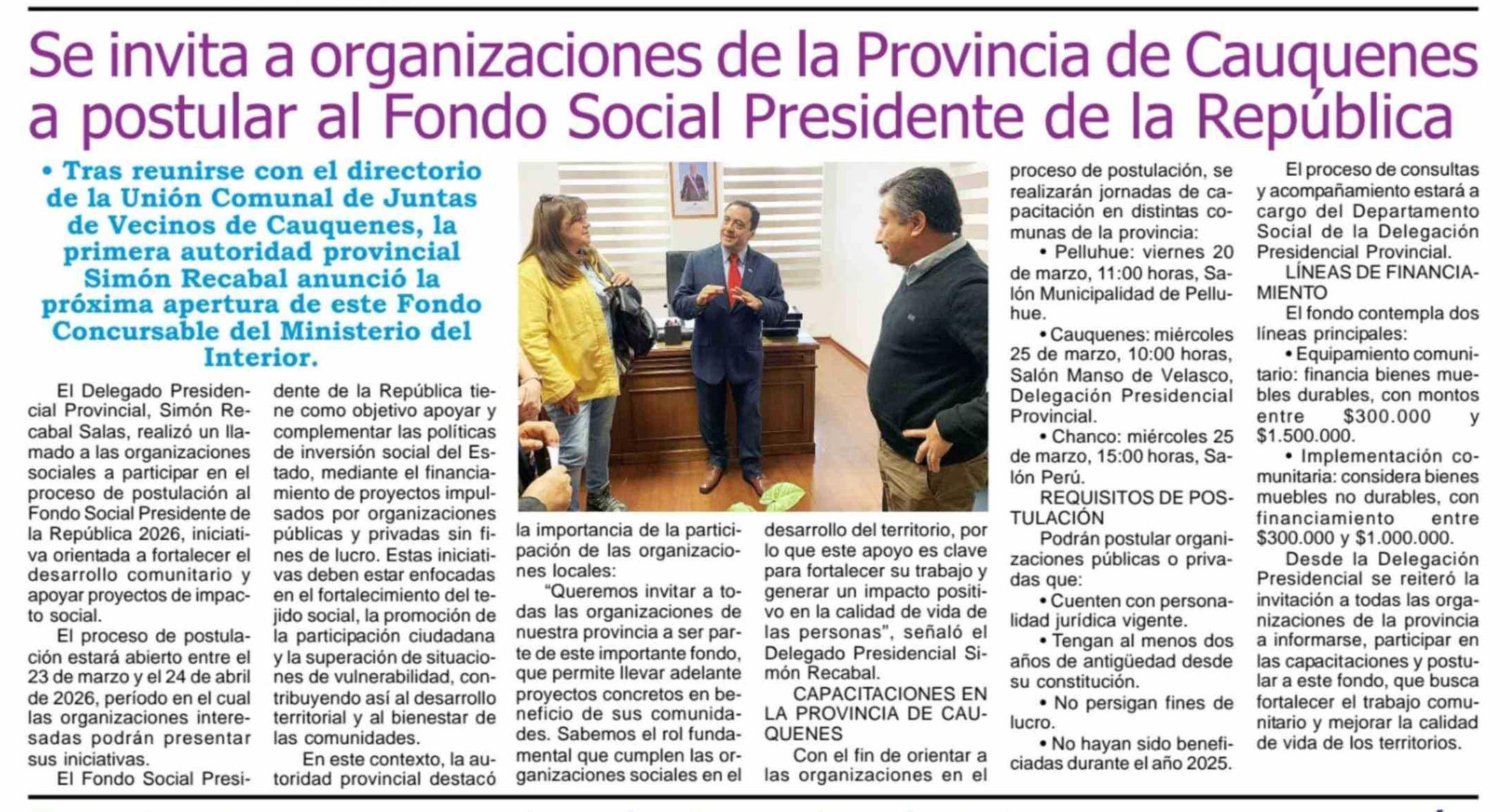 Título: Se invita a organizaciones de la Provincia de Cauquenes a postular al Fondo Social Presidente de la República