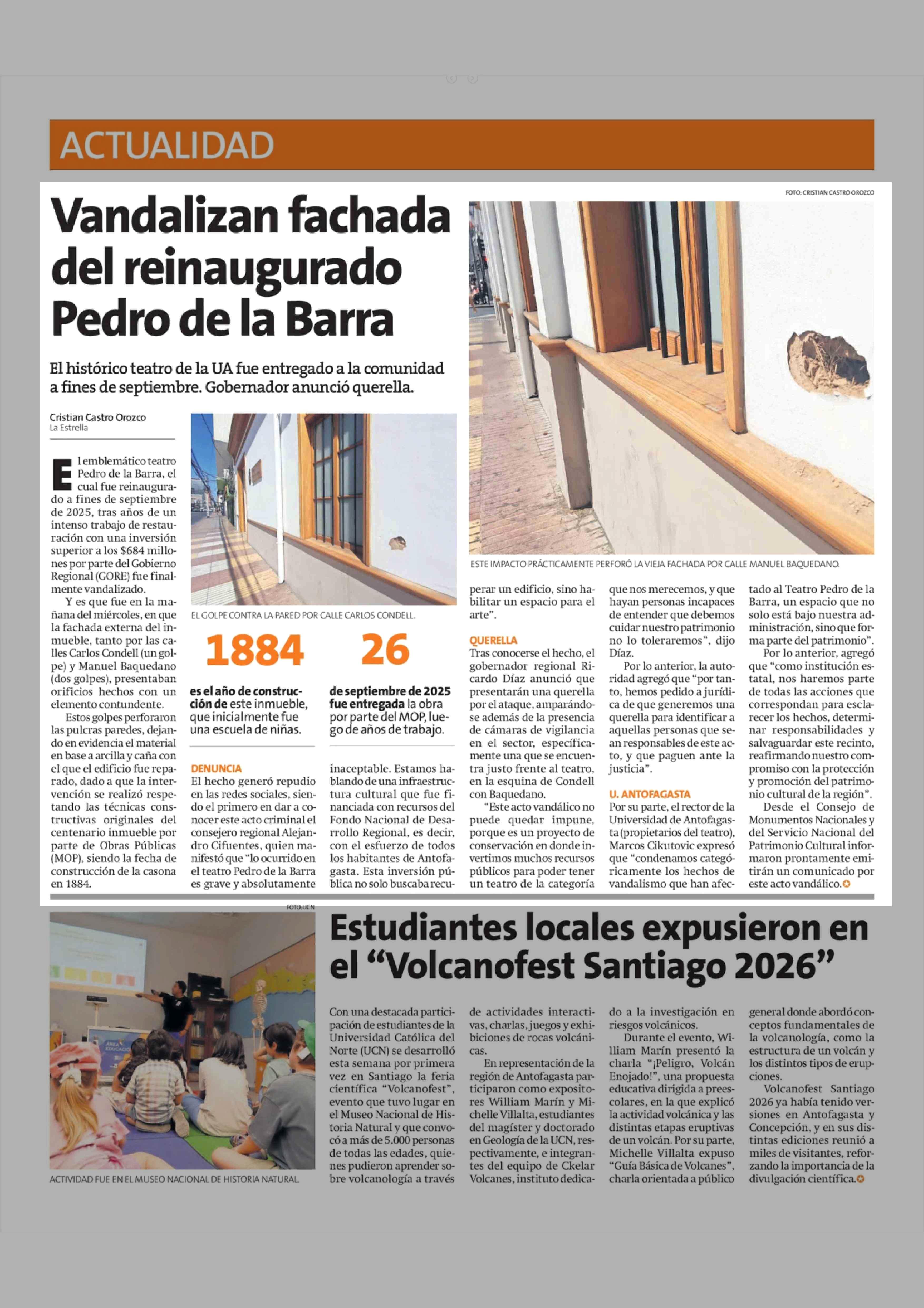 Vandalizan fachada del reinaugurado Pedro de la Barra 12-02-2026 La Estrella de Antofagasta |