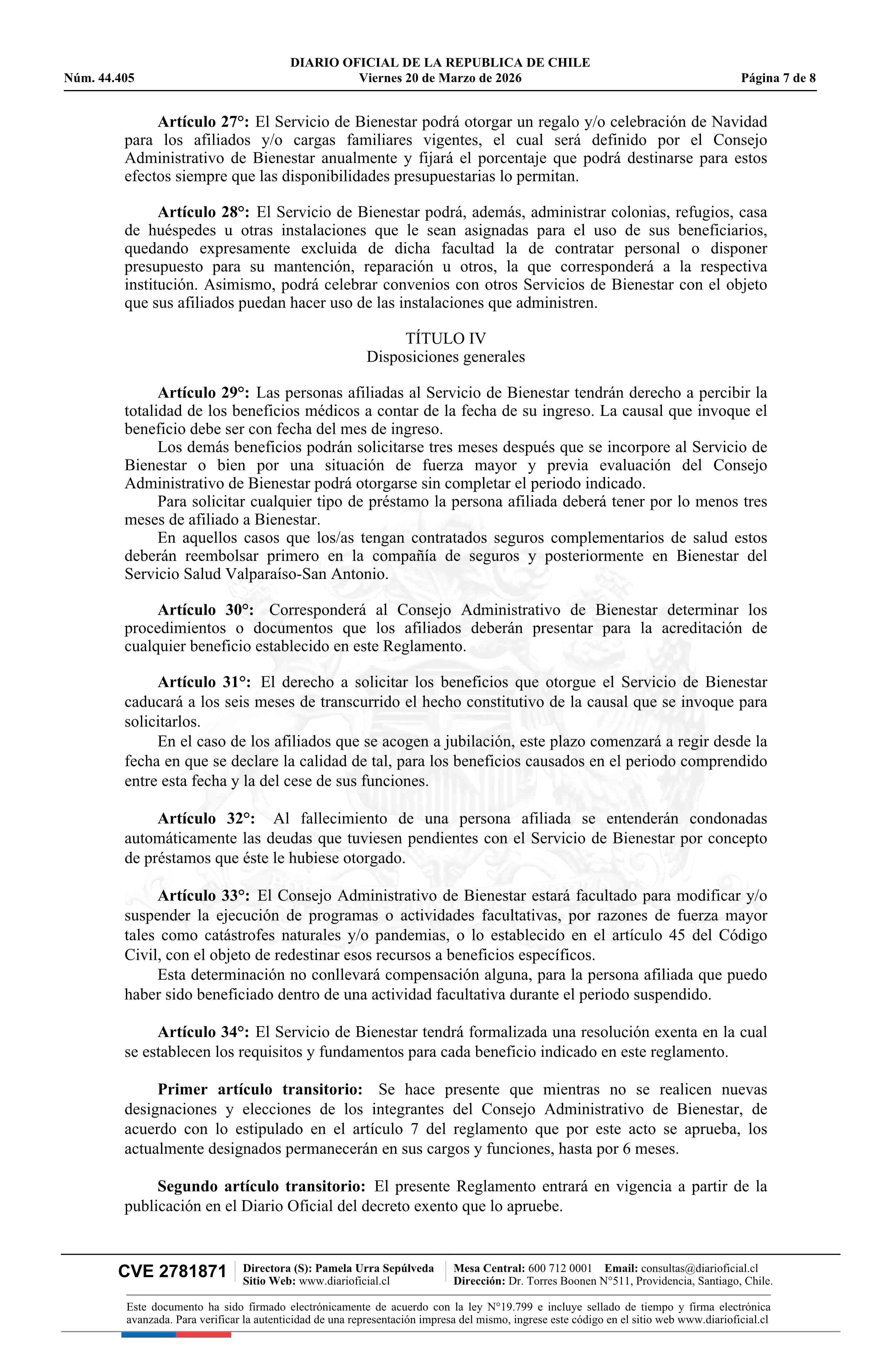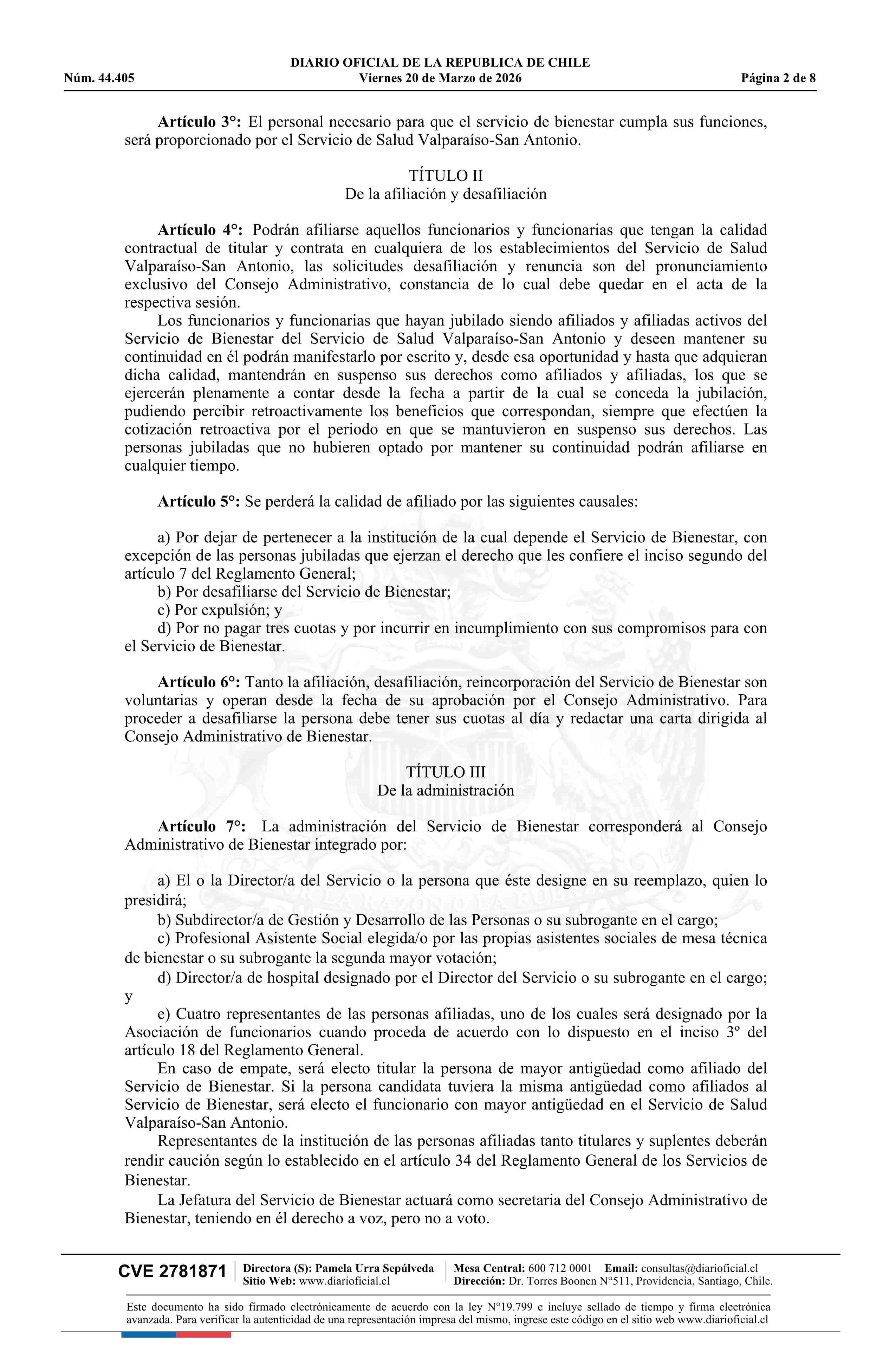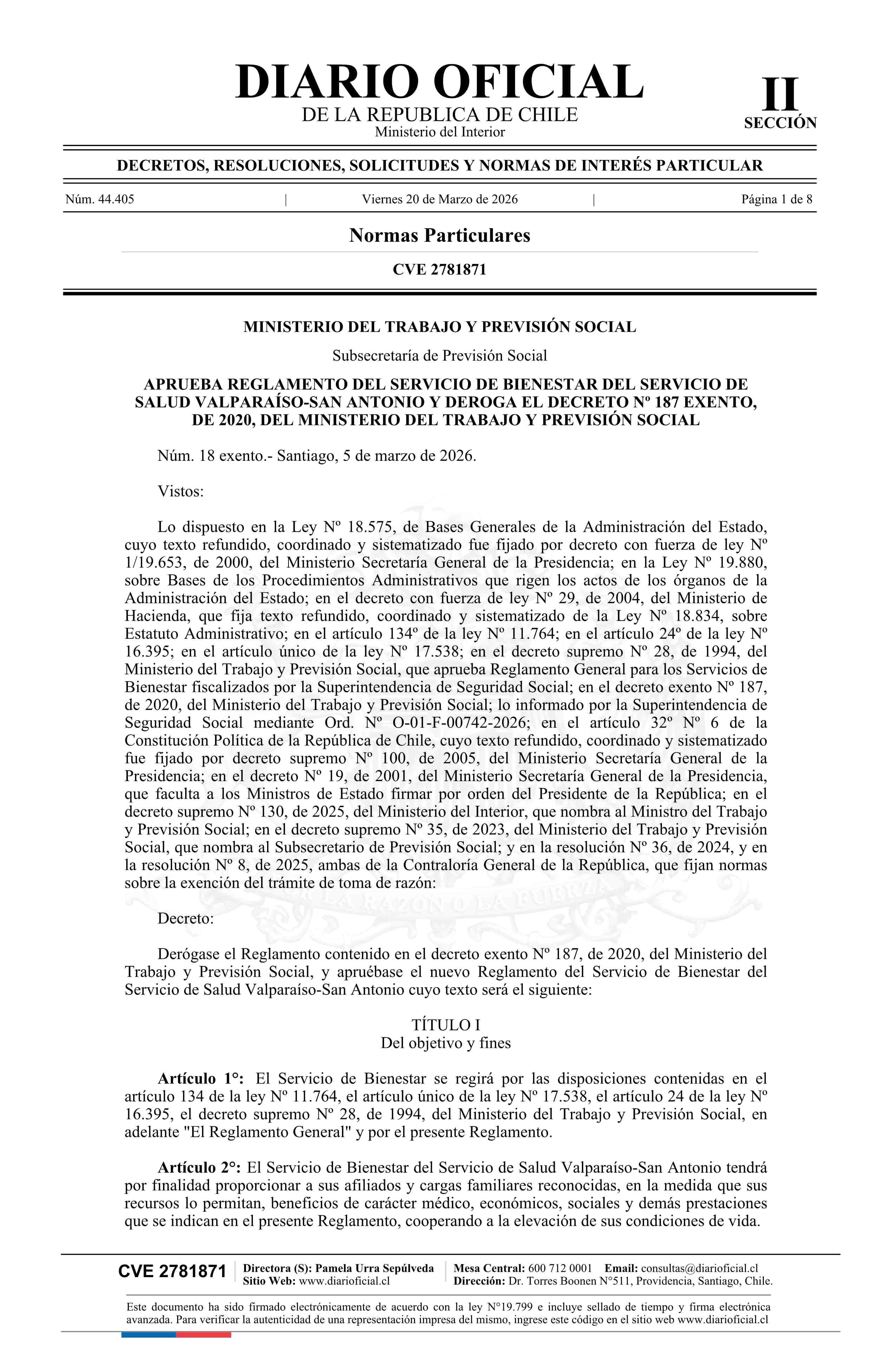 Decreto exento número 18, de 2026.- Aprueba Reglamento del Servicio de Bienestar del Servicio de Salud Valparaíso-San Antonio y deroga el decreto Nº 187 exento, de 2020 20-03-2026 Diario Oficial Edición Electrónica |