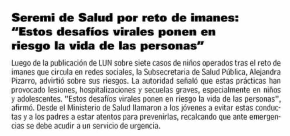 Título: Seremi de Salud por reto de imanes: "Estos desafíos virales ponen en riesgo la vida de las personas"