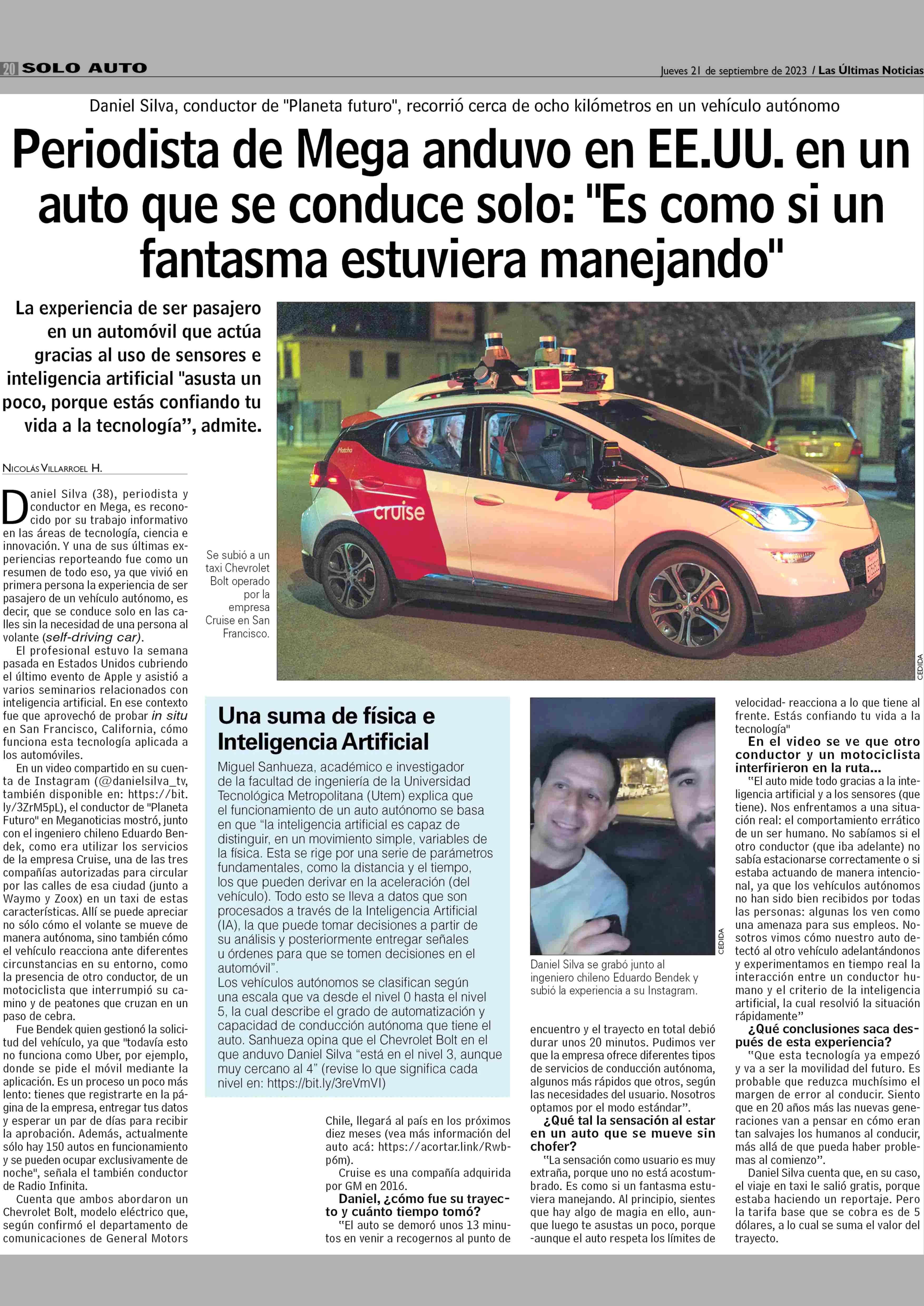 | Título: | Periodista de Mega anduvo en EE.UU. en un auto que se conduce solo: "Es como si un fantasma estuviera manejando" |