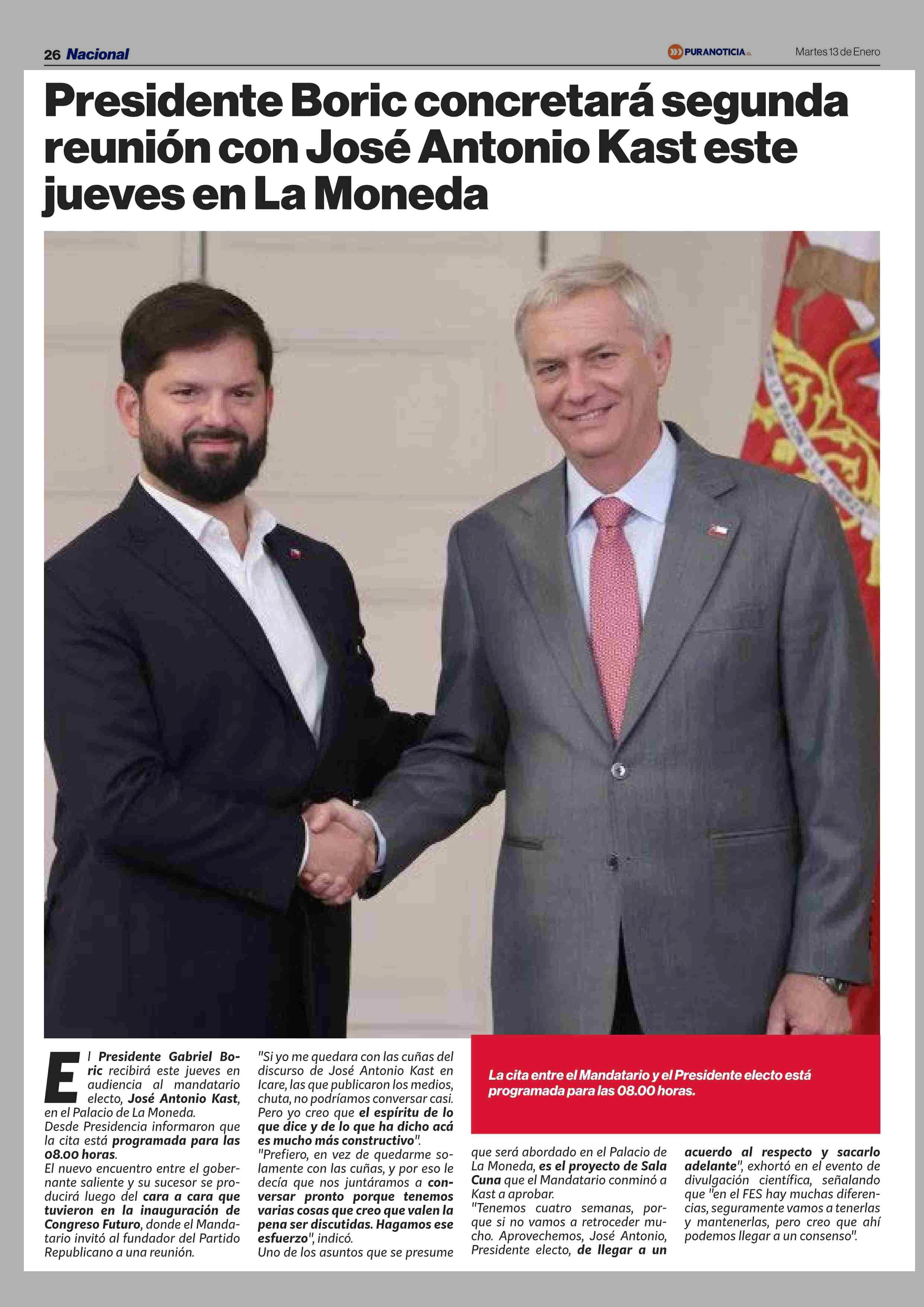 Presidente Boric concretará segunda reunión con José Antonio Kast este jueves en La Moneda 13-01-2026 Puranoticia.cl |