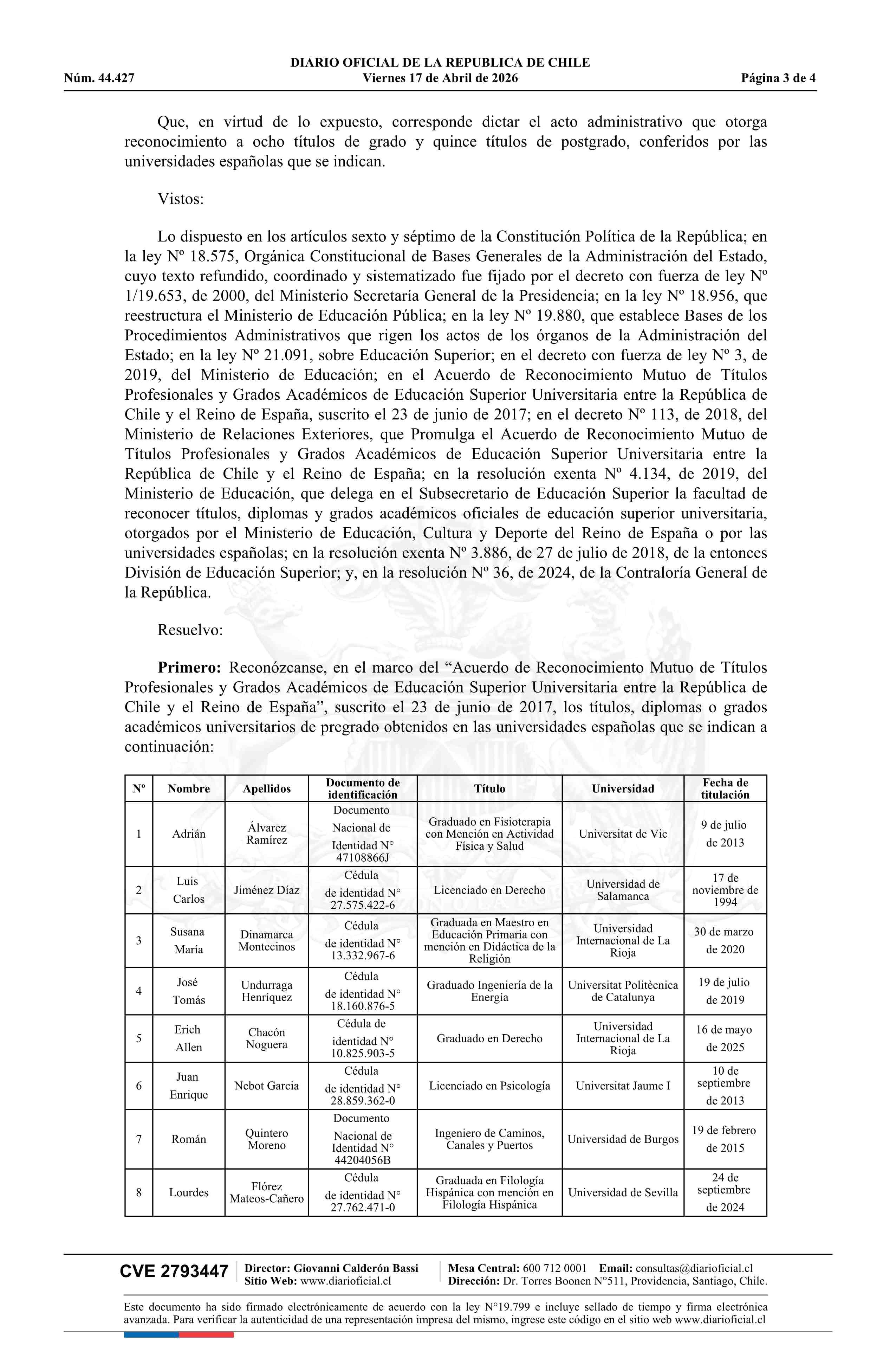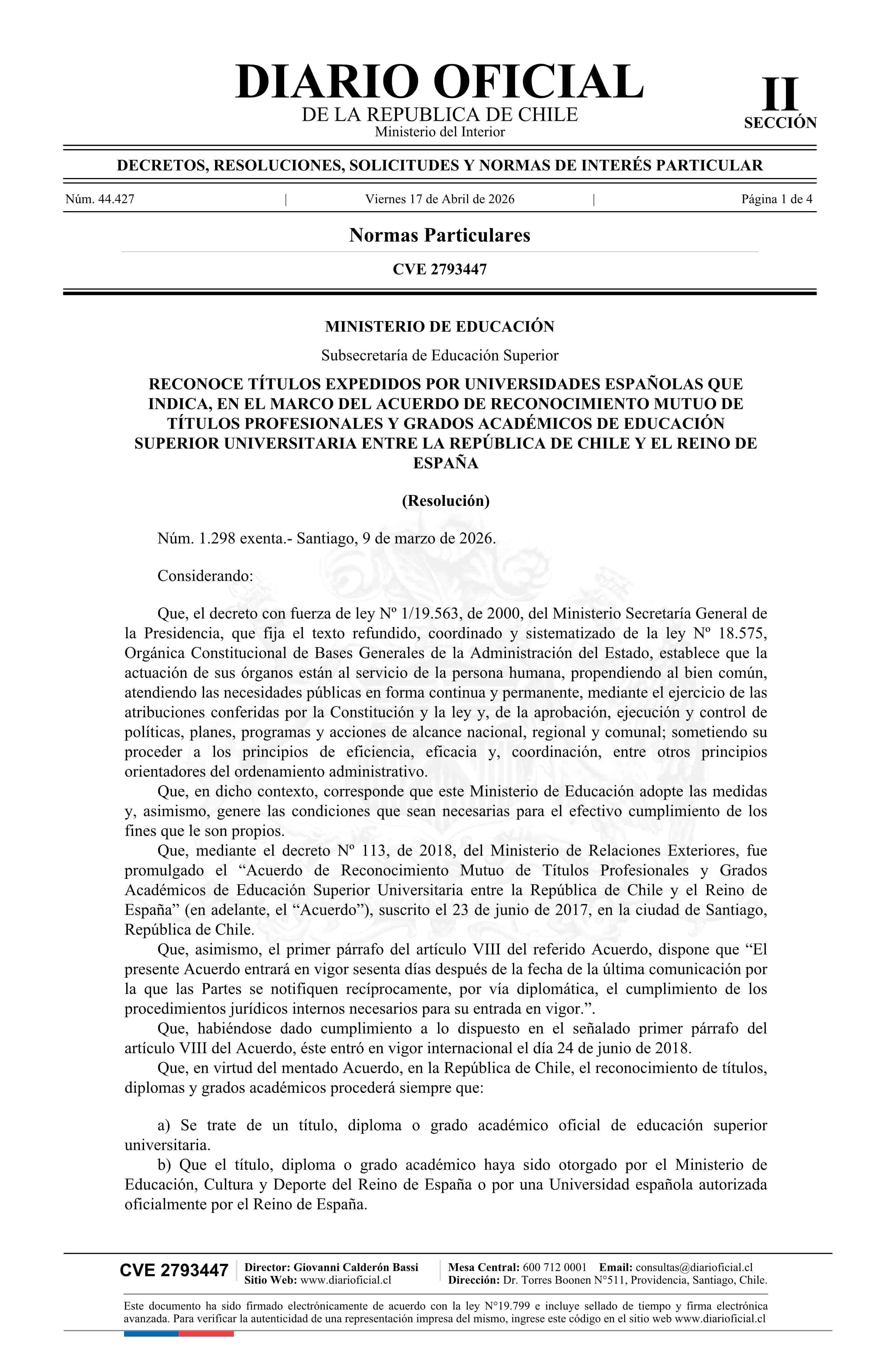 Título: Resolución exenta número 1.298, de 2026.- Reconoce títulos expedidos por universidades españolas que indica, en el marco del Acuerdo de Reconocimiento Mutuo de Títulos Profesionales y Grados Académicos de Educación Superior Universitaria entre la República de Chile y el Reino de España