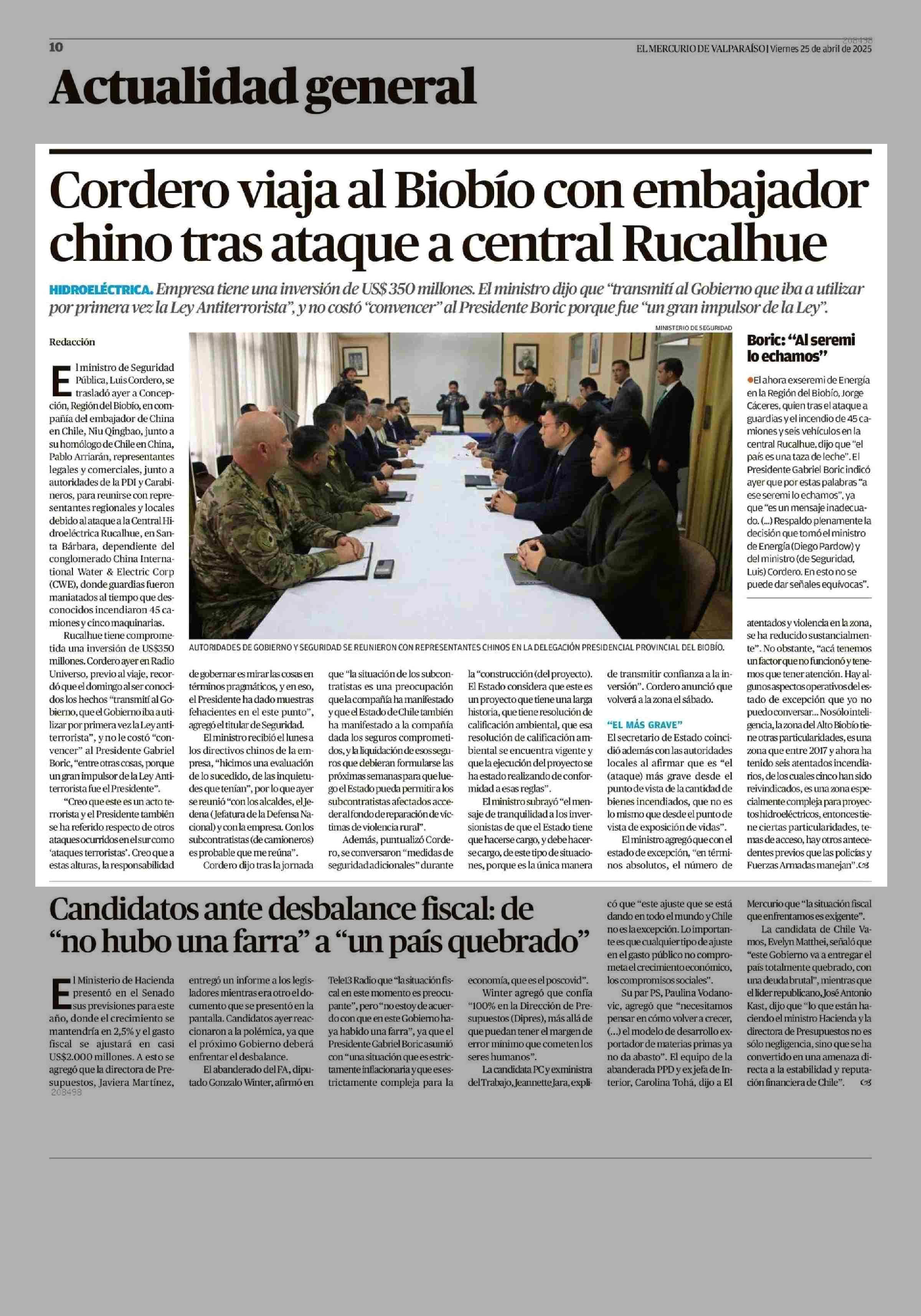Título: Cordero viaja al Biobío con embajador chino tras ataque a central Rucalhue