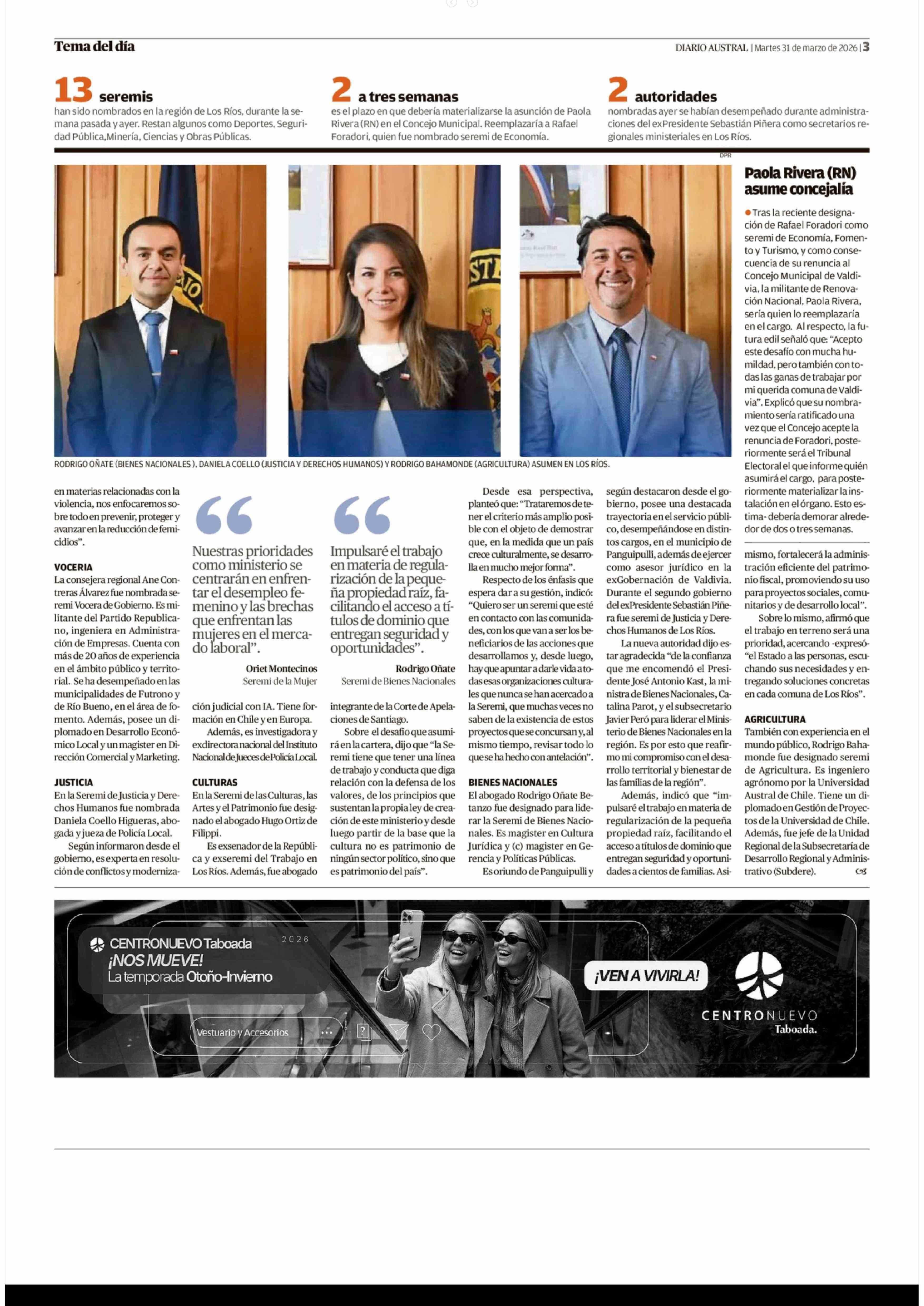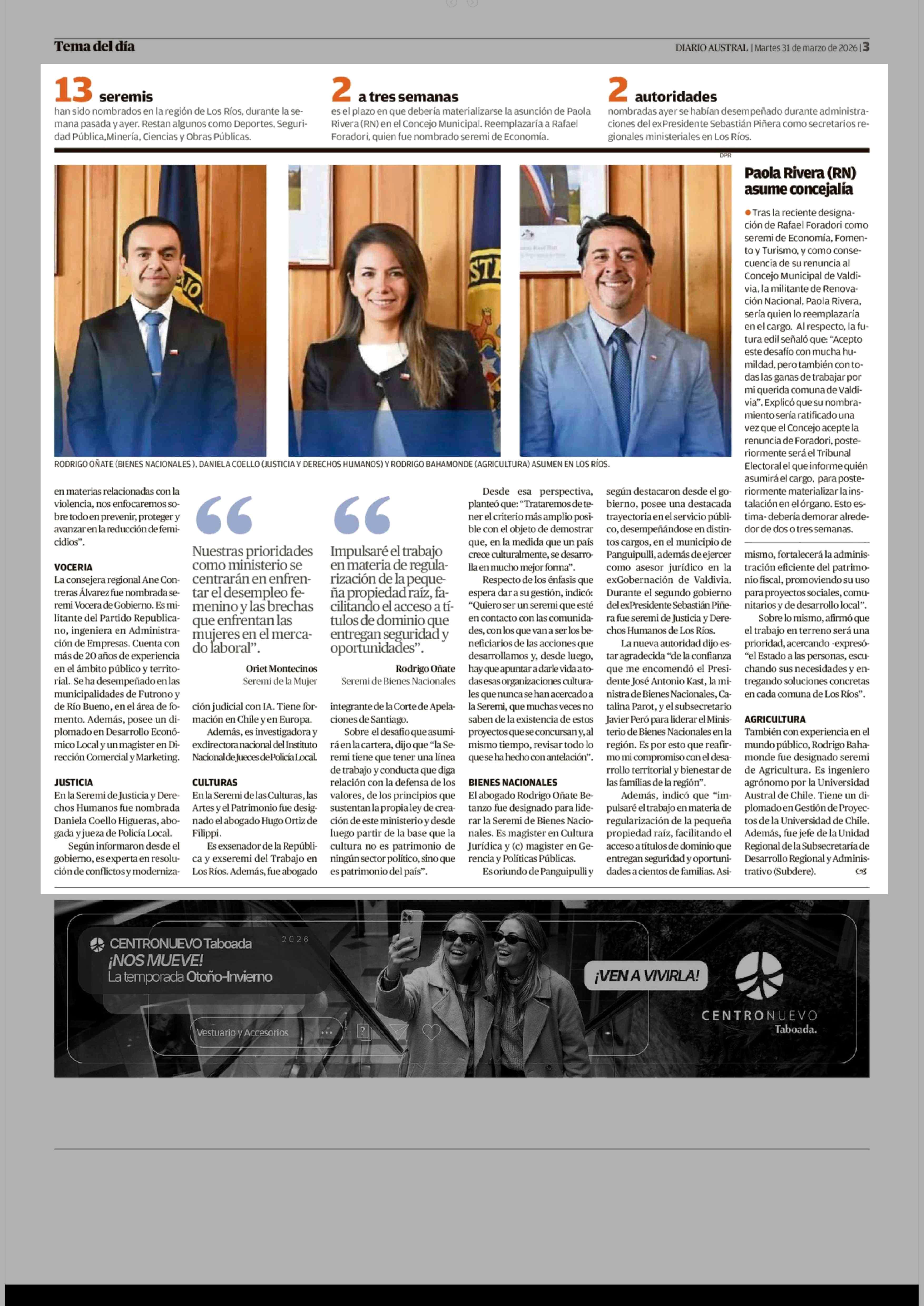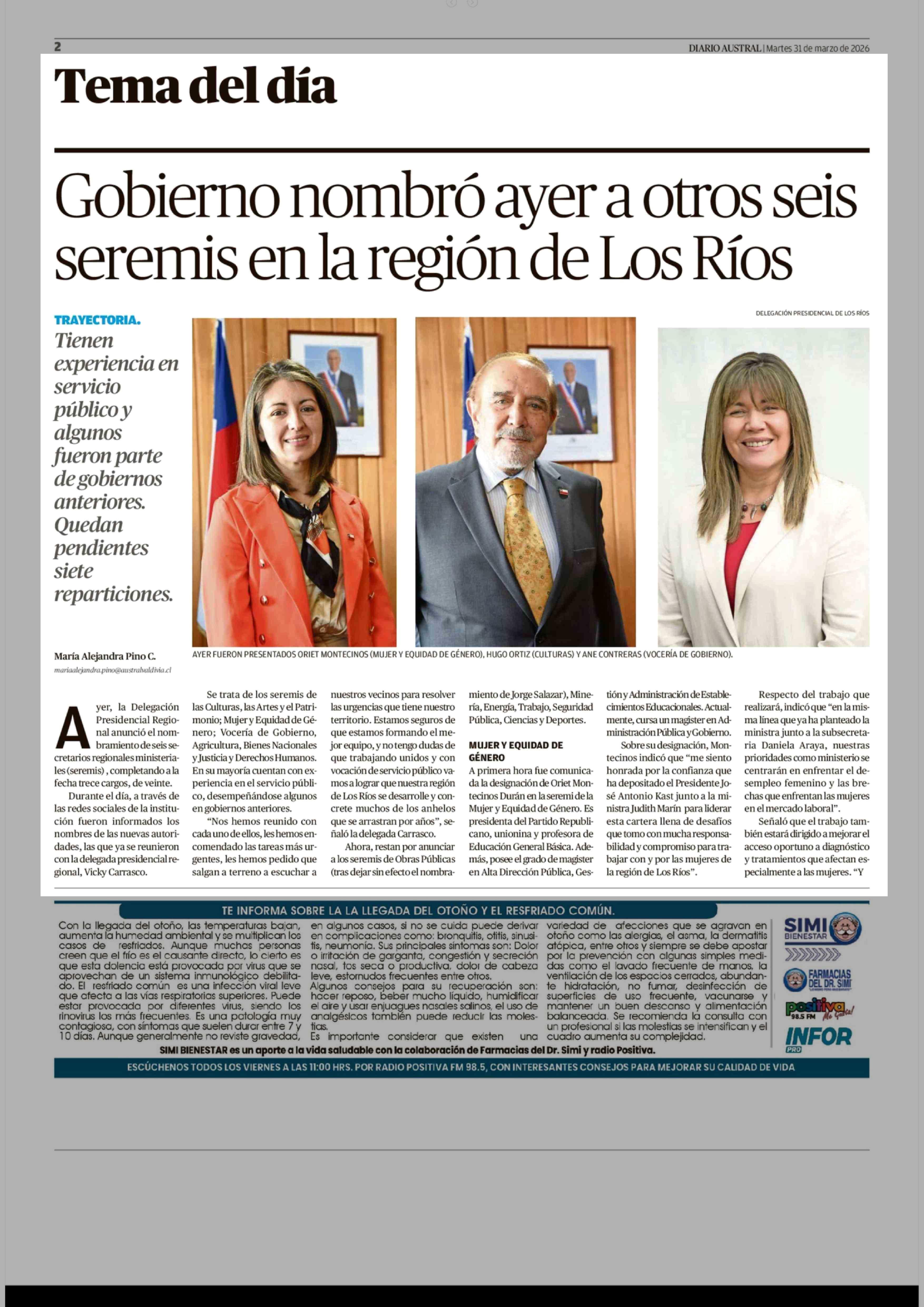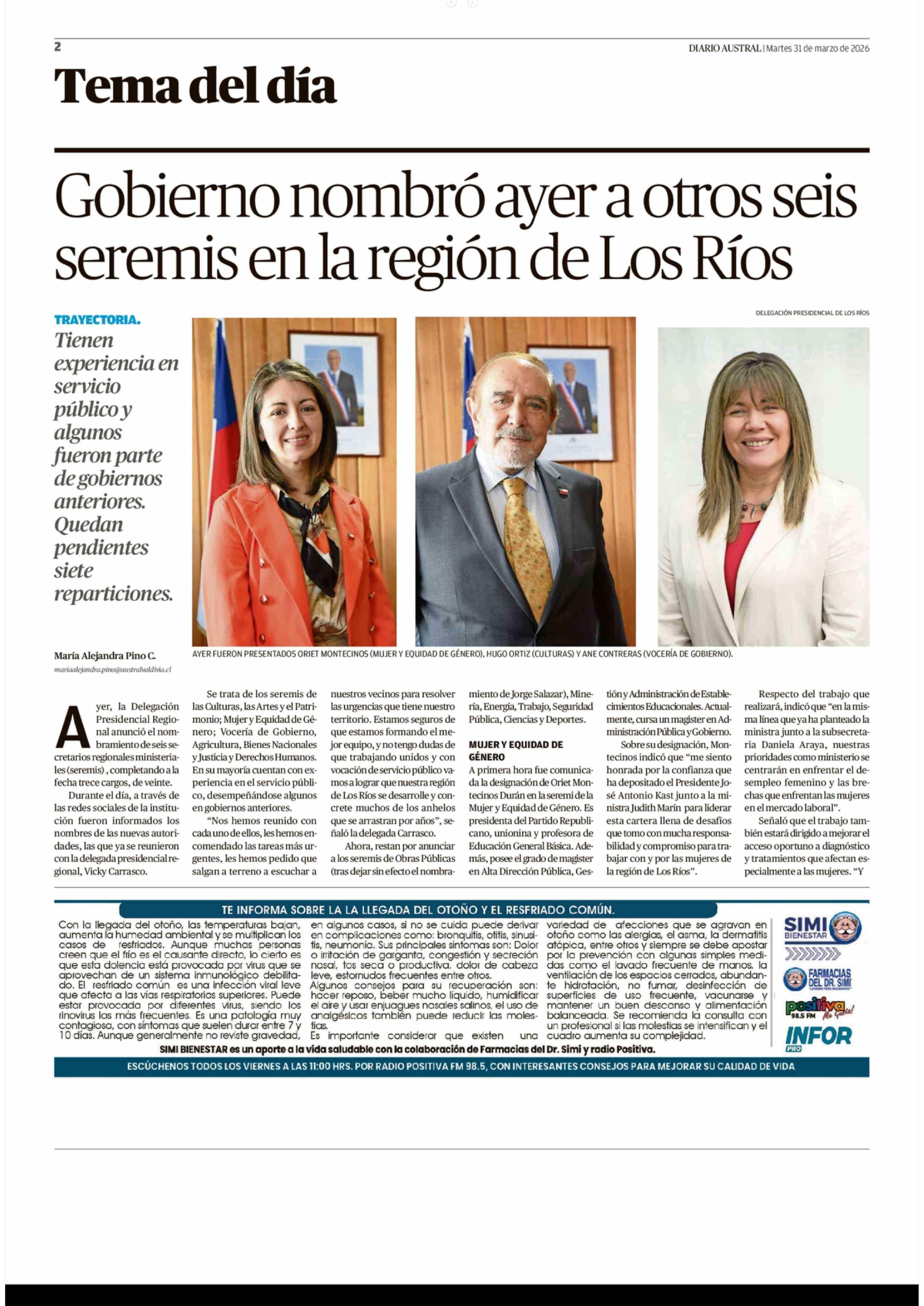 Gobierno nombró ayer a otros seis seremis en la región de Los Ríos 31-03-2026 Diario Austral Región de Los Ríos |