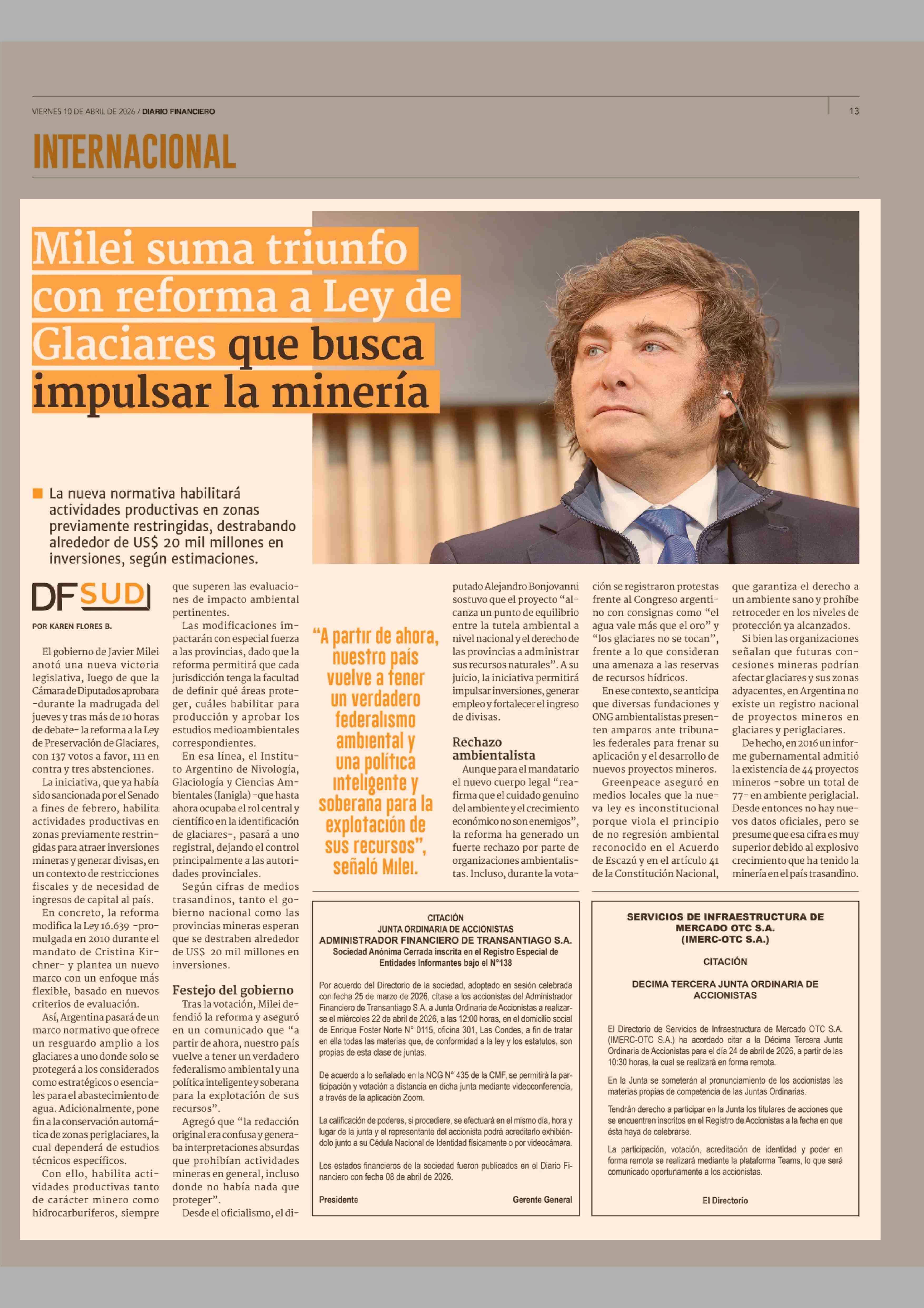 Título: Milei suma triunfo con reforma a Ley de Glaciares que busca impulsar la minería