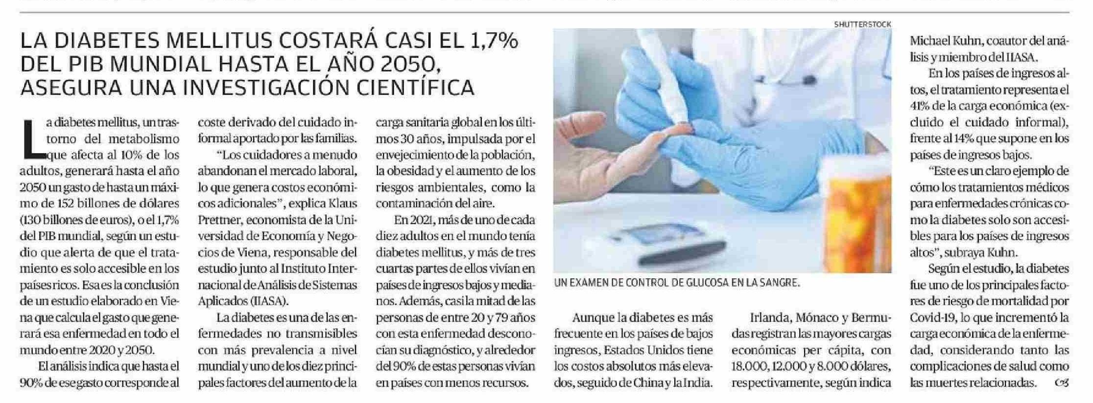 LA DIABETES MELLITUS COSTARÁ CASI EL 1,7% DEL PIB MUNDIAL HASTA EL AÑO 2050, ASEGURA UNA INVESTIGACIÓN CIENTÍFICA 12-01-2026 El Mercurio de Calama |