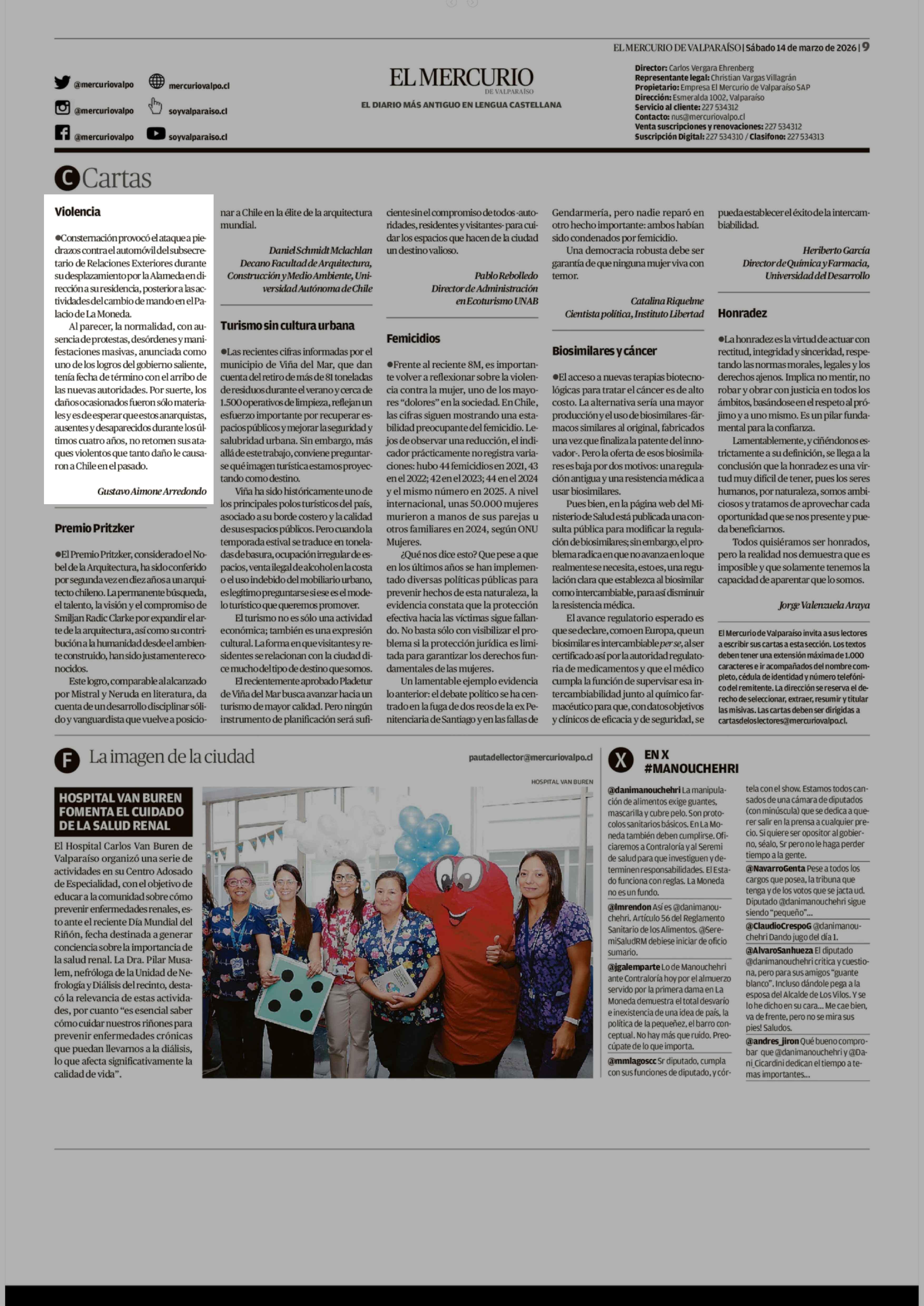 Cartas: Violencia 14-03-2026 El Mercurio de Valparaíso |