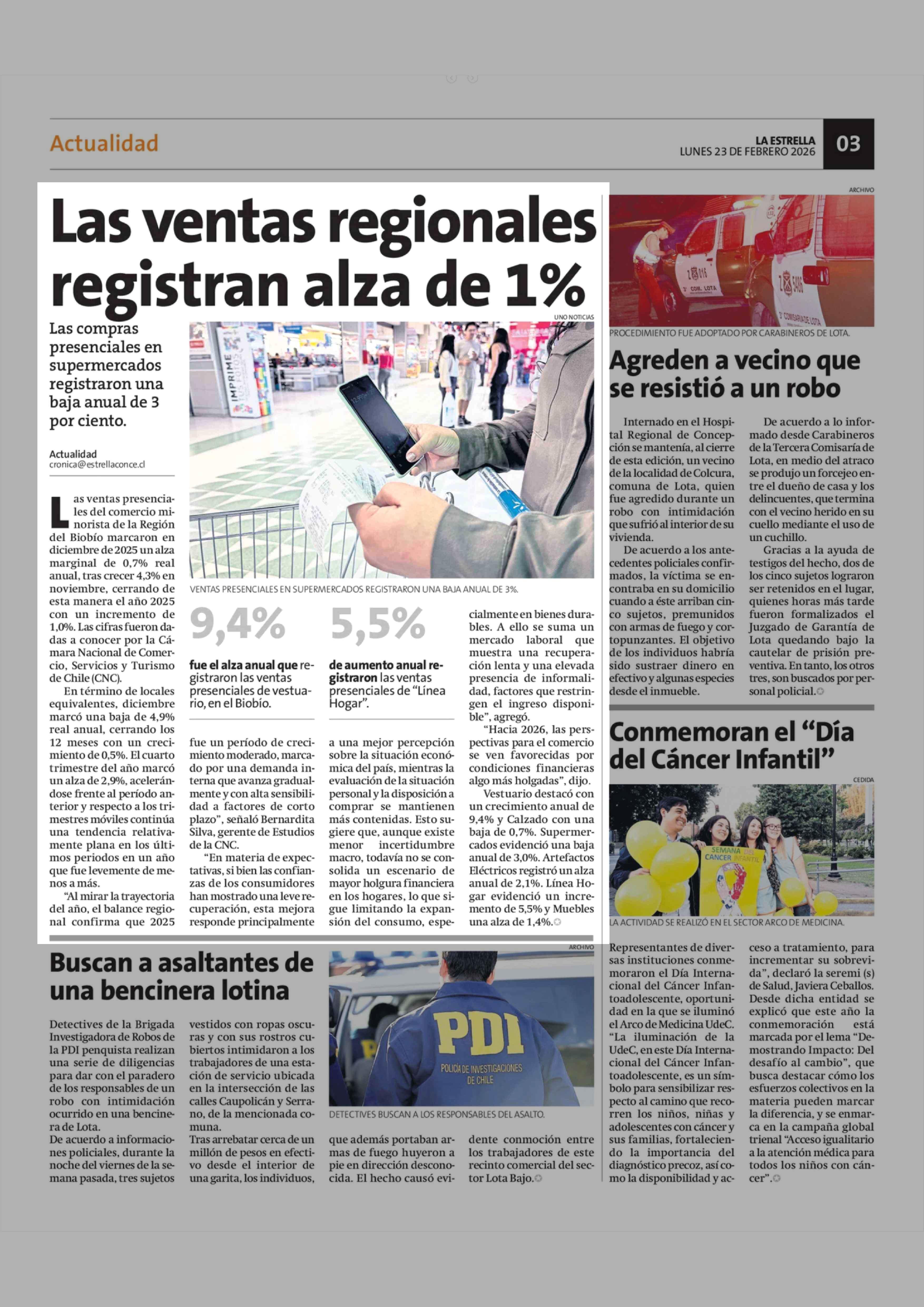 Las ventas regionales registran alza de 1% 23-02-2026 La Estrella de Concepción |