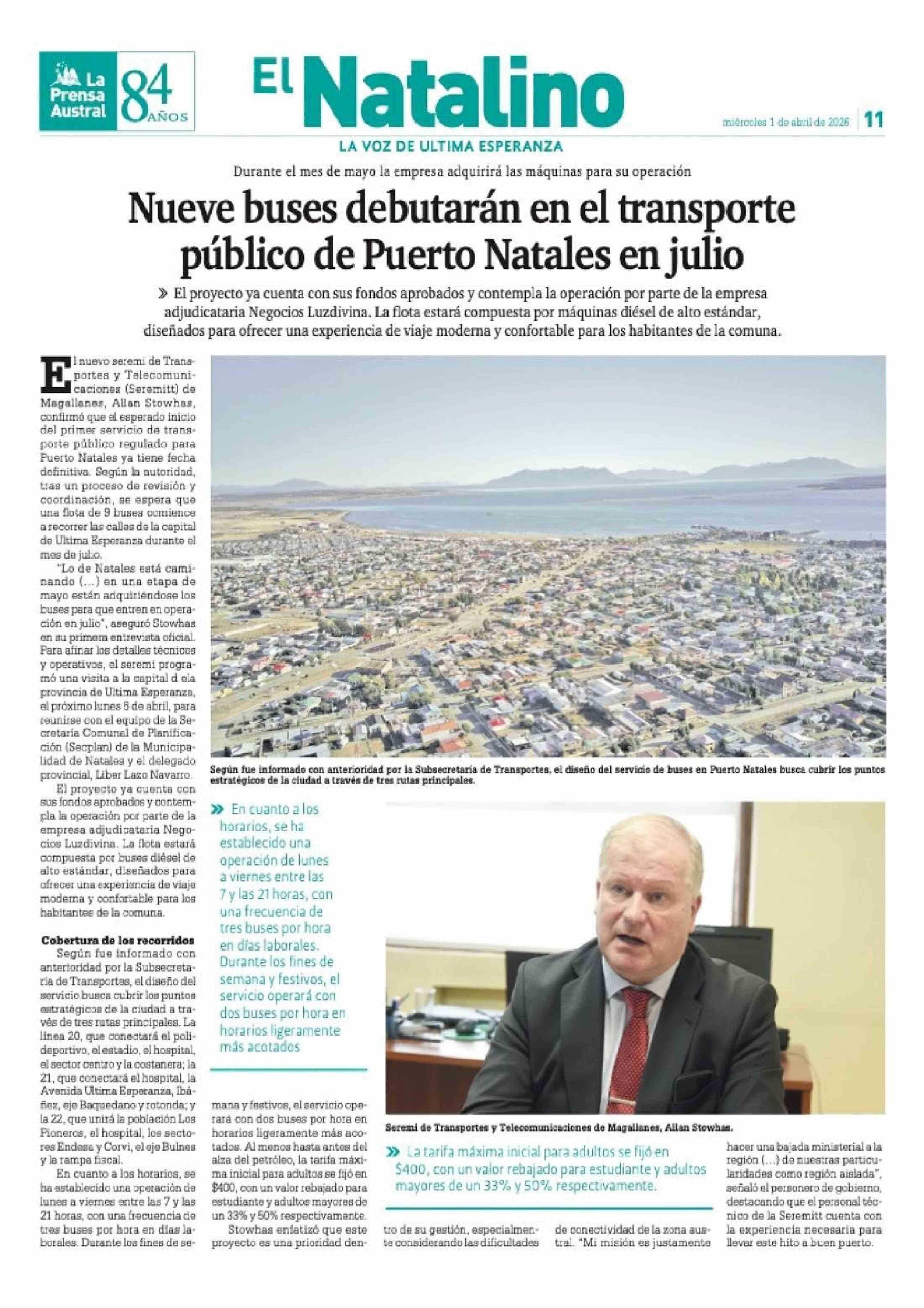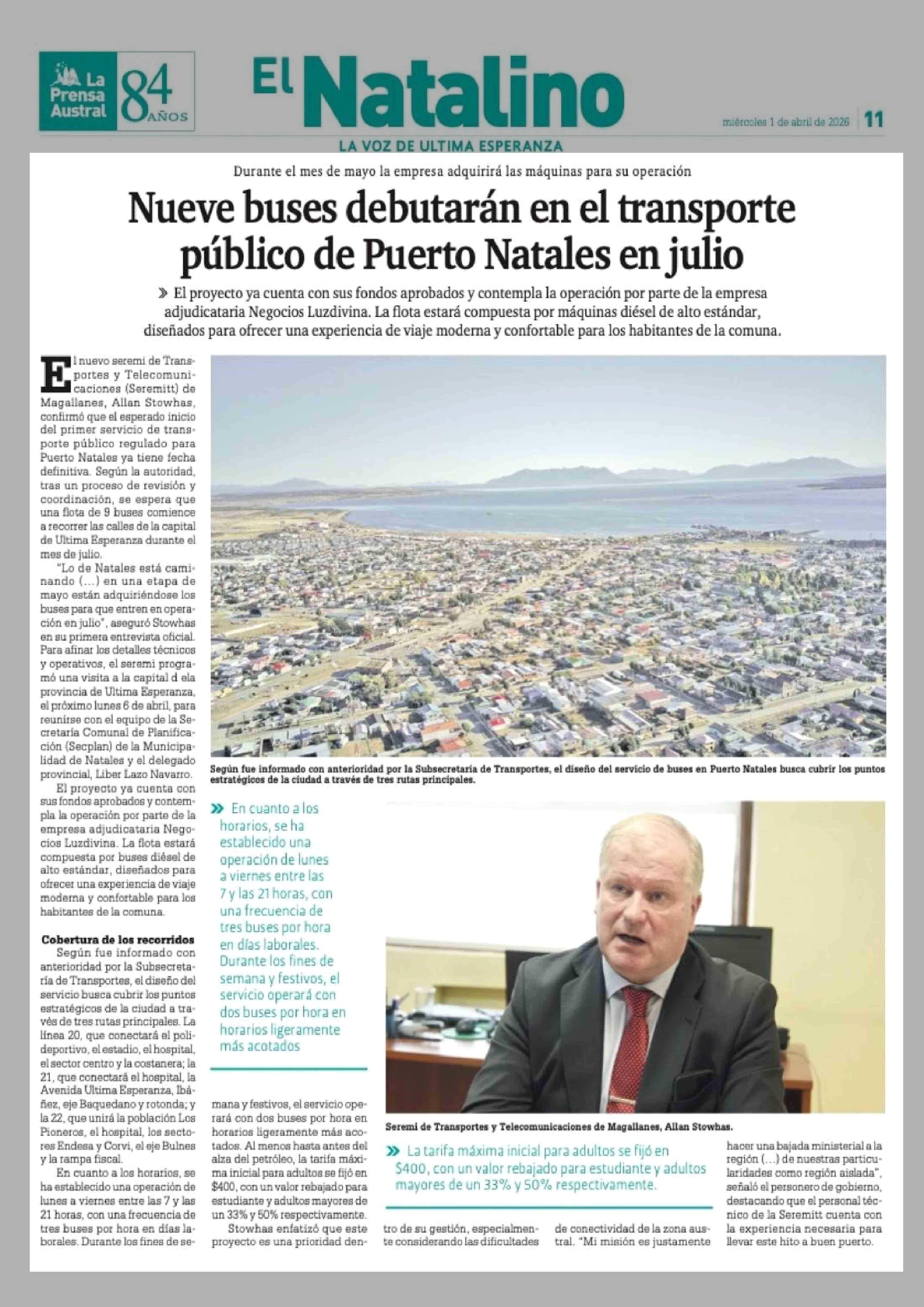 Nueve buses debutarán en el transporte público de Puerto Natales en julio 01-04-2026 La Prensa Austral |