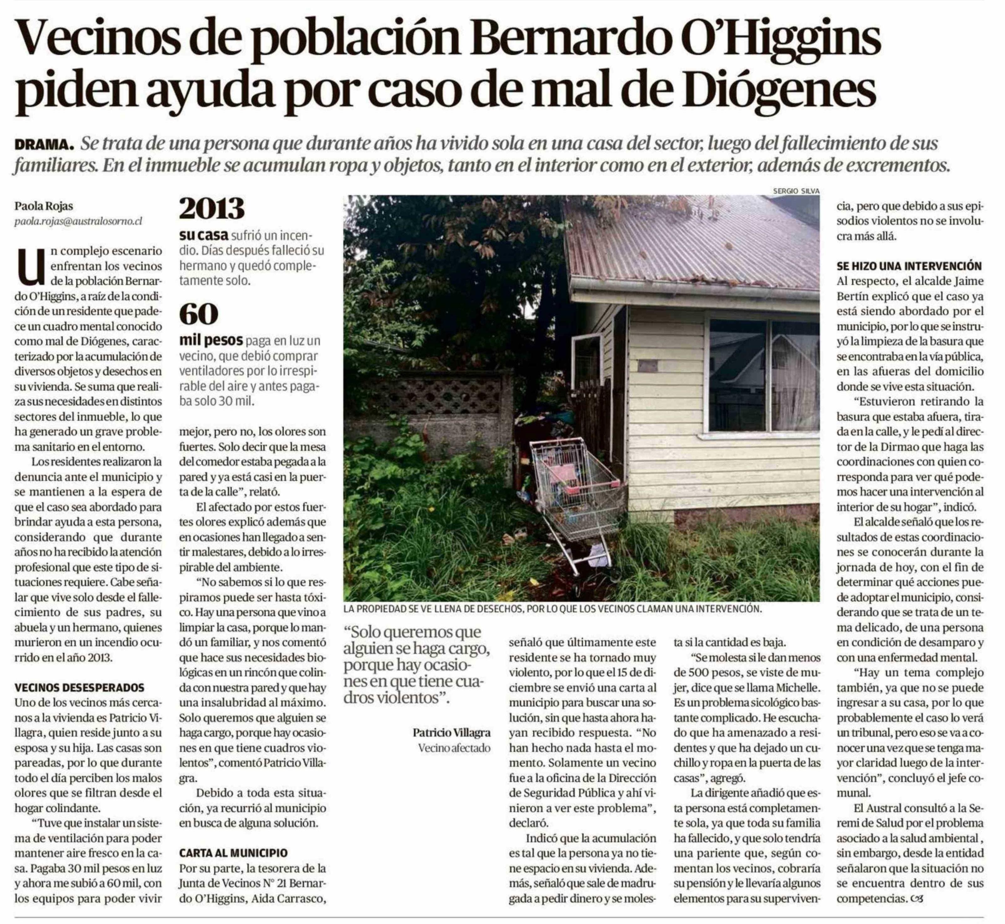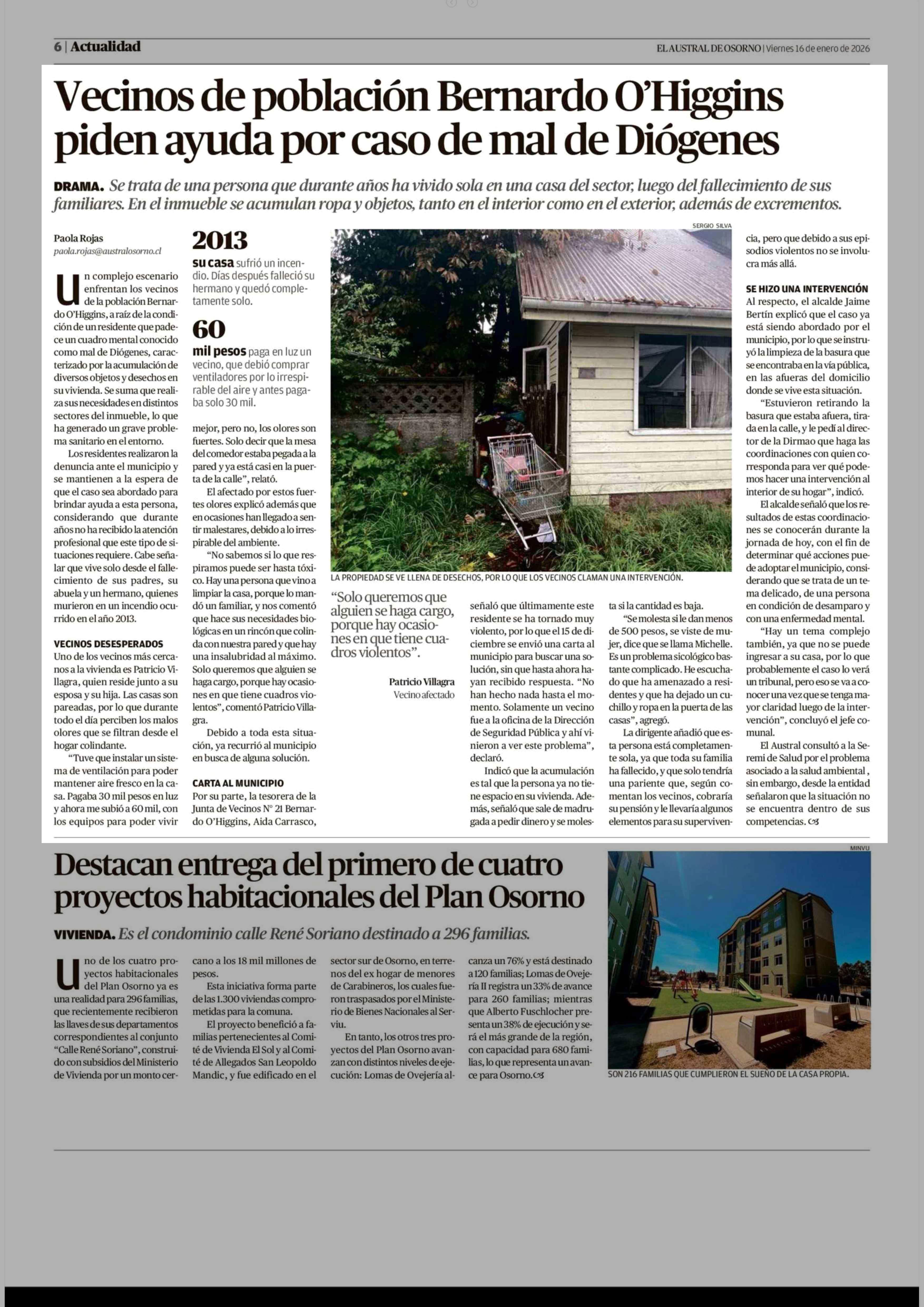 Vecinos de población Bernardo O'Higgins piden ayuda por caso de mal de Diógenes 16-01-2026 El Austral de Osorno |