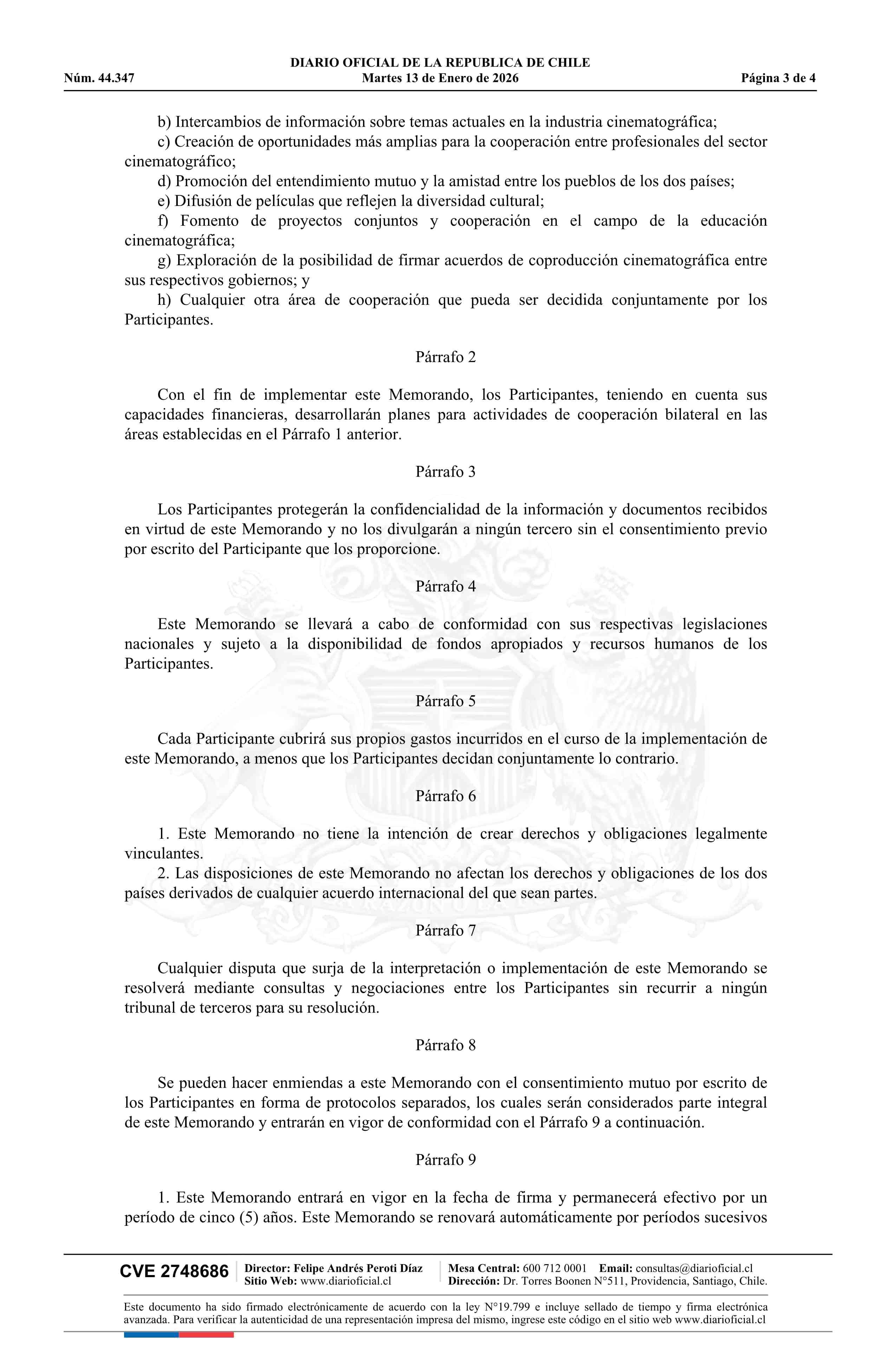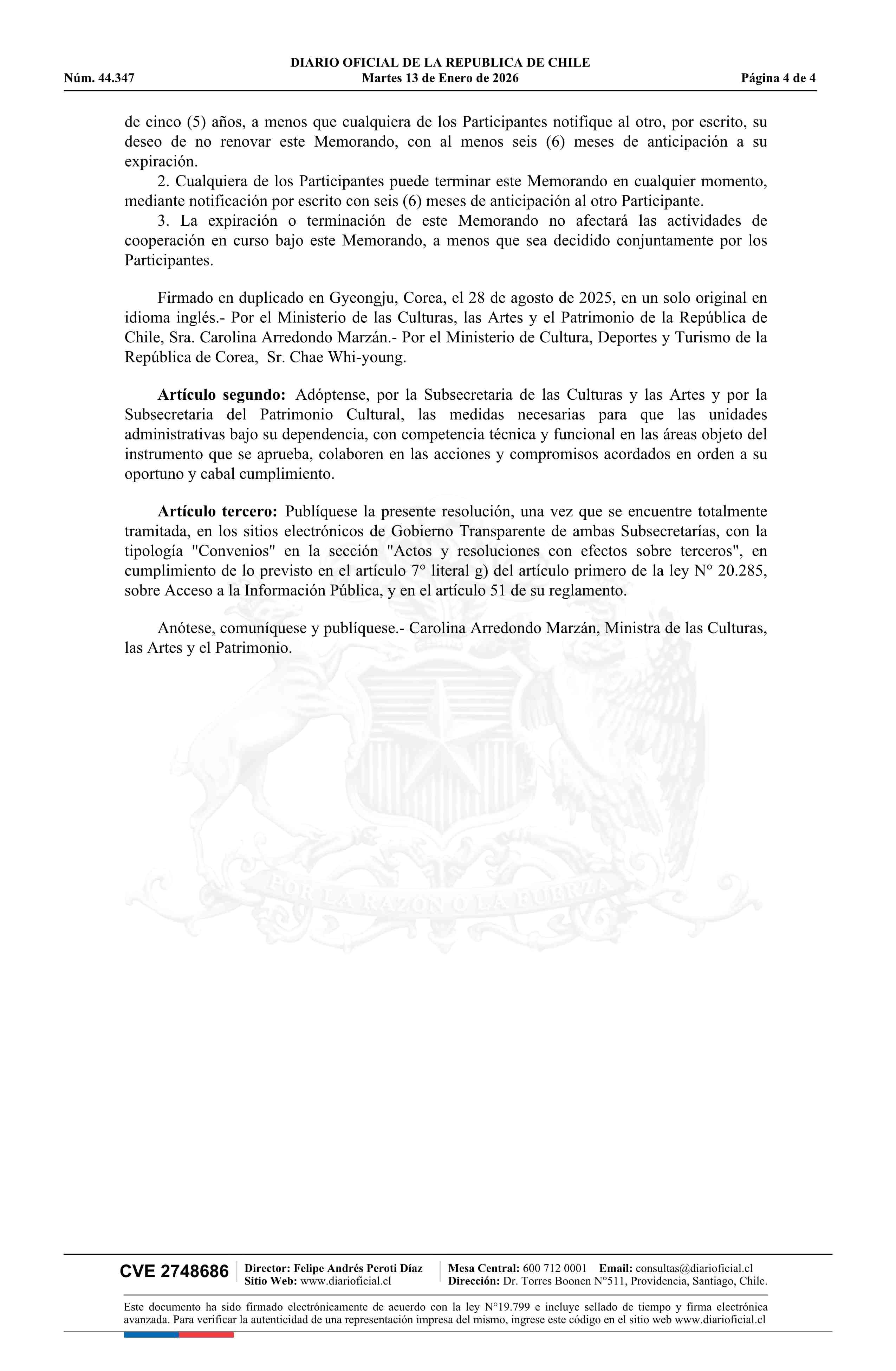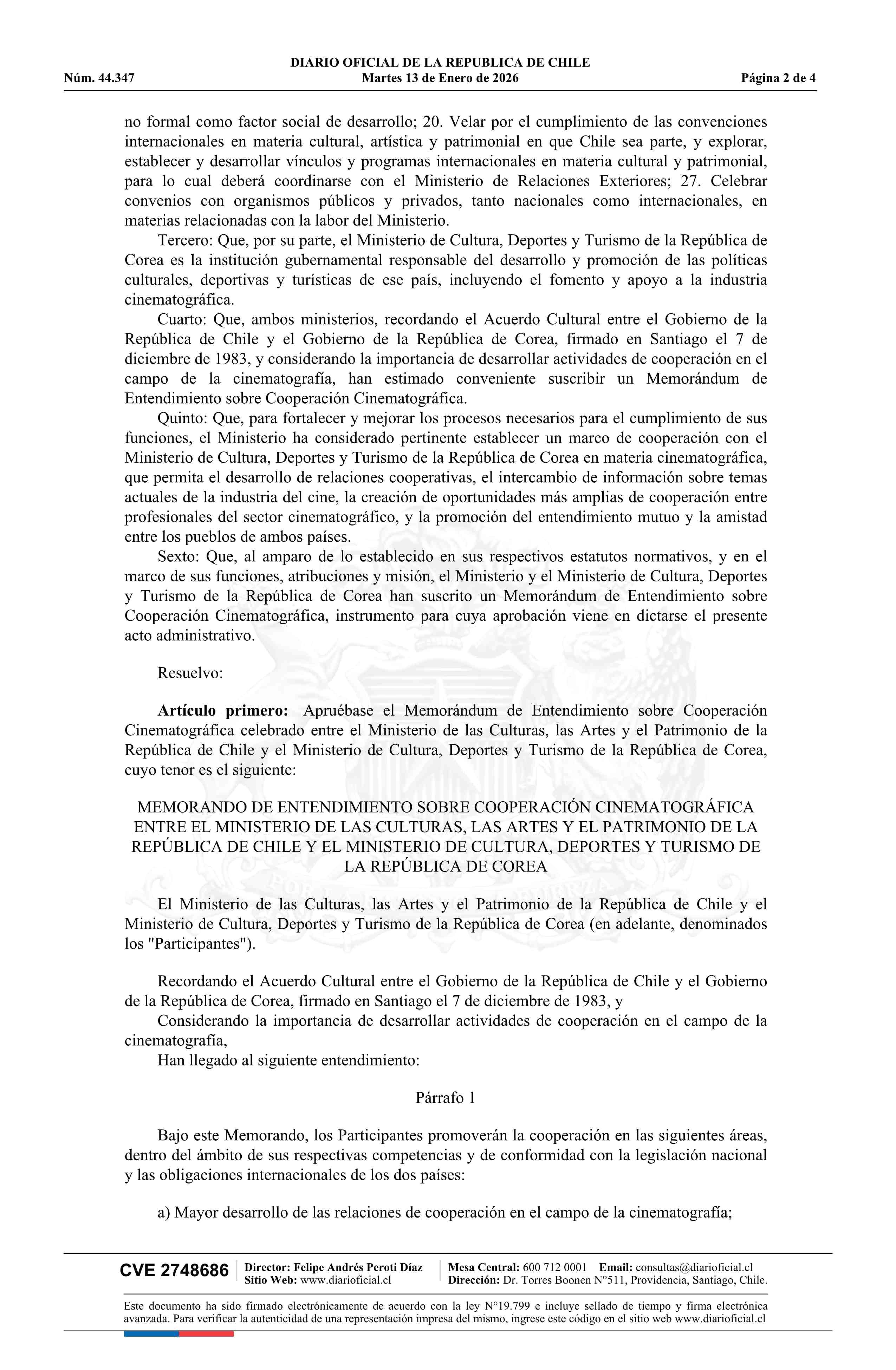| Título: | Resolución exenta número 23, de 2025.- Aprueba Memorando de Entendimiento sobre Cooperación Cinematográfica entre el Ministerio de las Culturas, las Artes y el Patrimonio de la República de Chile y el Ministerio de Cultura, Deportes y Turismo de la República de Corea |