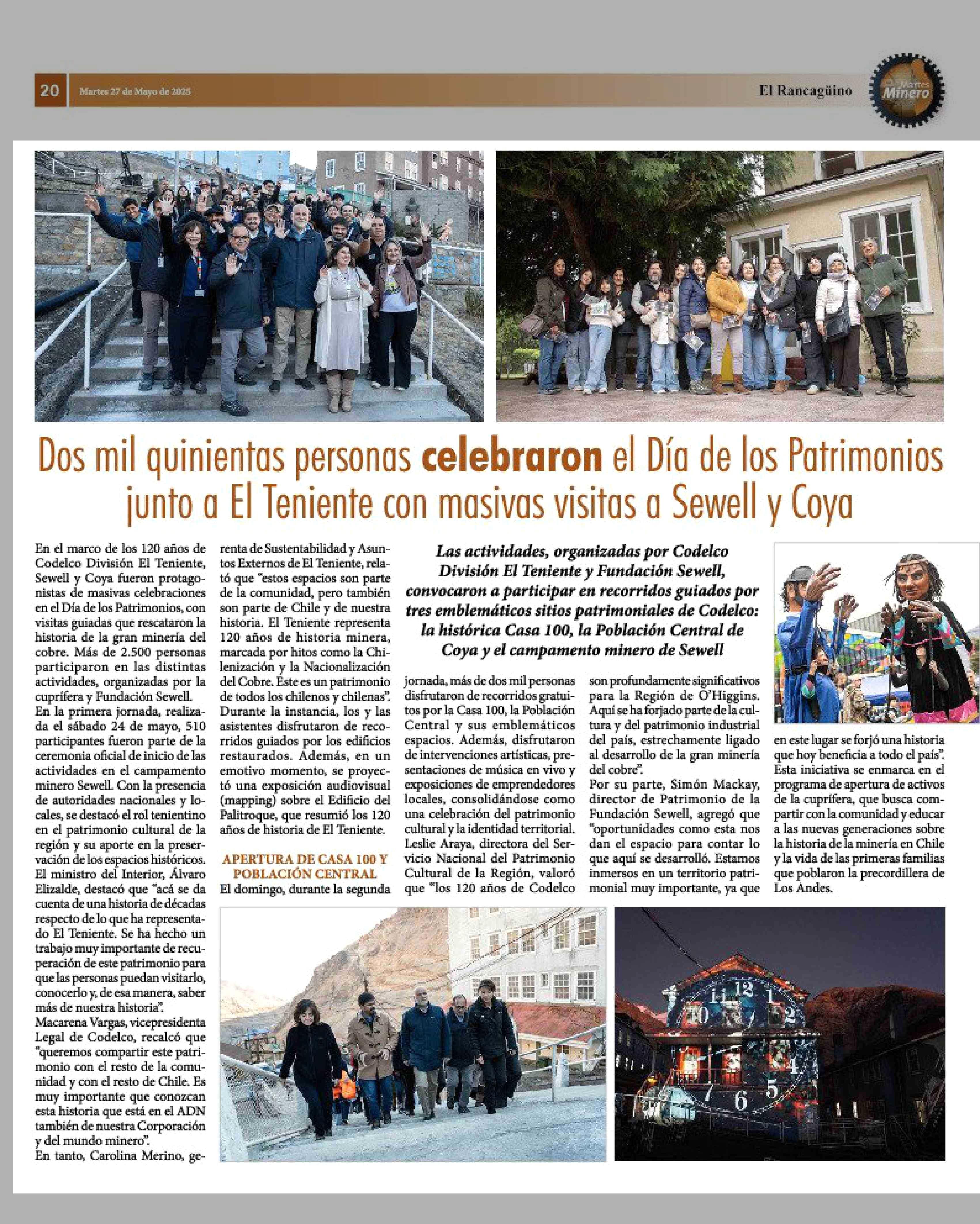 Dos mil quinientas personas celebraron el Día de los Patrimonios junto a El Teniente con masivas visitas a Sewell y Coya 27-05-2025 El Rancagüino |