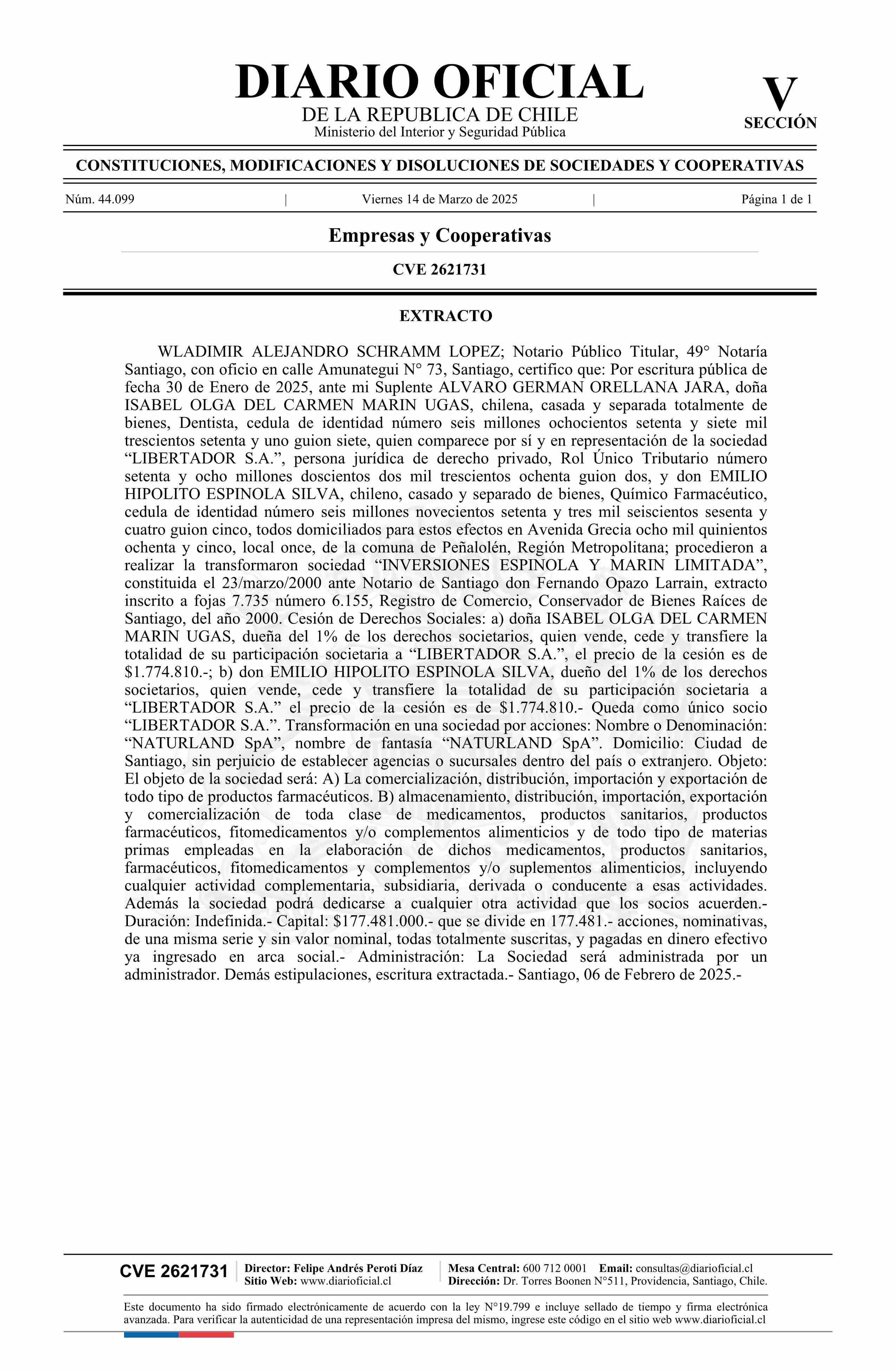 INVERSIONES ESPINOLA Y MARIN LIMITADA 76.179.560-0 14-03-2025 Diario Oficial Edición Electrónica |