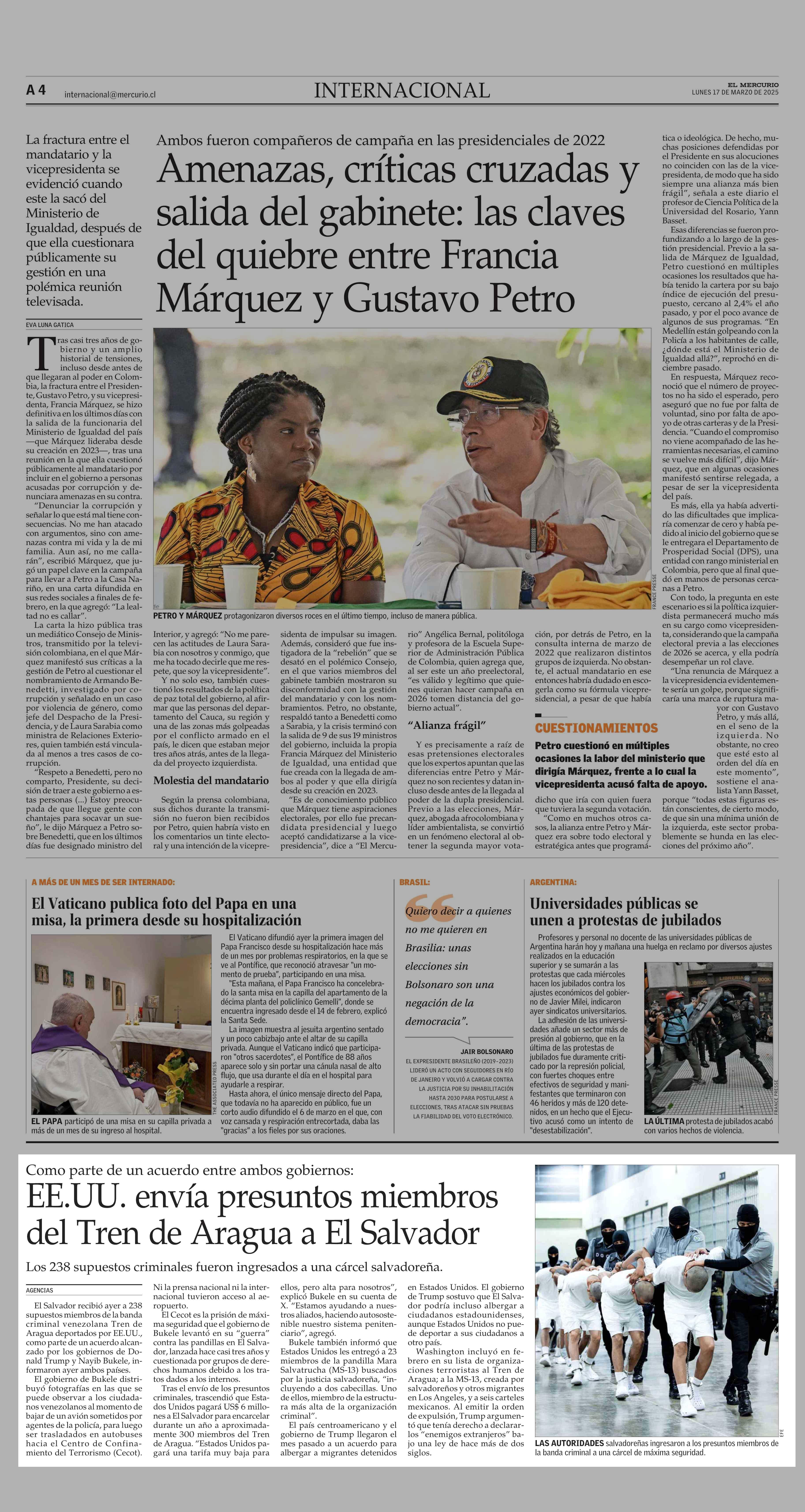 EE.UU. envía presuntos miembros del Tren de Aragua a El Salvador 17-03-2025 El Mercurio |