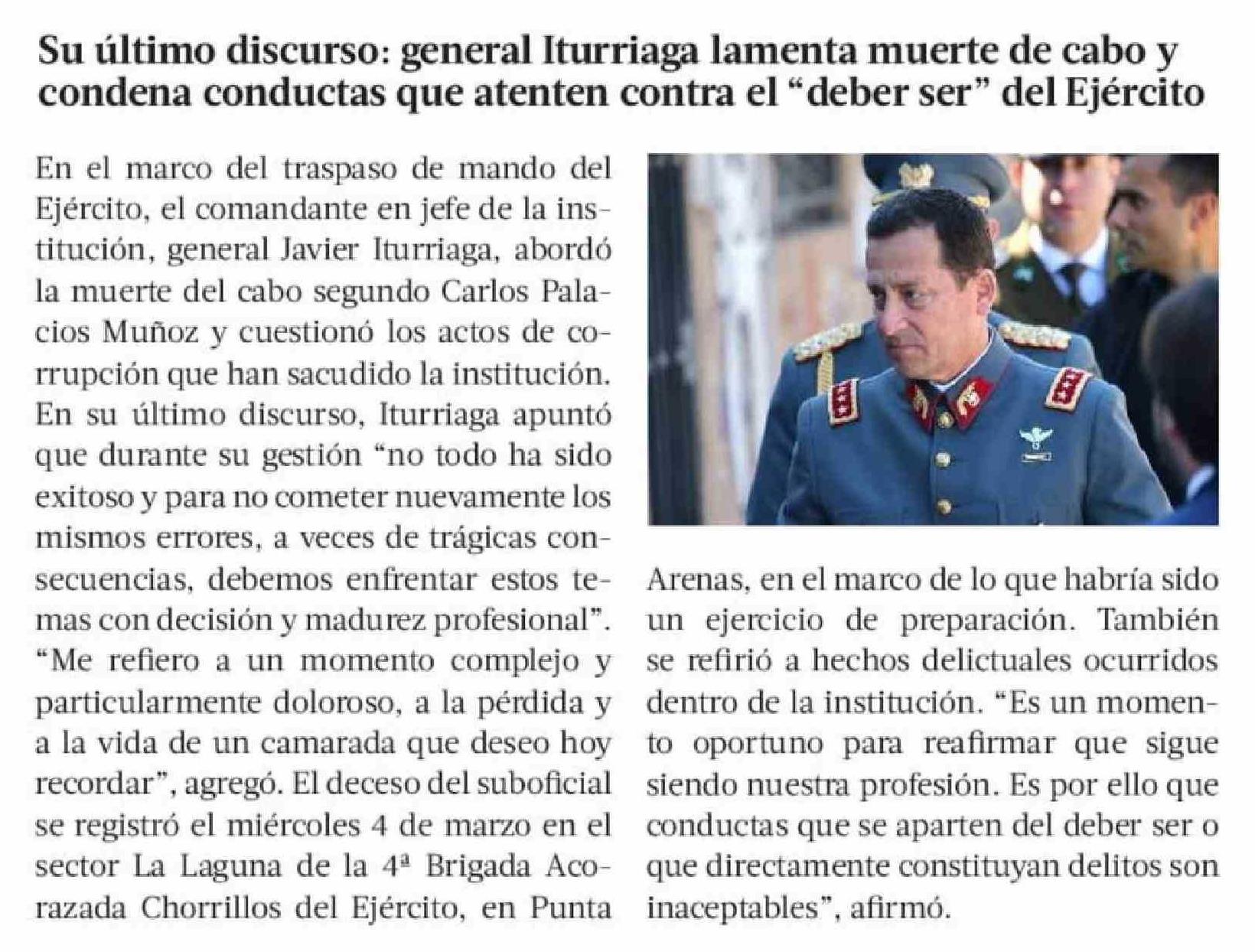 Su último discurso: general Iturriaga lamenta muerte de cabo y condena conductas que atenten contra el "deber ser" del Ejército 10-03-2026 La Tercera |