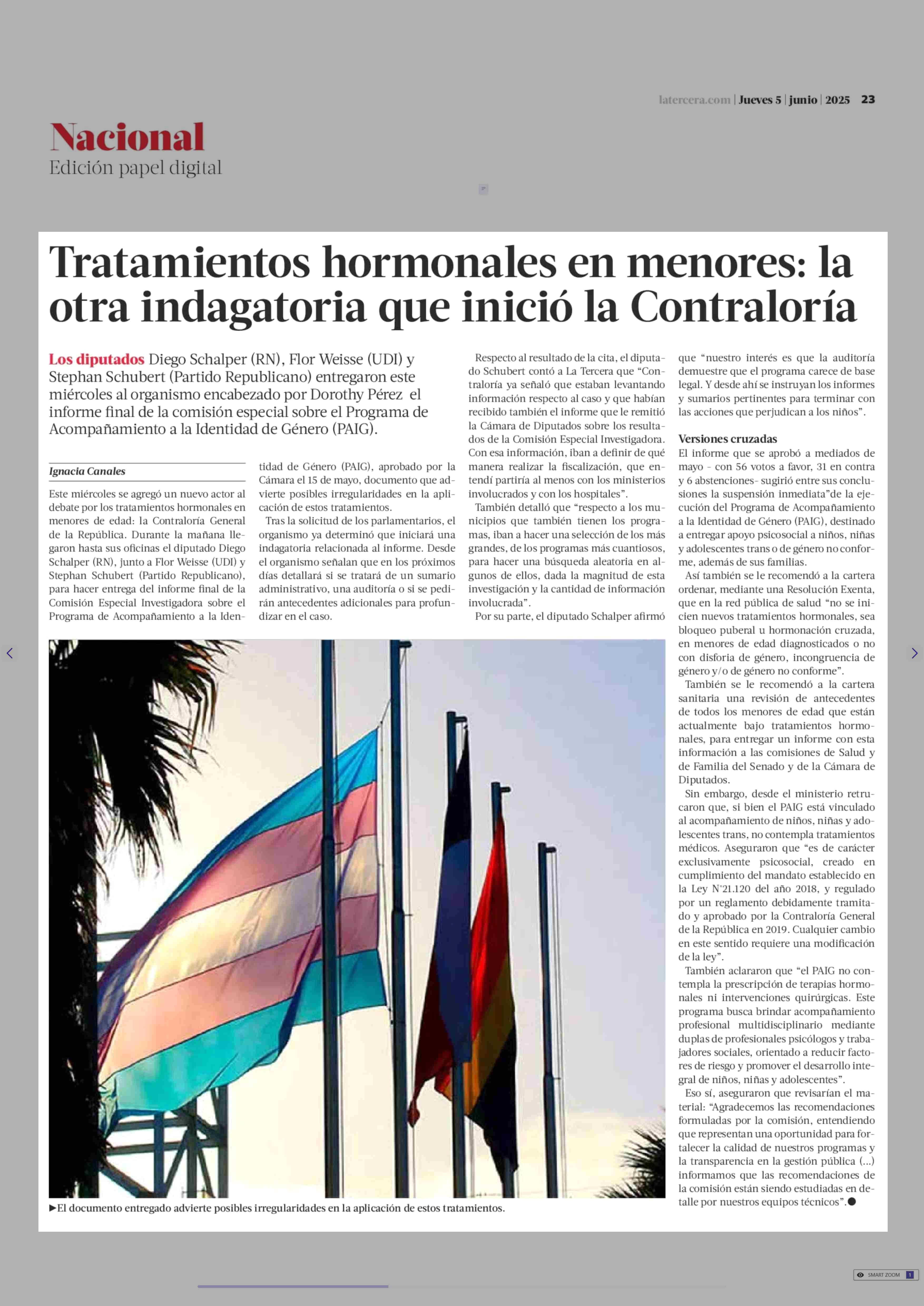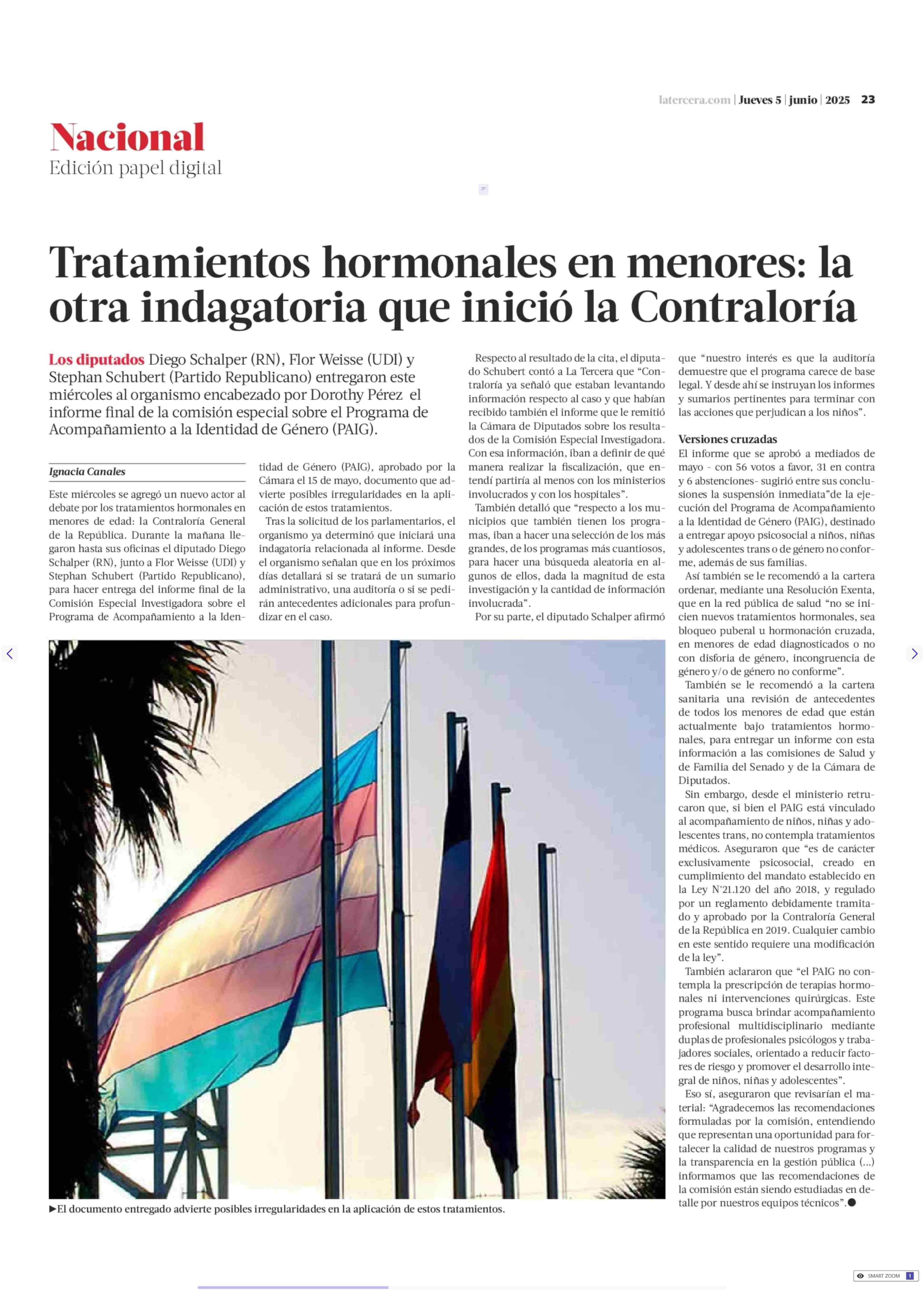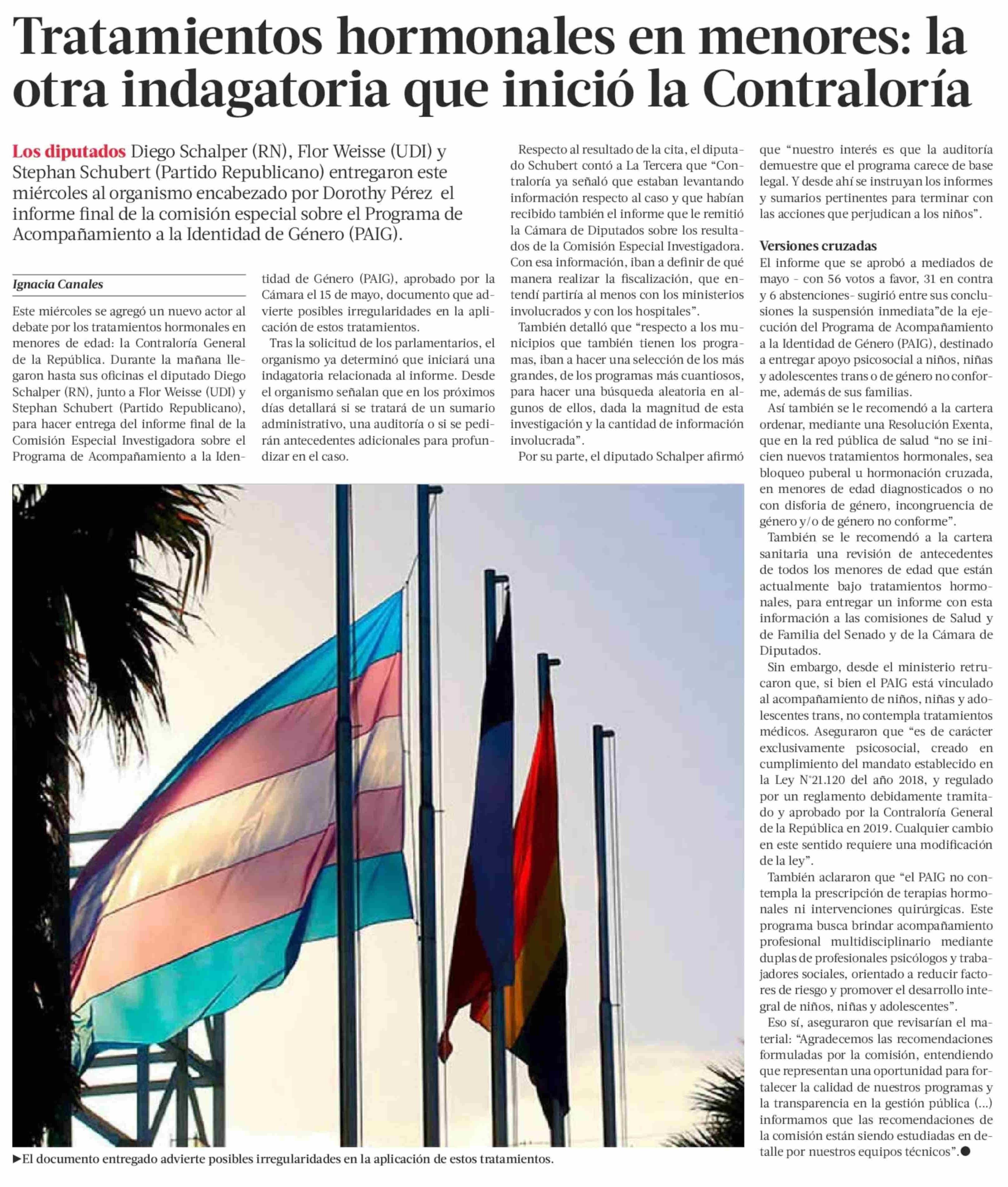 Tratamientos hormonales en menores: la otra indagatoria que inició la Contraloría 05-06-2025 La Tercera |