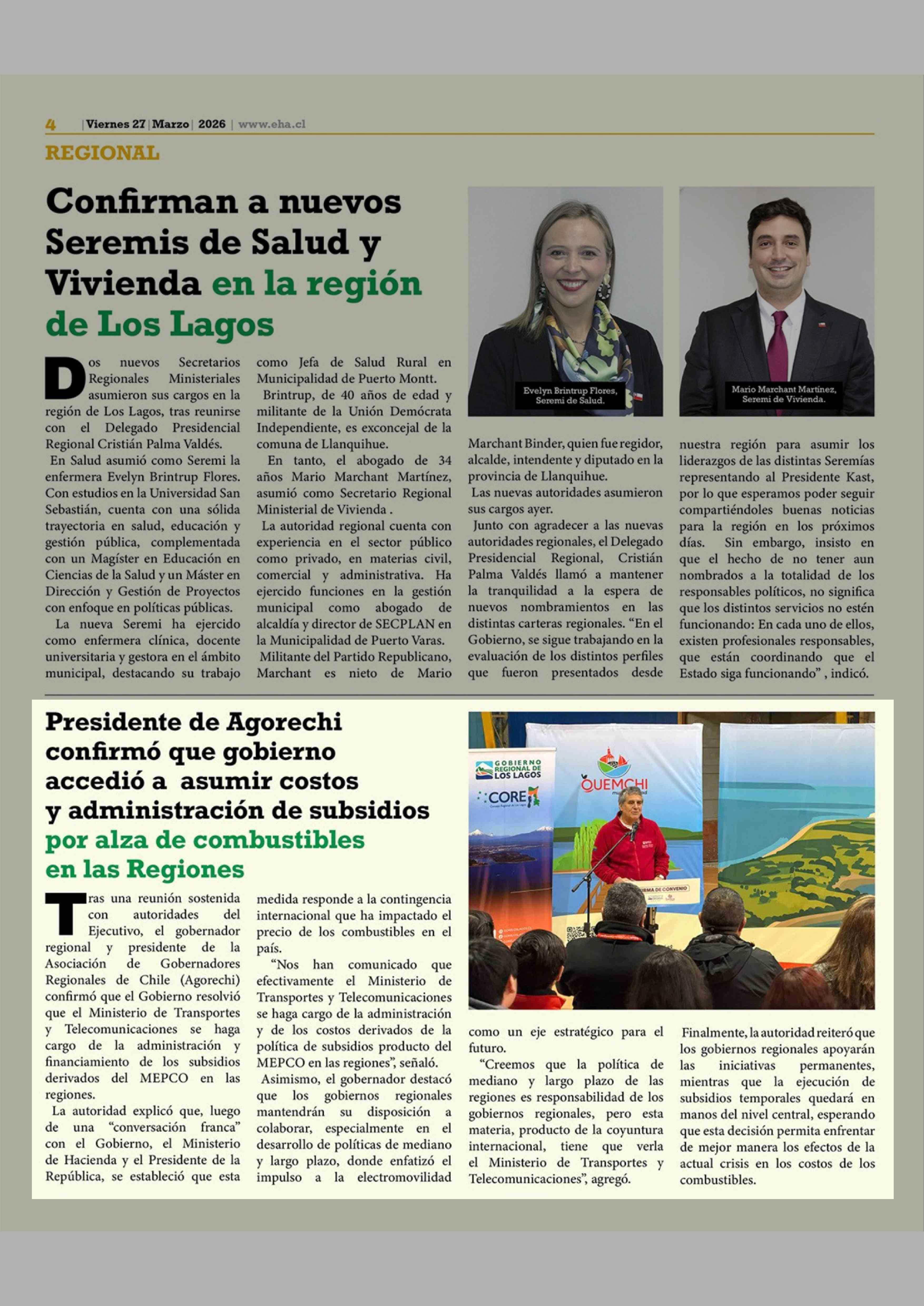 Presidente de Agorechi confirmó que gobierno accedió a asumir costos y administración de subsidios por alza de combustibles en las Regiones 27-03-2026 El Heraldo Austral |