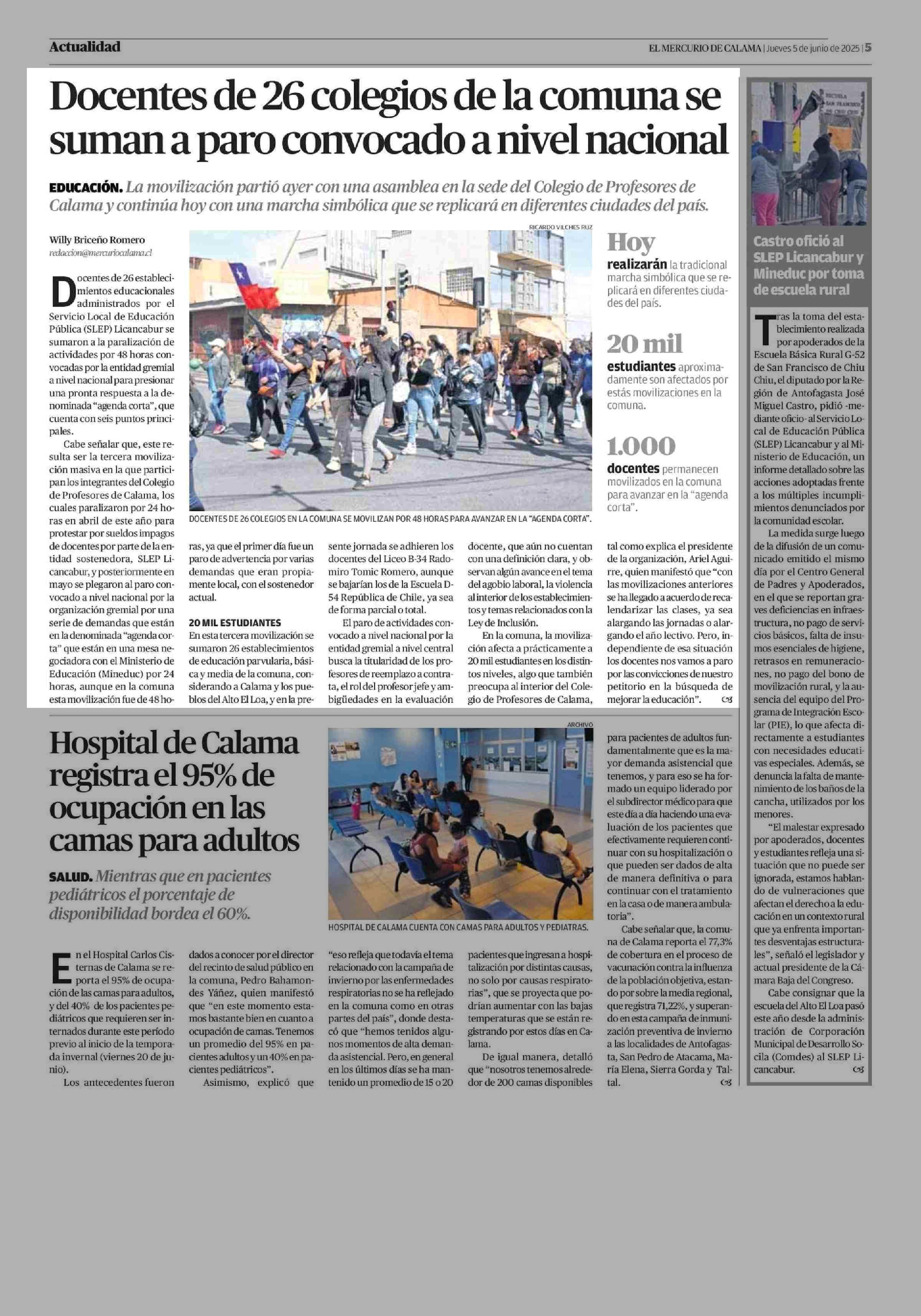 Docentes de 26 colegios de la comuna se suman a paro convocado a nivel nacional 05-06-2025 El Mercurio de Calama |